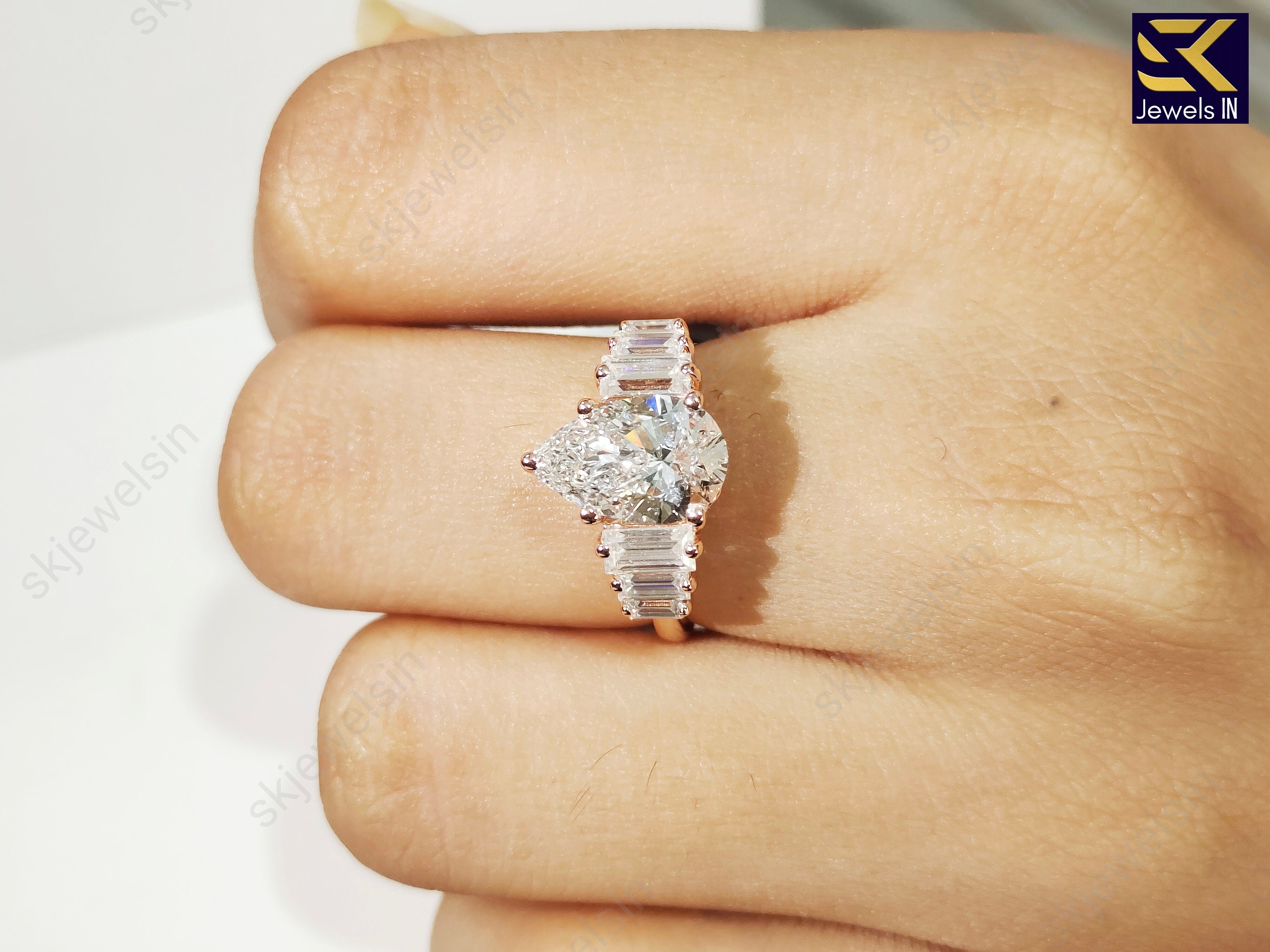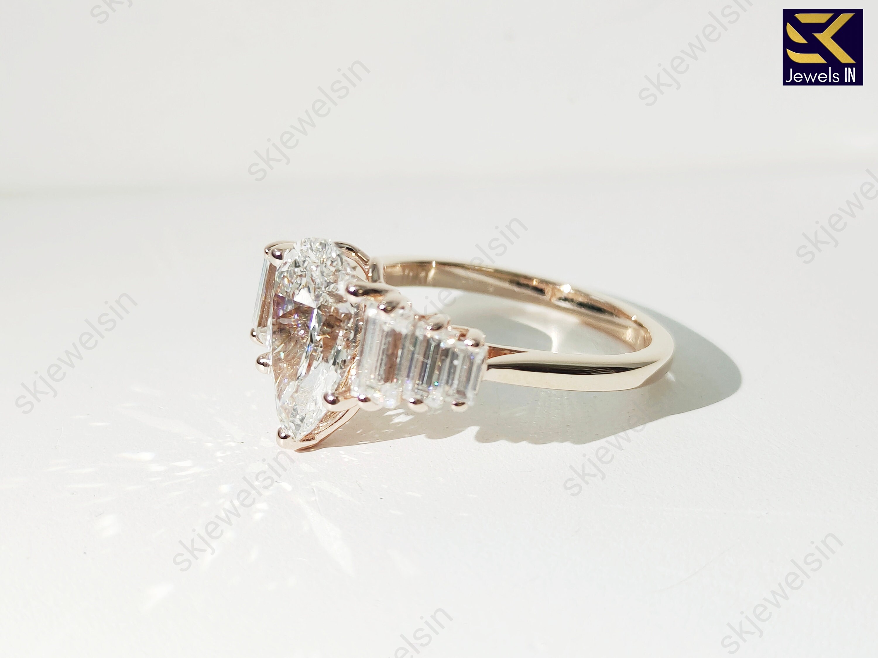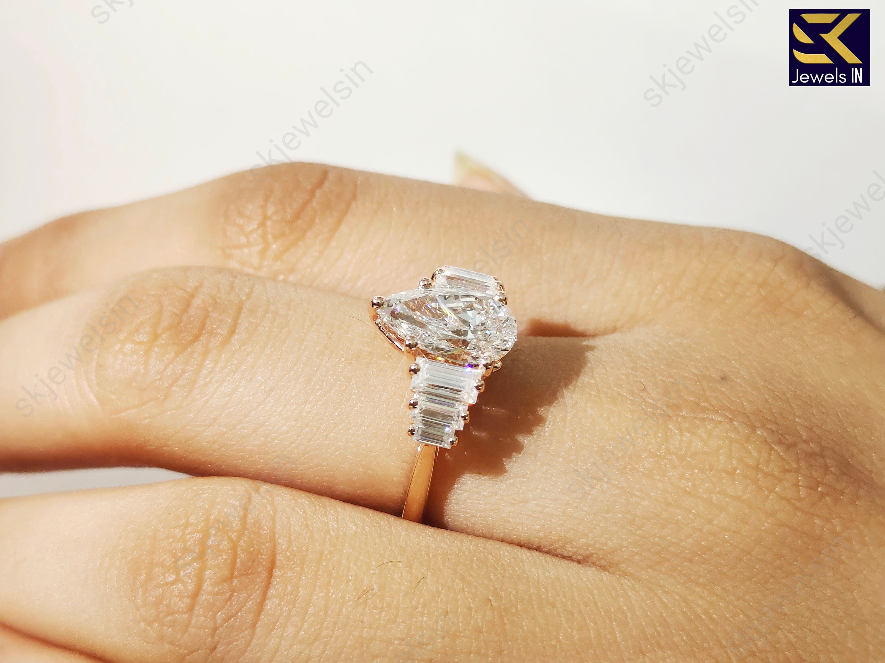Capture her heart forever with this breathtaking Pear Cut Engagement Ring. This design perfectly blends modern brilliance with vintage Art Deco charm. The centerpiece is a dazzling Teardrop (Pear) cut stone, flanked by a series of graduated vertical Baguette cut stones that create a "hall of mirrors" effect, drawing the eye straight to the center.