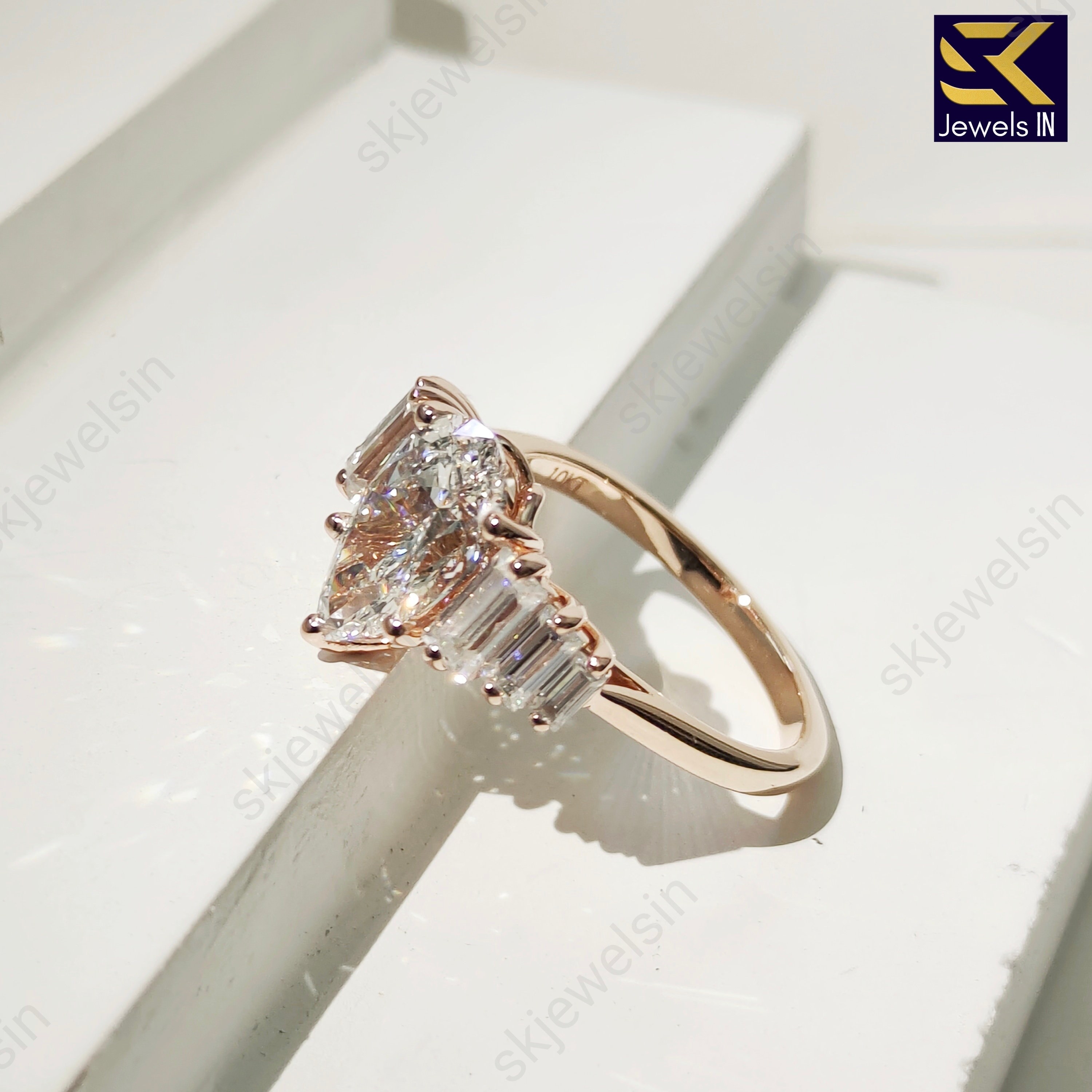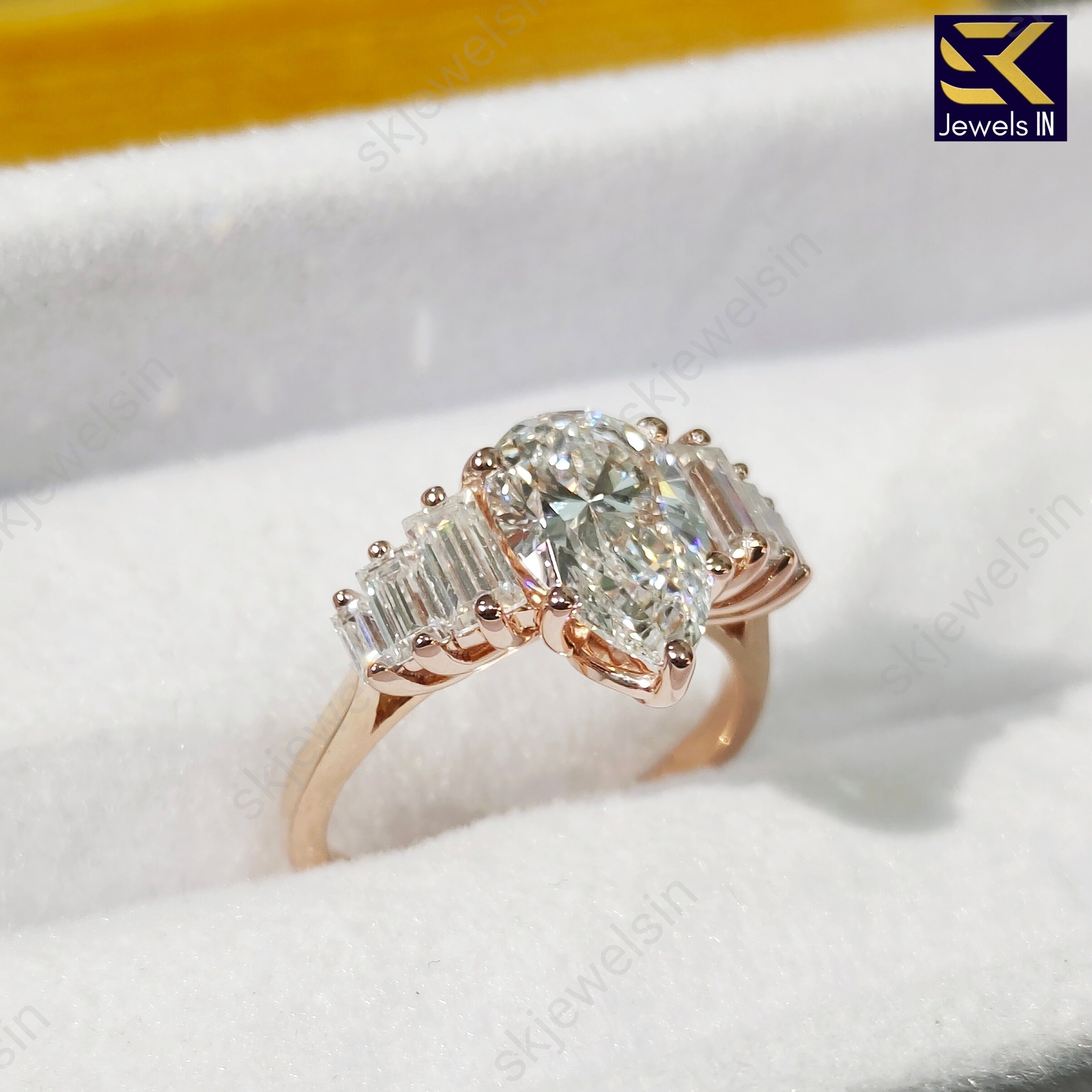 Pear Cut Moissanite Engagement Ring with Tapered Baguettes, 14K Rose Gold Vintage Style Ring, Unique Bridal Jewelry for Her
