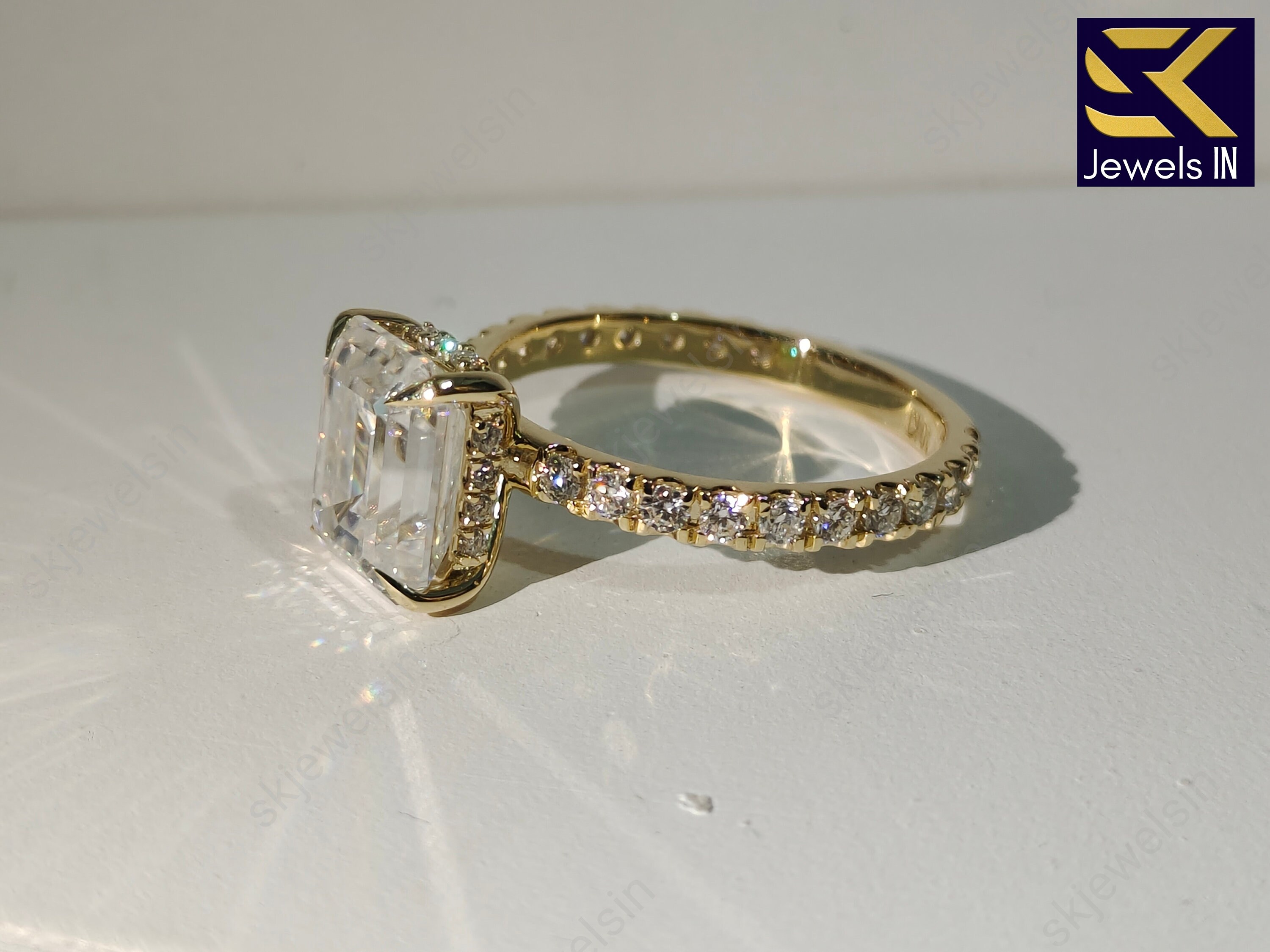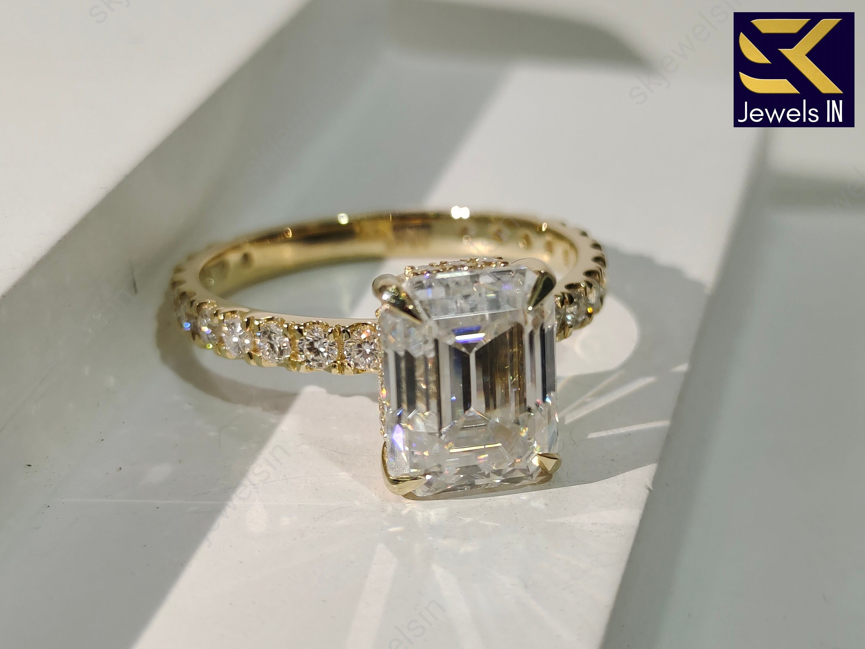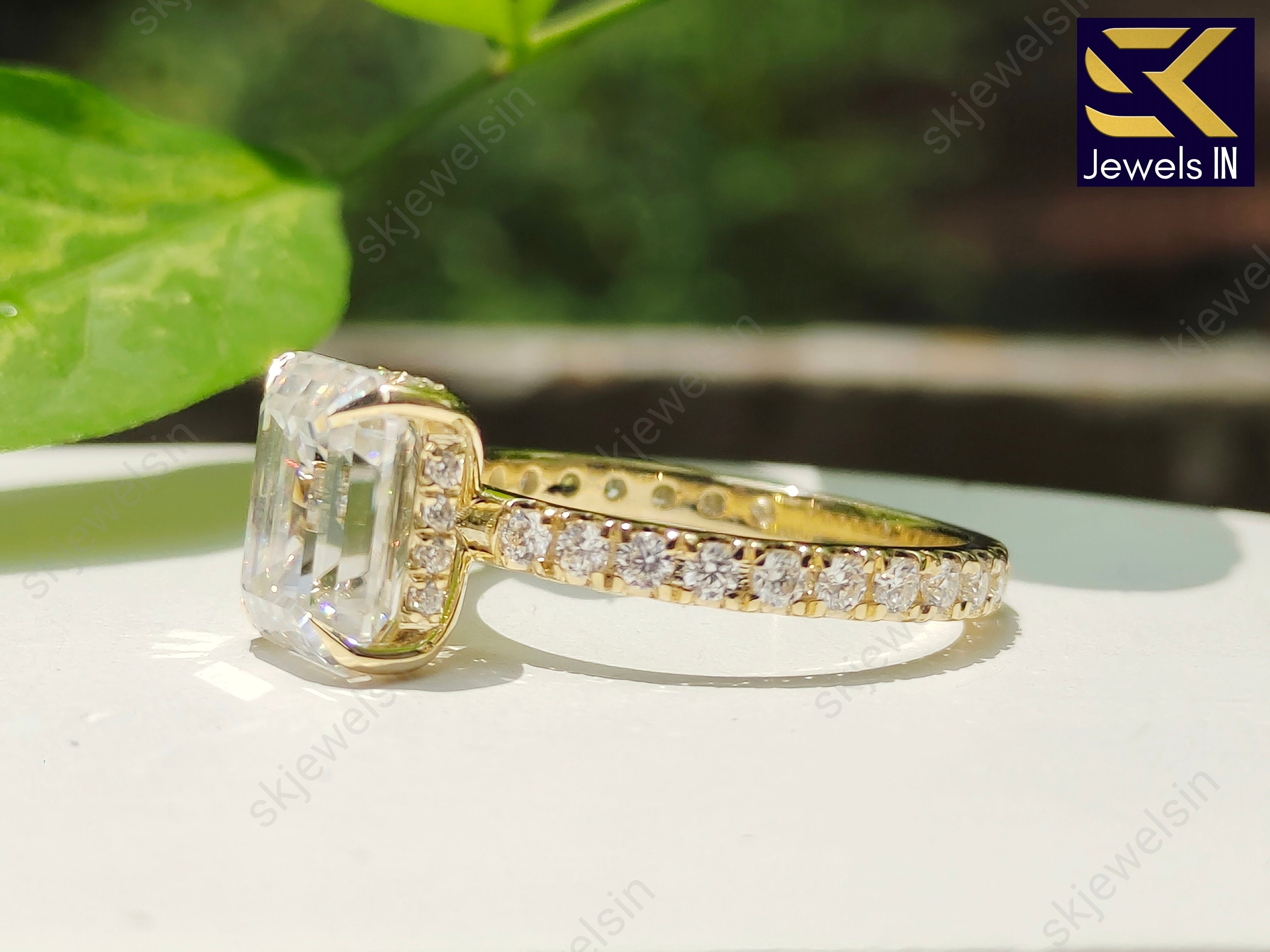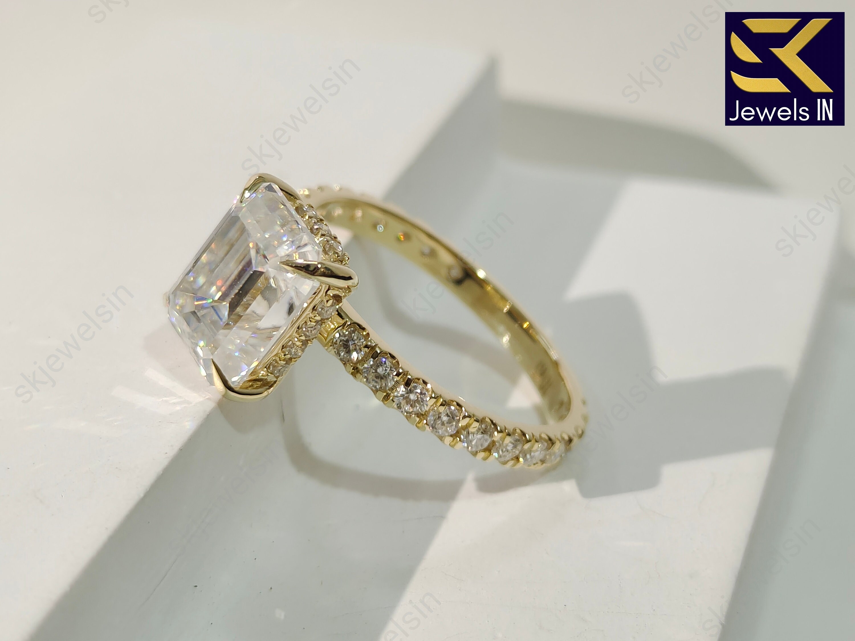 This stunning emerald-cut moissanite ring features a precision-cut center stone surrounded by a sparkling halo of natural or lab-grown diamonds (your choice). Set in luxurious 14K white, yellow, or rose gold, this ring is perfect for engagements, anniversaries, or as a statement piece.
