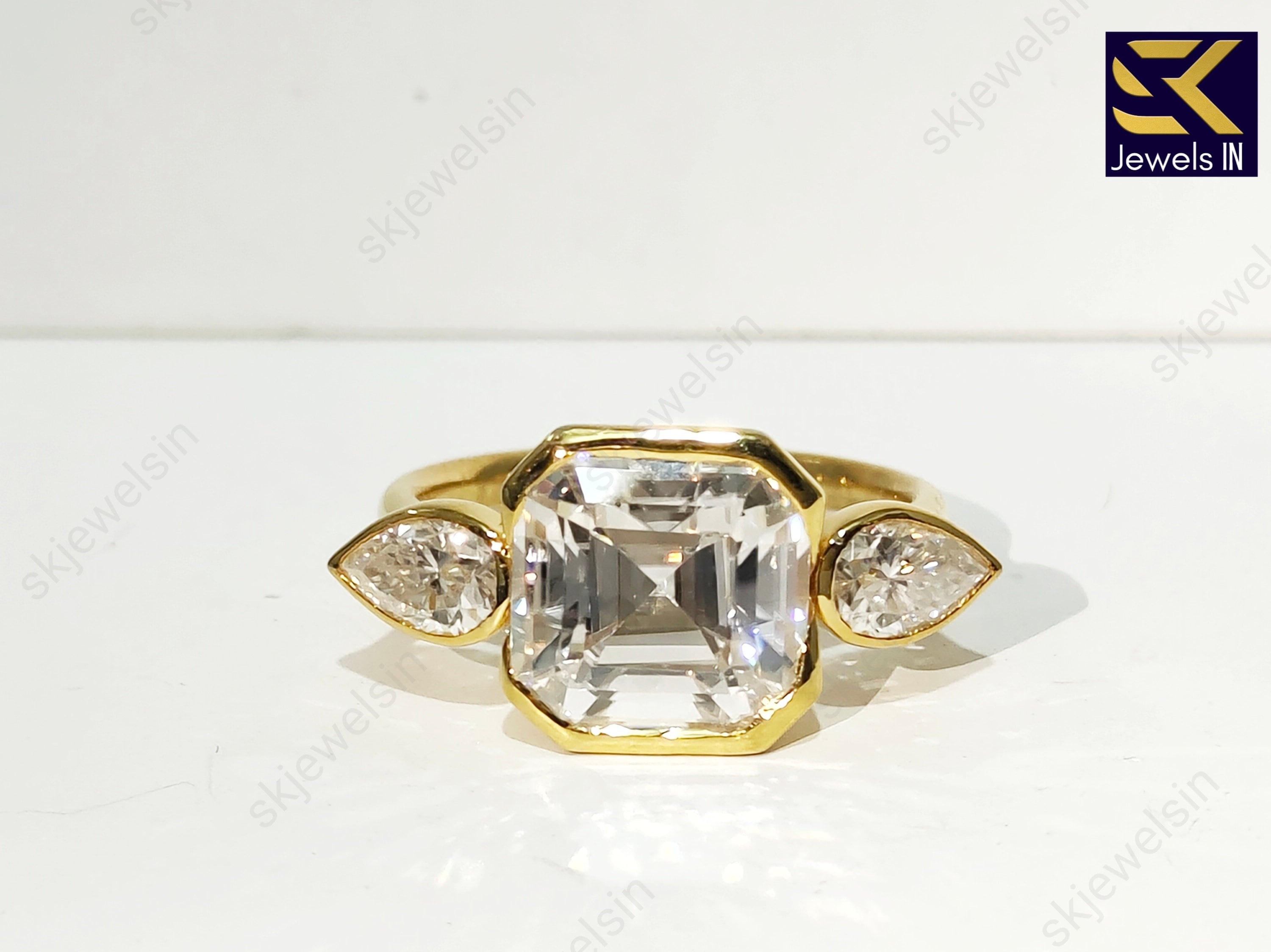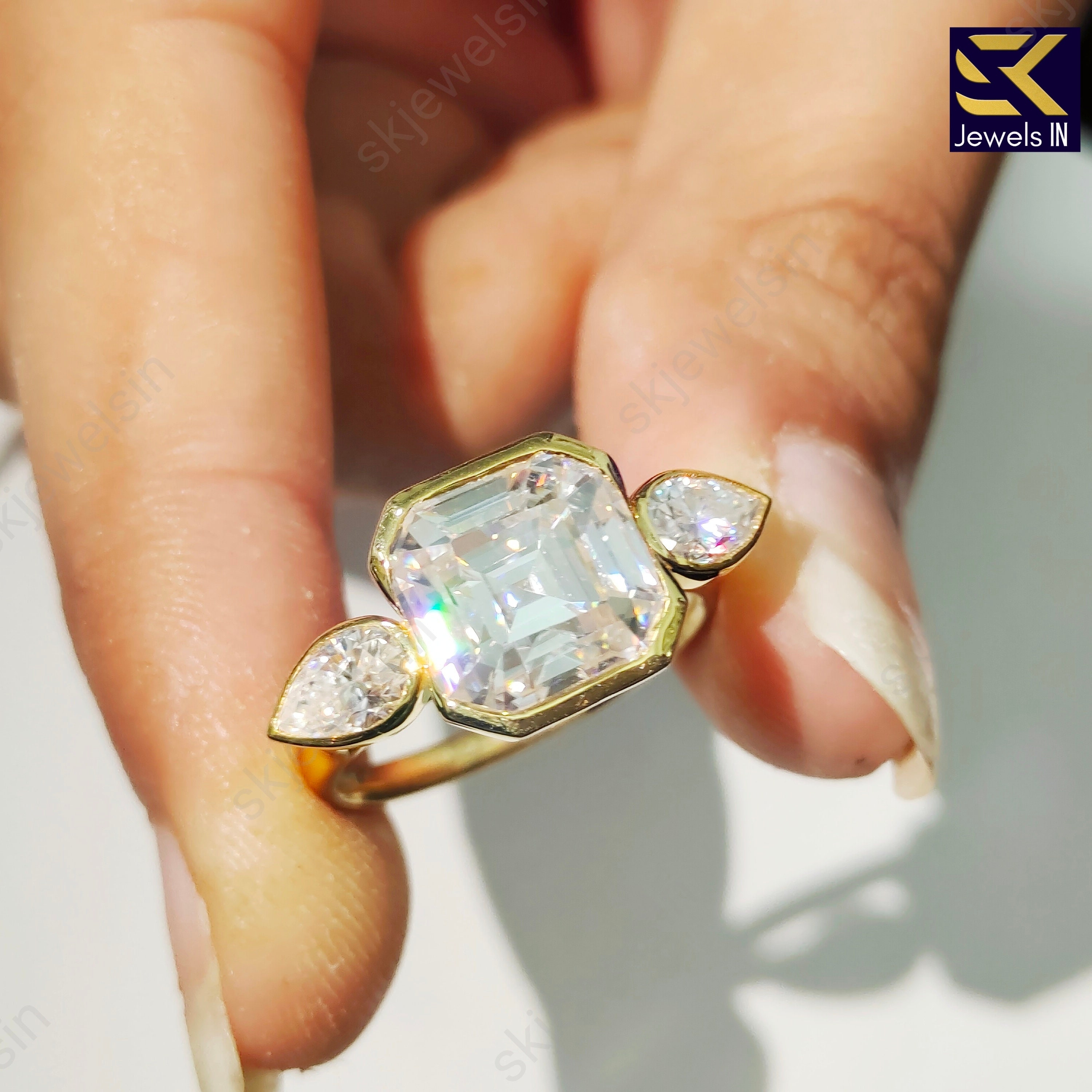 14K Gold Asscher Cut Moissanite Engagement Ring, Half bezel set Wedding & Anniversary Ring, Three stone Promise Ring, Gift For Her