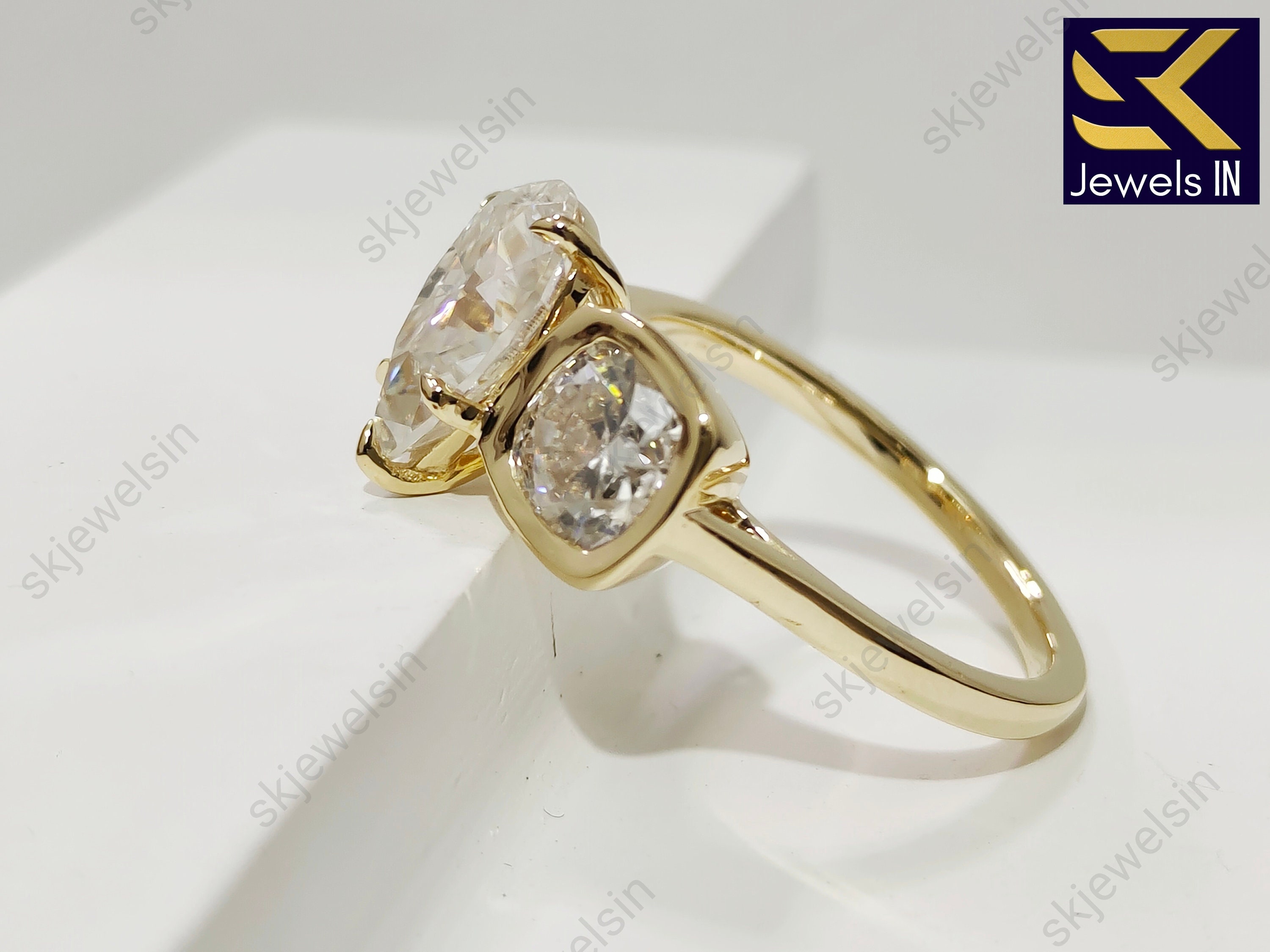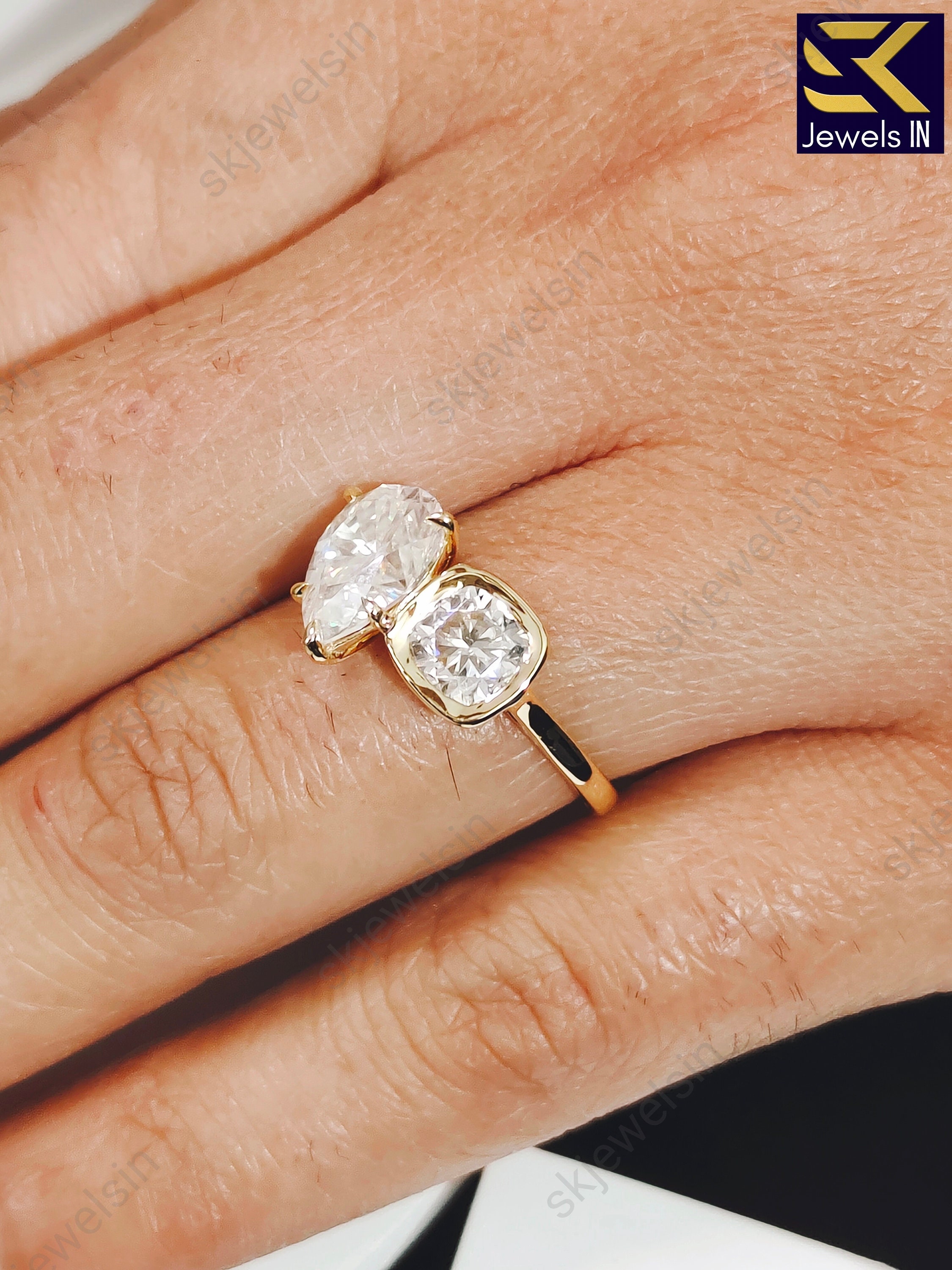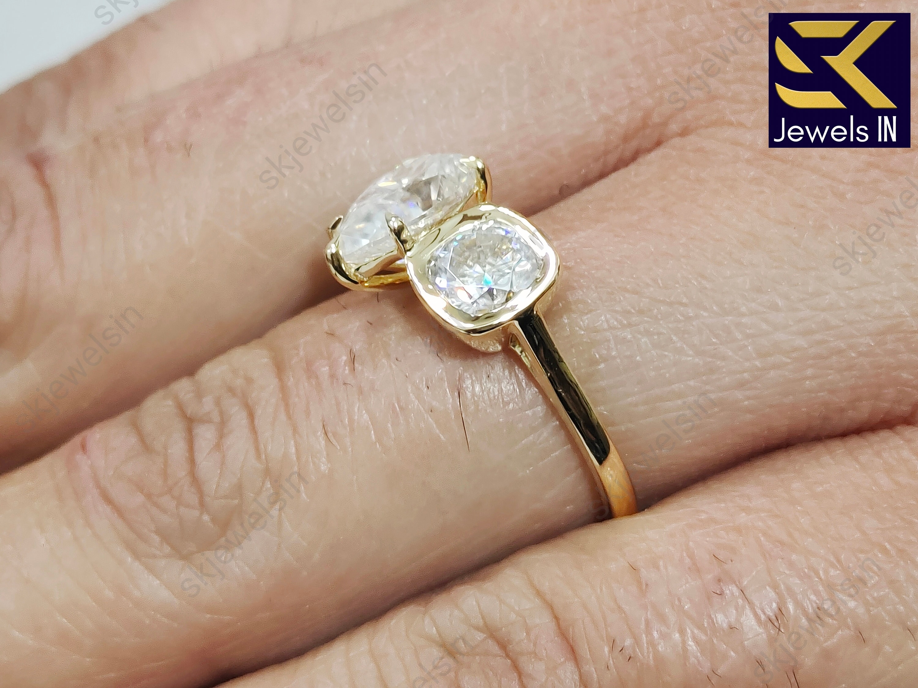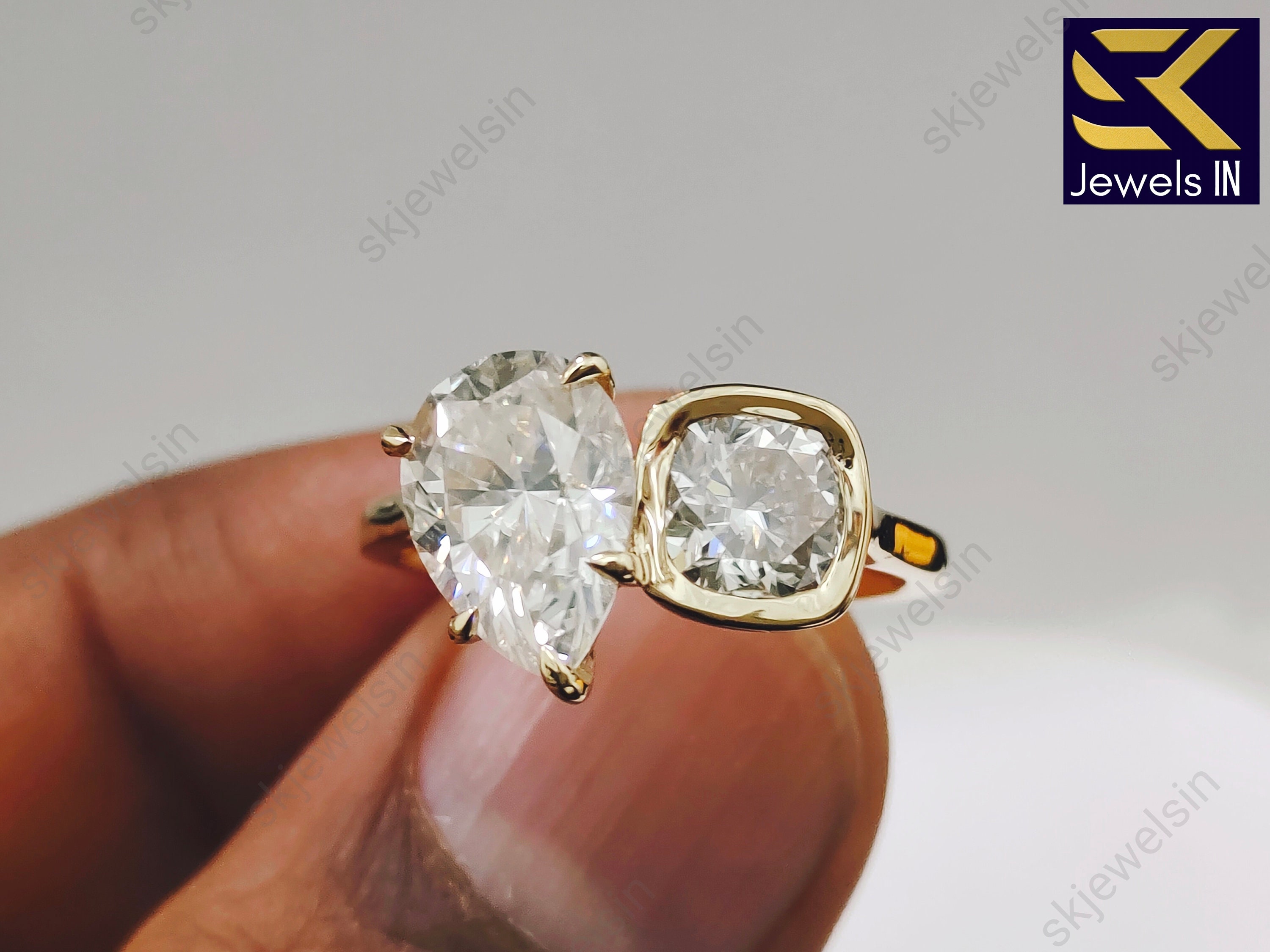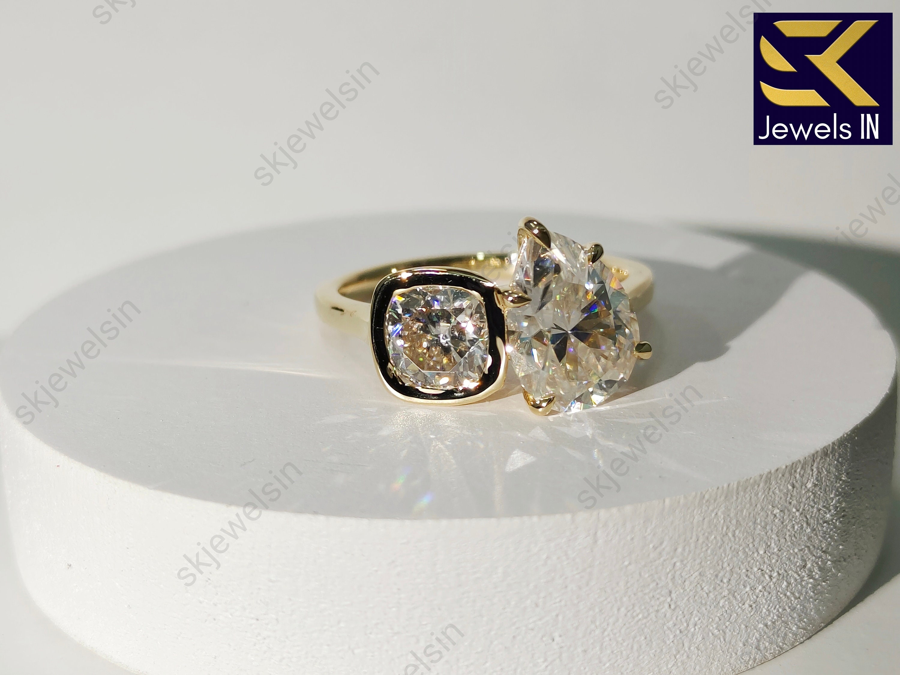 Bezel set Toi et Moi Engagement Ring, 14K Gold Pear & Cushion Moissanite Wedding Ring, Vintage Promise Ring, Ring For Women