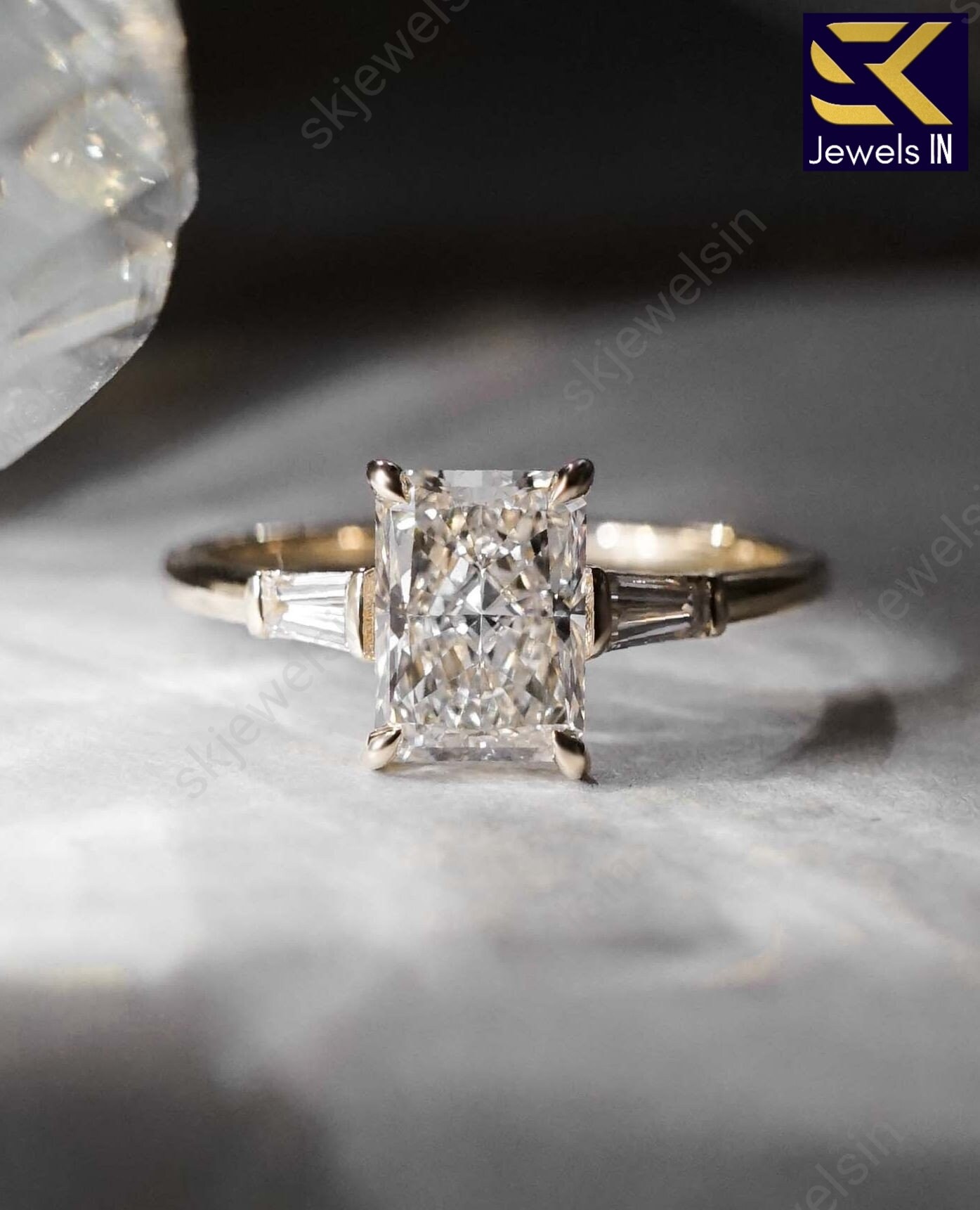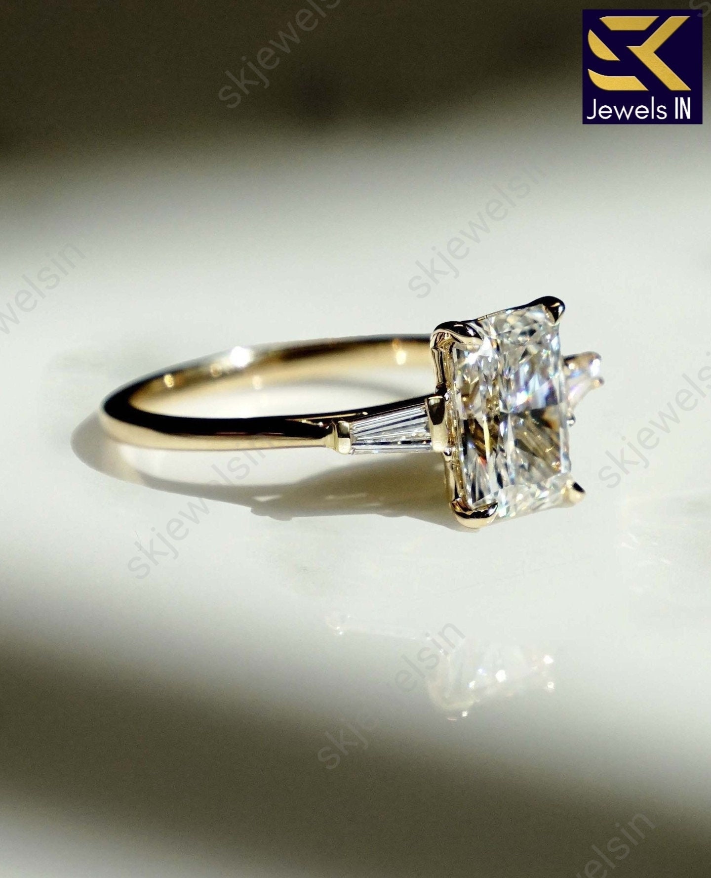 Radiant Cut Moissanite Engagement Ring, Tapered Baguette Side Stones, Three Stone Trilogy Ring, 14K Gold Wedding Ring, A Anniversary Gift