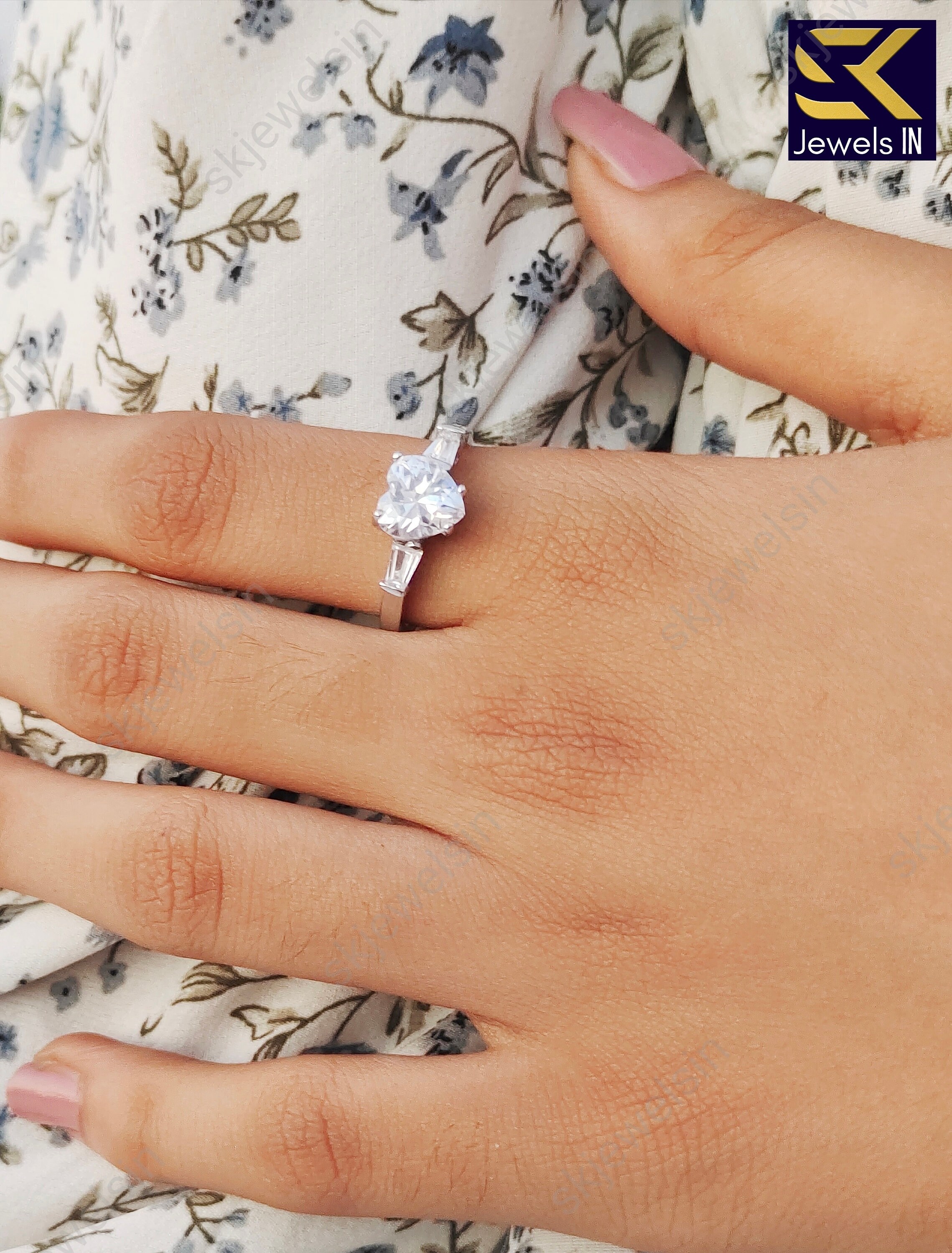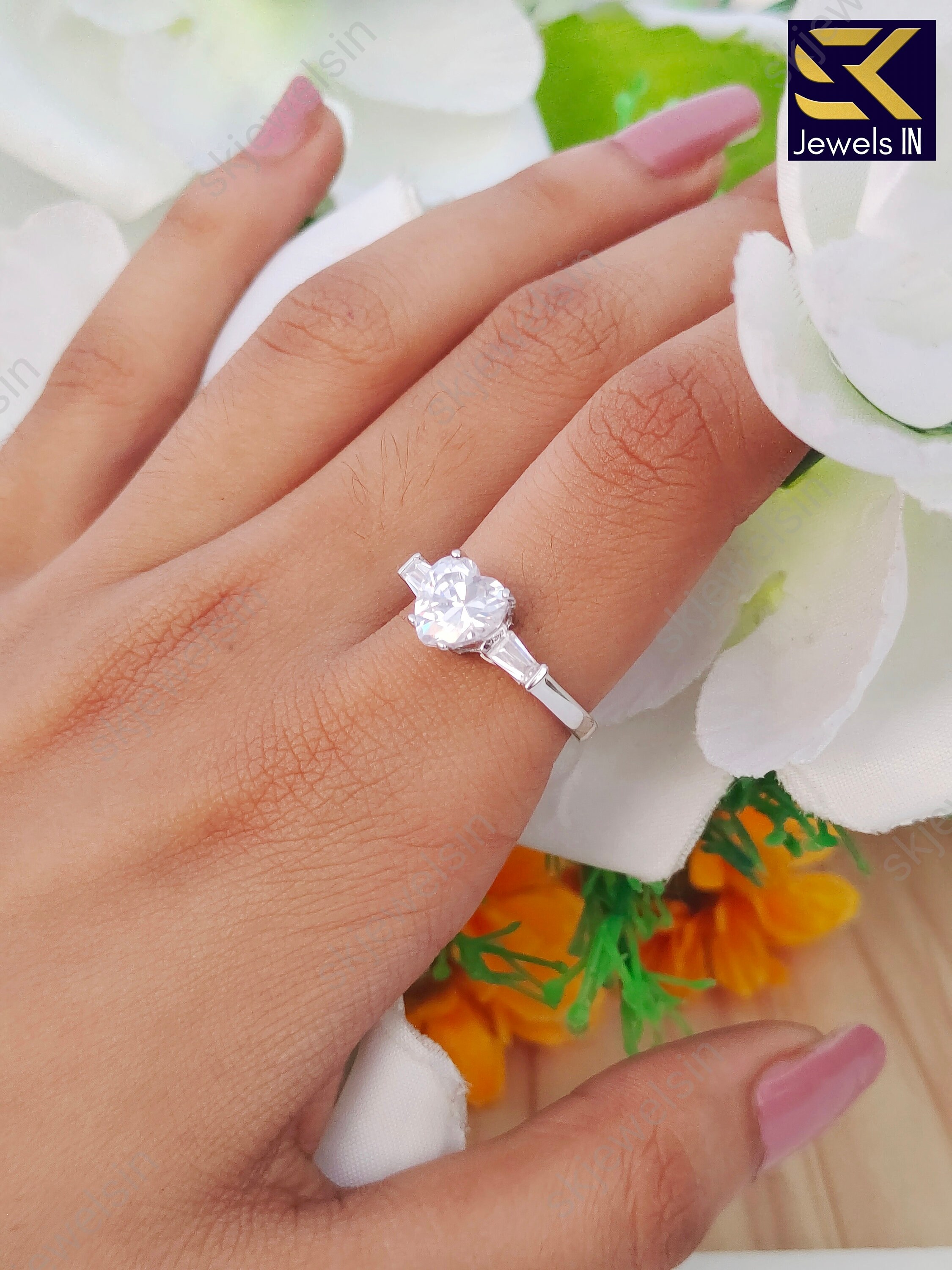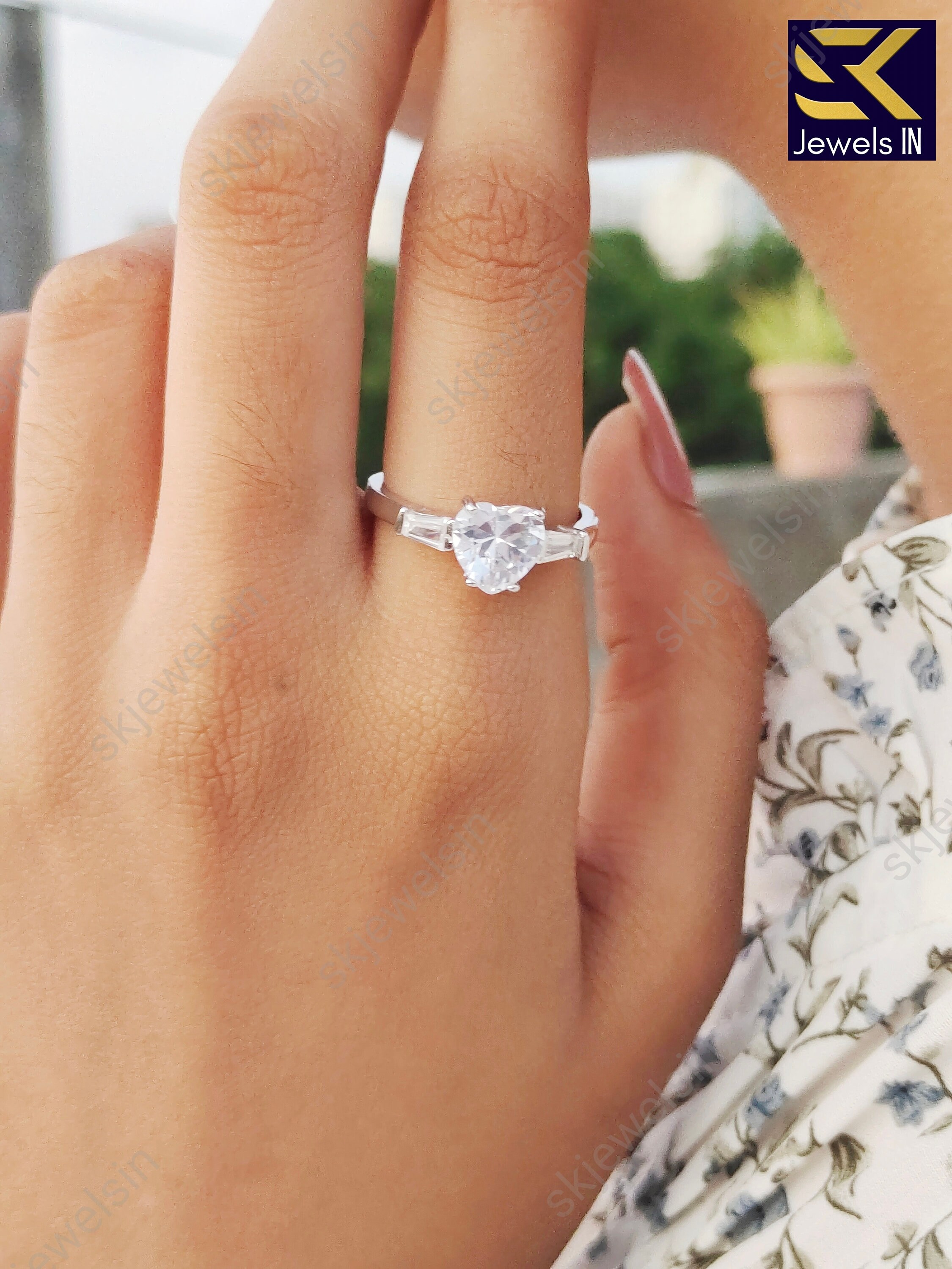 Heart Cut Moissanite Engagement Ring, 14K White Gold Three Stone Wedding Ring, Side Baguette Ring, Promise Ring For Women, Gifts for her