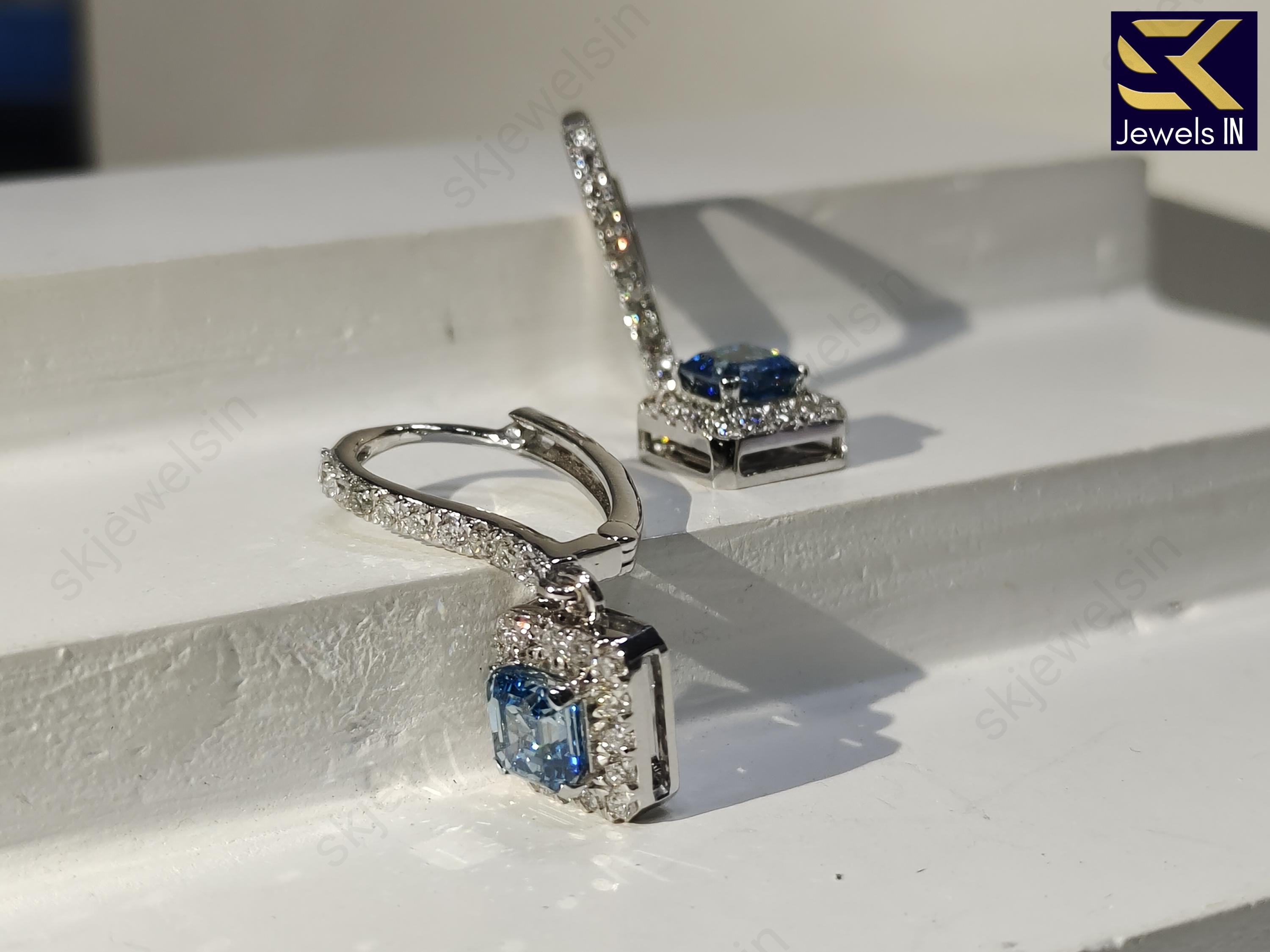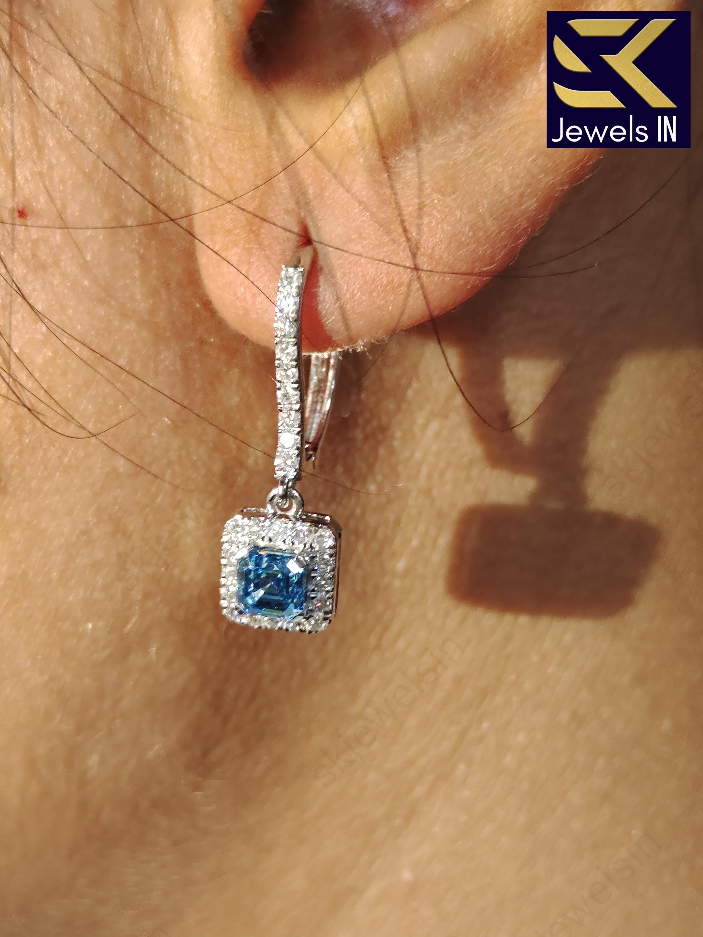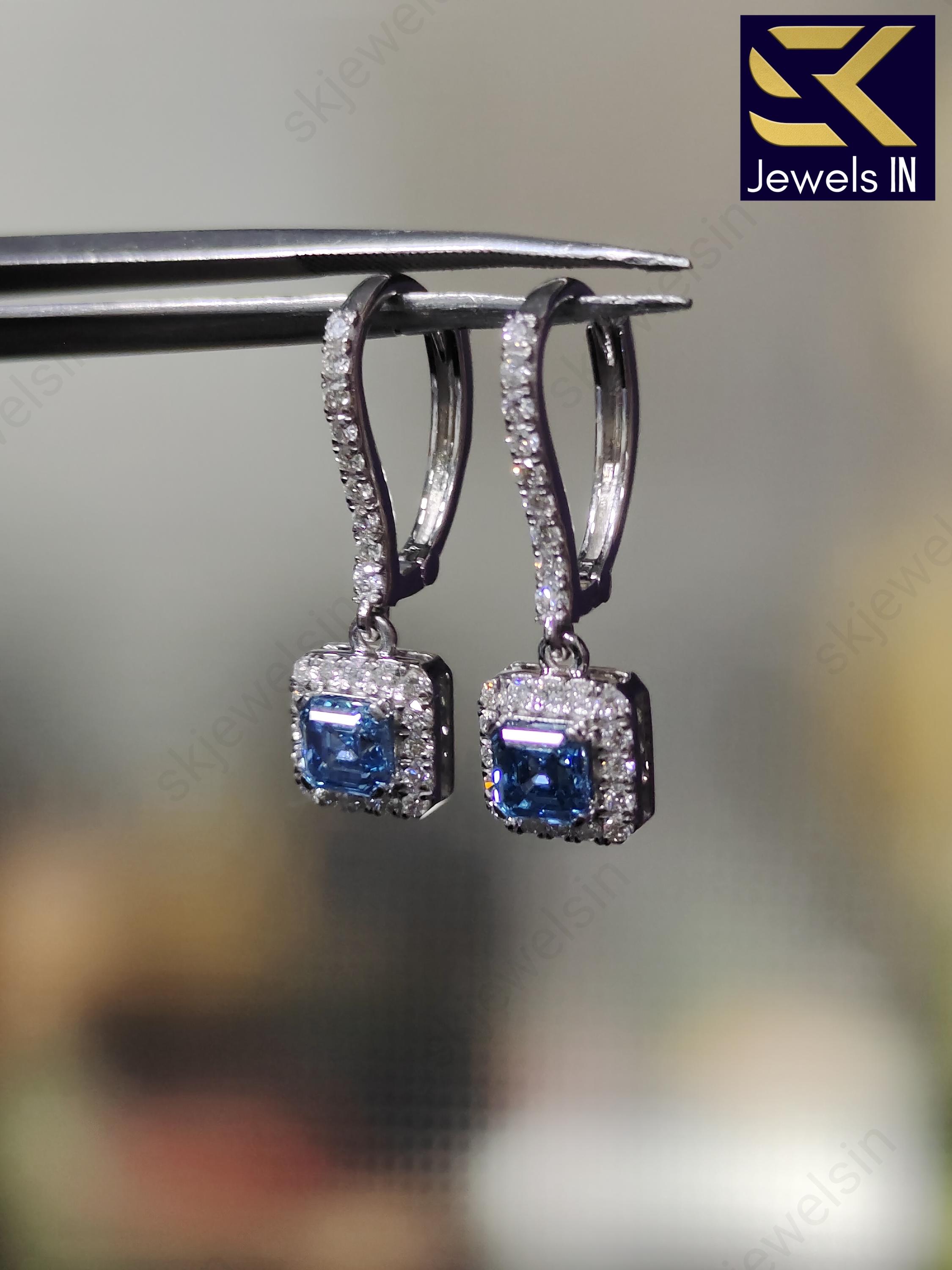 Blue Princess Cut Moissanite Dangle Earrings, 14K White Gold halo Diamond Earrings for Women, Bride Maid gifts, Earrings for Women