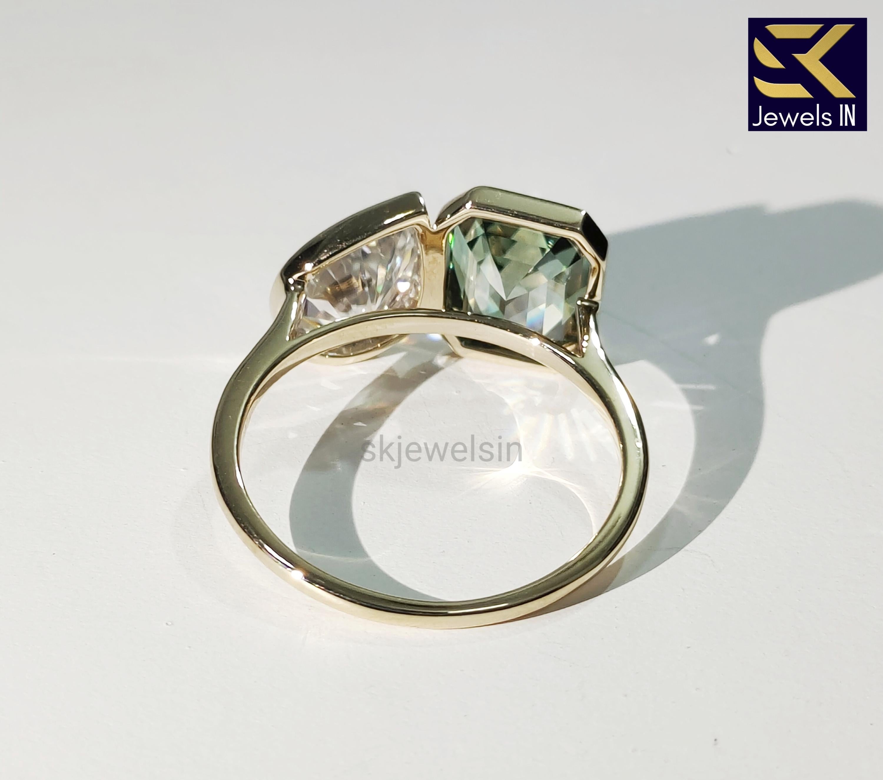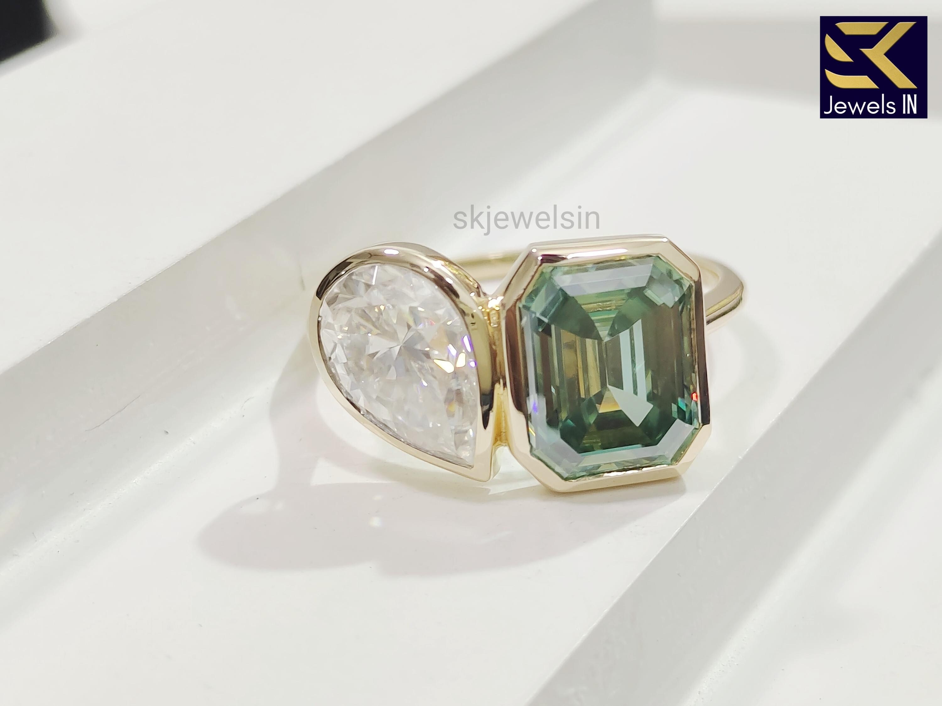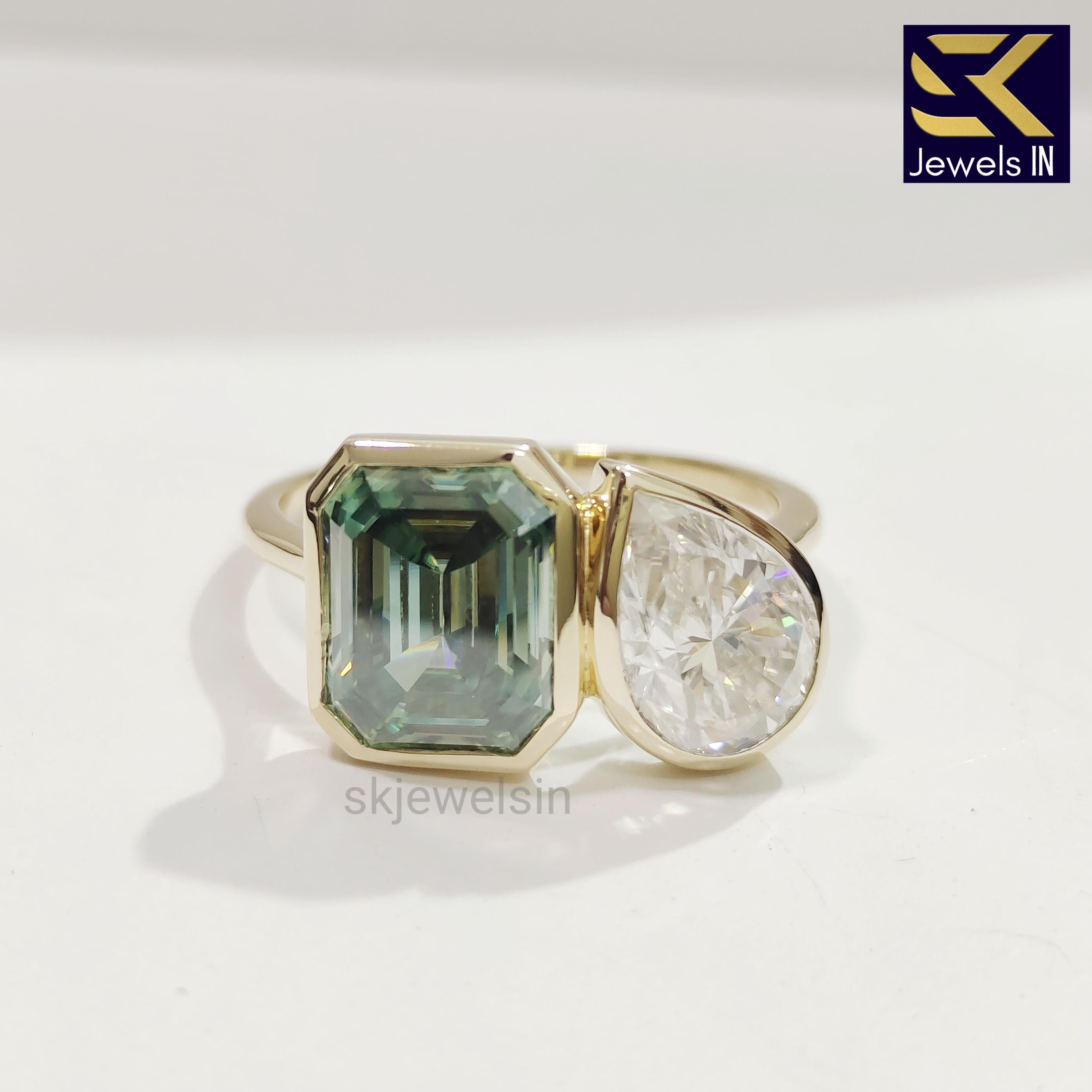 Toi Et Moi Engagement Ring, 14K Gold Bezel Set Green Emerald & Colorless Pear Moissanite Ring, Wedding Ring, Unique Promise Ring for her