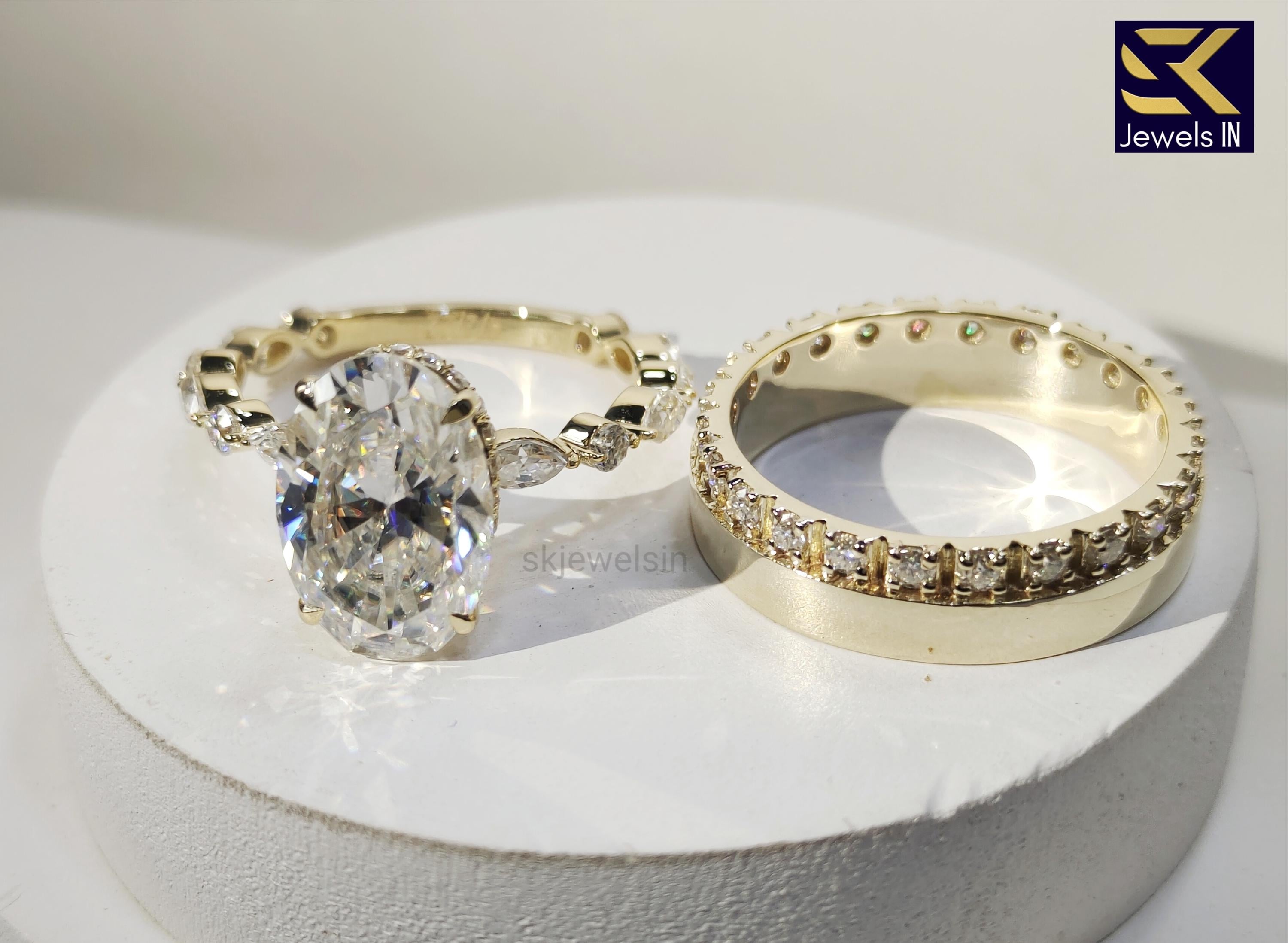 14K Gold Oval Moissanite Engagement Ring Set, Cigar Band with Eternity Pave Set Diamond band, Bridal Sets, Anniversary Gift, Wedding ring