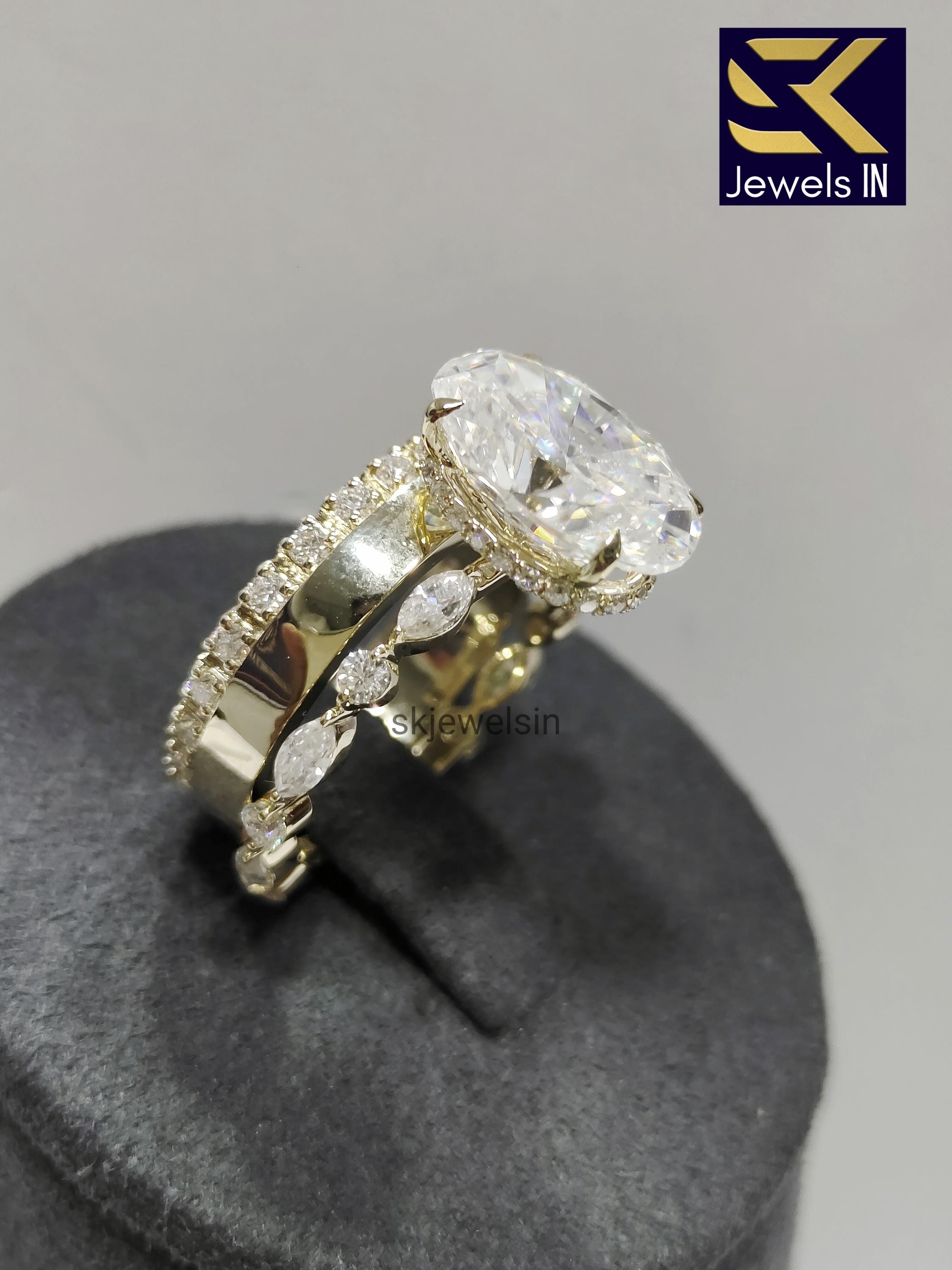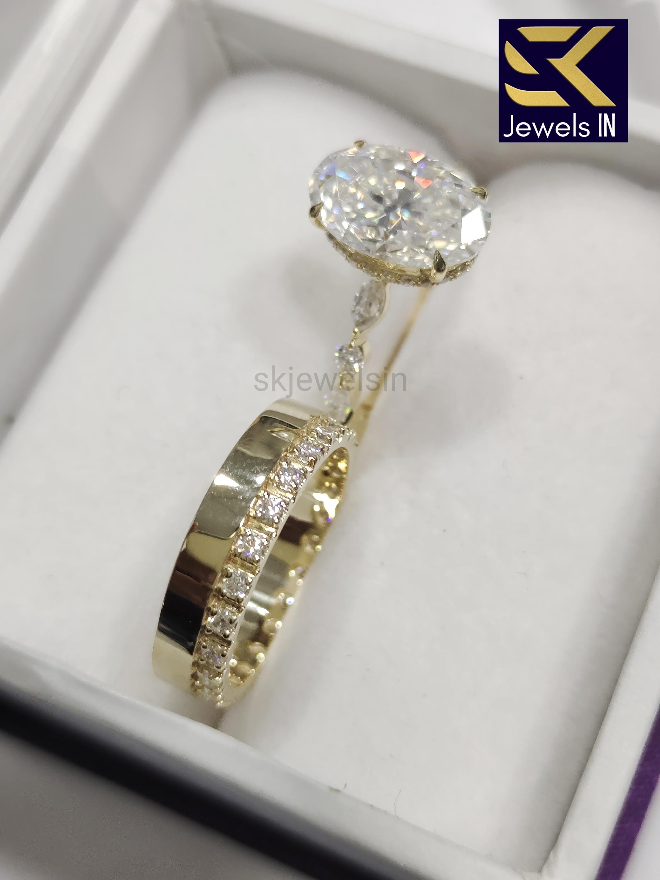 14K Gold Oval Moissanite Engagement Ring Set, Diamond Pave Band