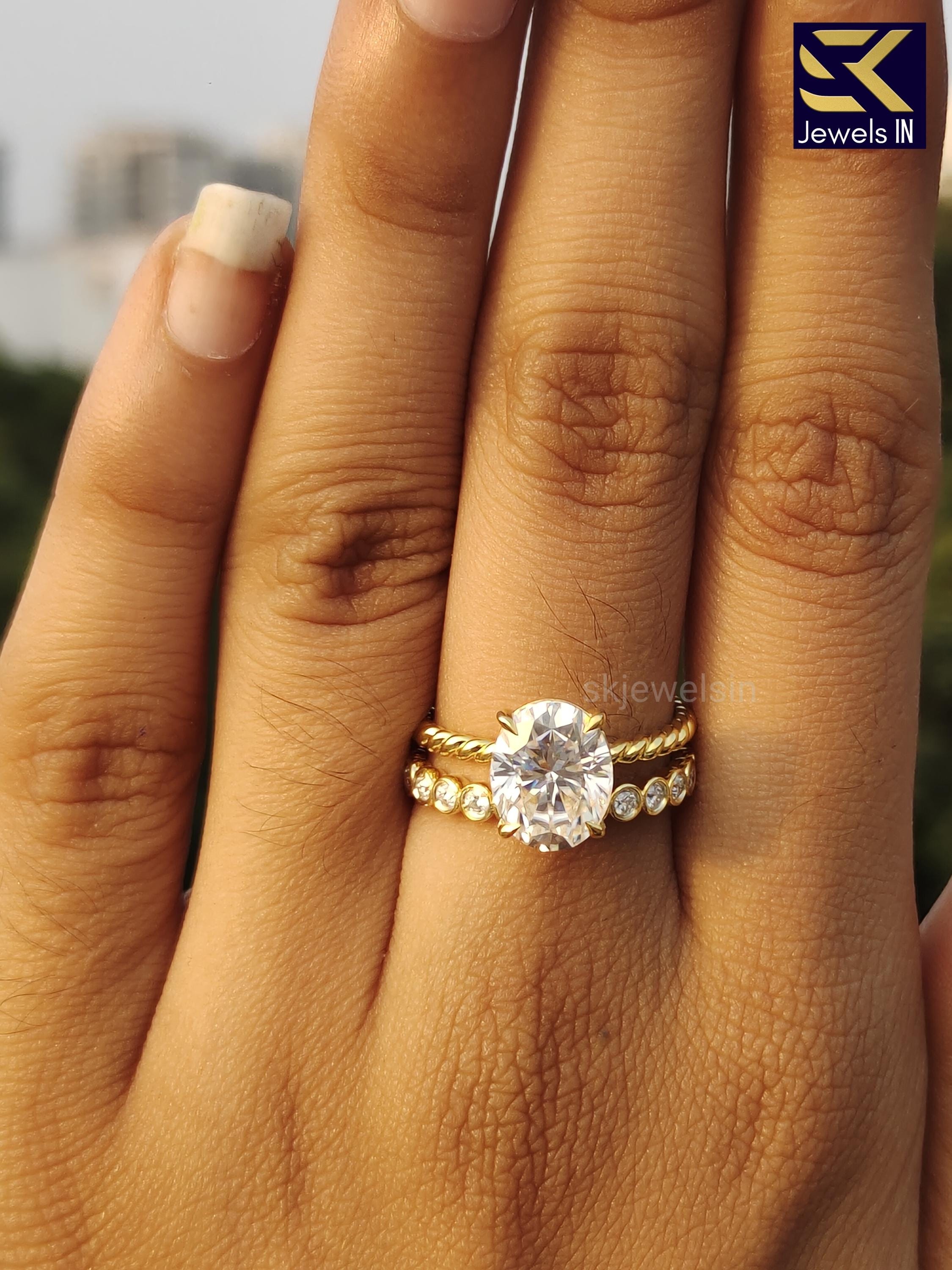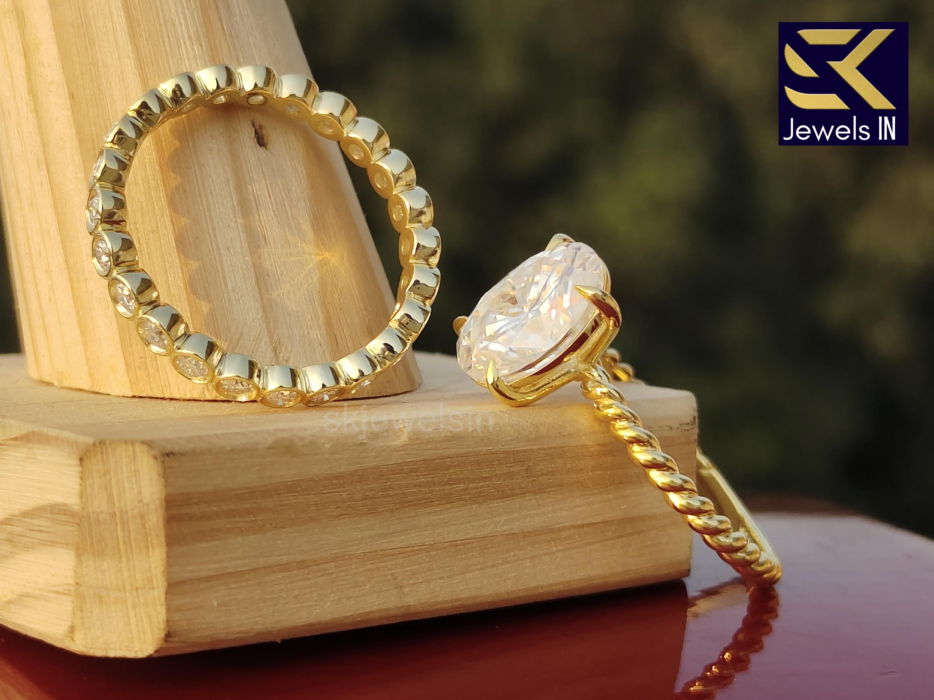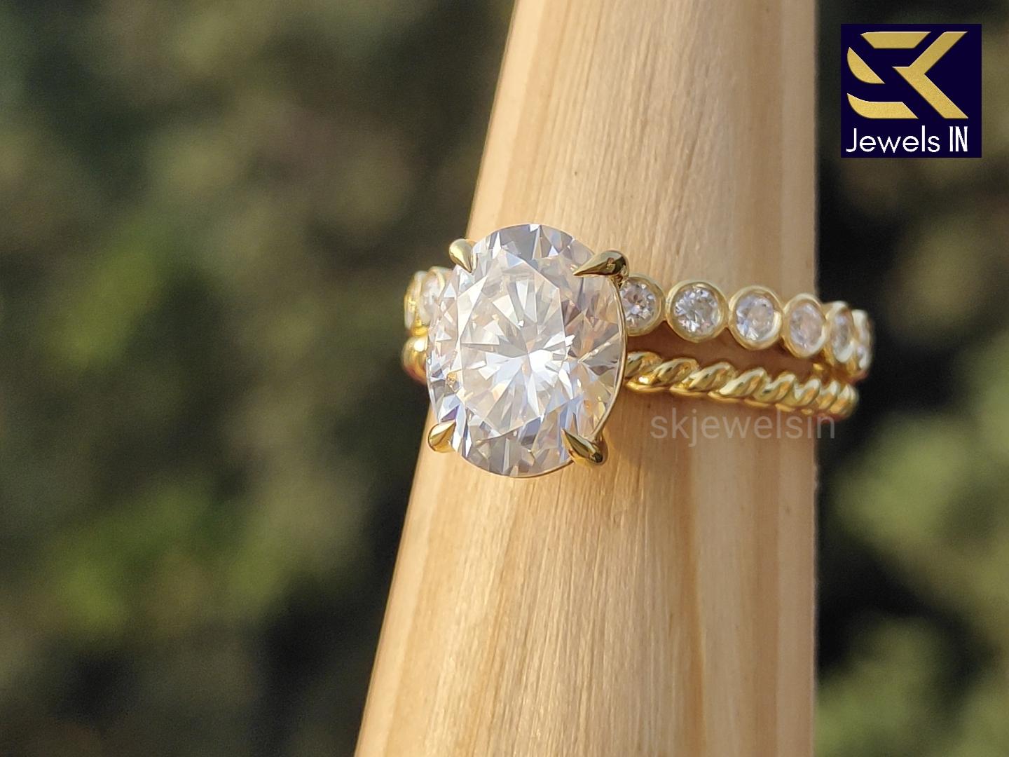 Handmade Oval Moissanite Engagement Ring, 14K Gold Eternity Band