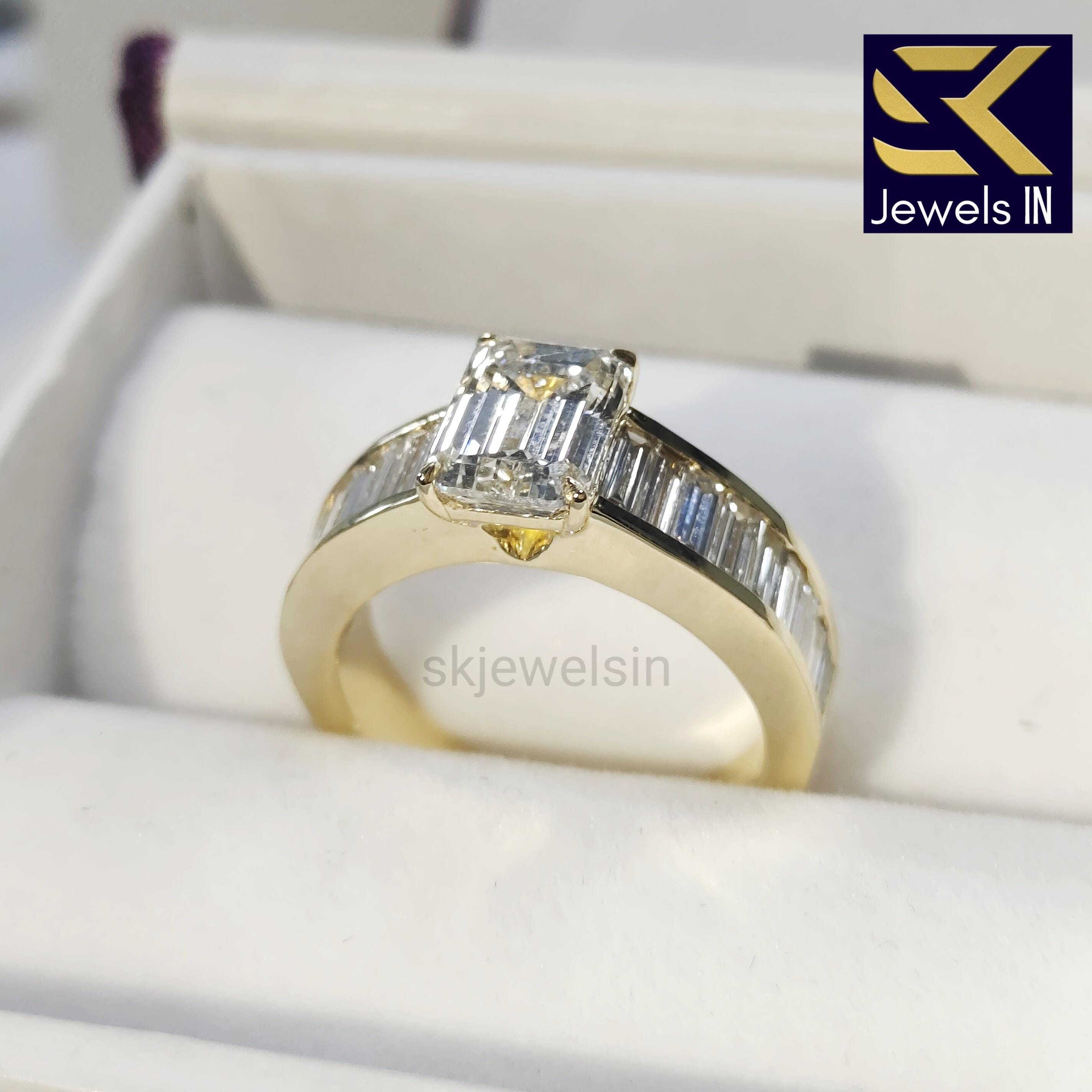 Center Stone: Premium, conflict-free Emerald Cut Moissanite. Known for its exceptional brilliance and fire, this diamond alternative offers significant sparkle at an incredible value.