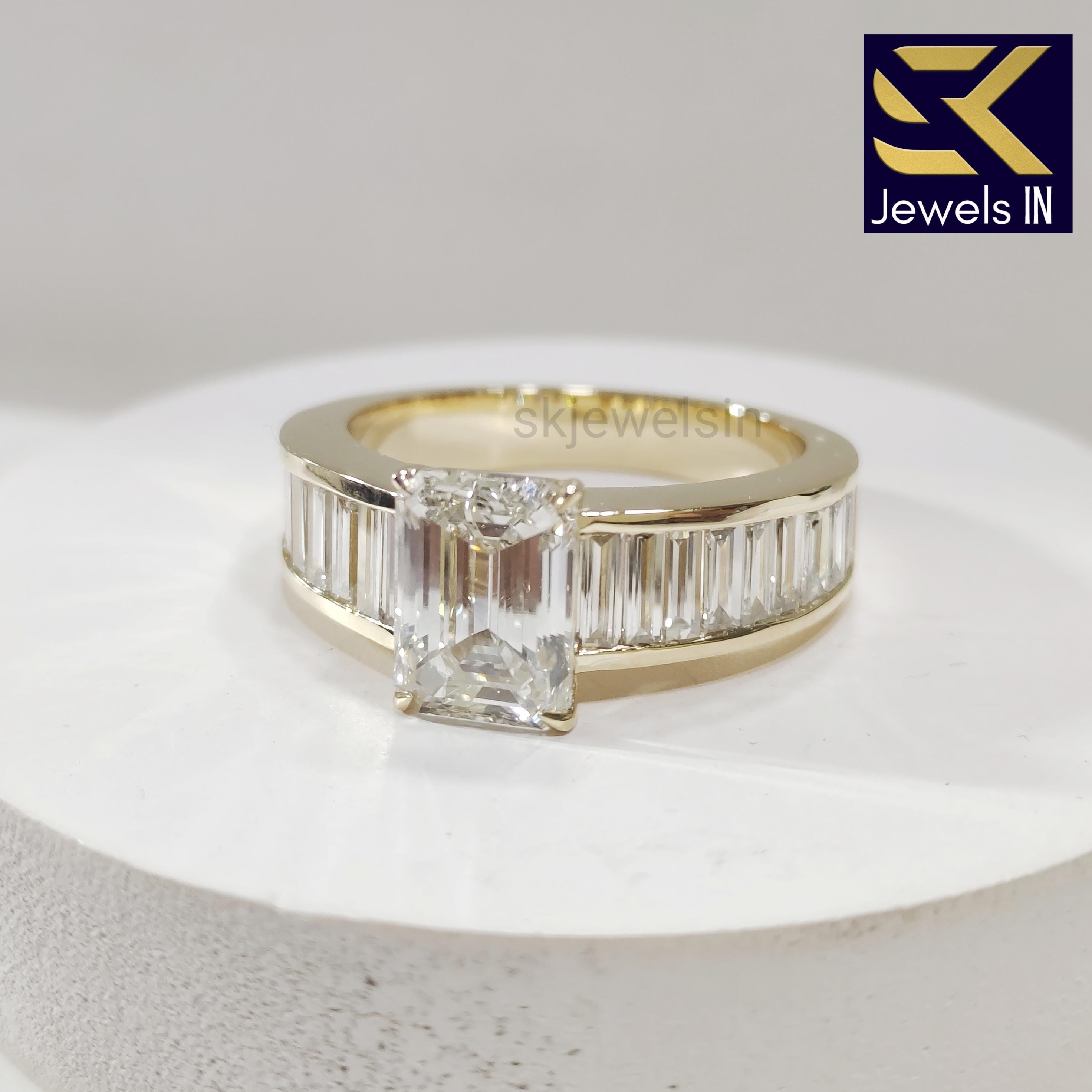 This exquisite ring combines the geometric beauty of the emerald cut with the modern flair of channel-set baguettes, creating a truly unique and eye-catching piece. It is an ideal bridal ring or a thoughtful anniversary gift for the woman who appreciates classic design with a contemporary edge.