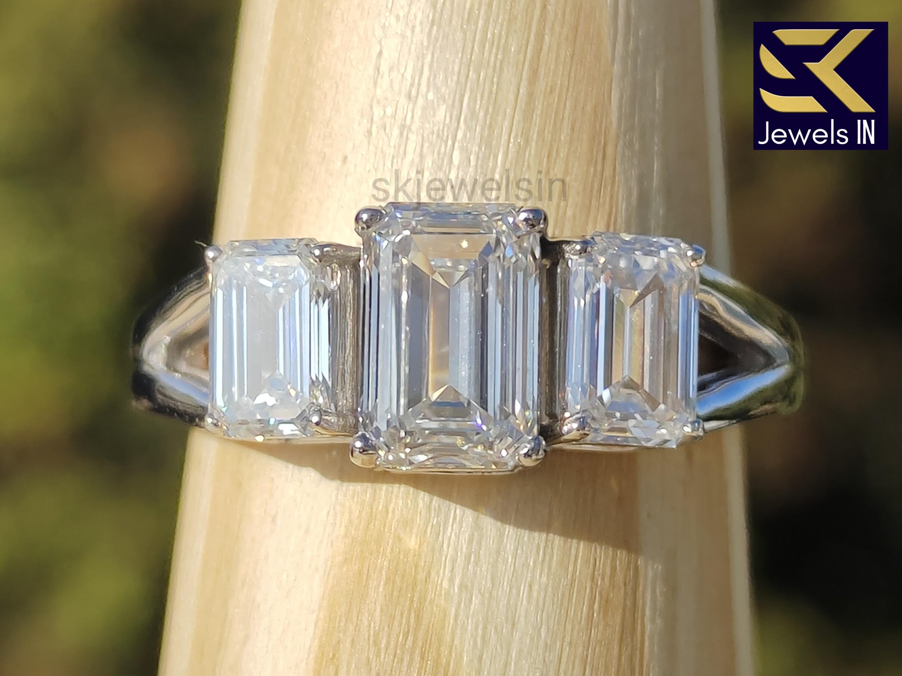 π The Design Three perfectly matched Emerald Cut Moissanites create a wall of "hall of mirrors" sparkle across your finger. The elegant Split Shank band (where the band divides into two) not only adds a vintage architectural touch but also provides superior balance, ensuring your ring sits upright and never spins.