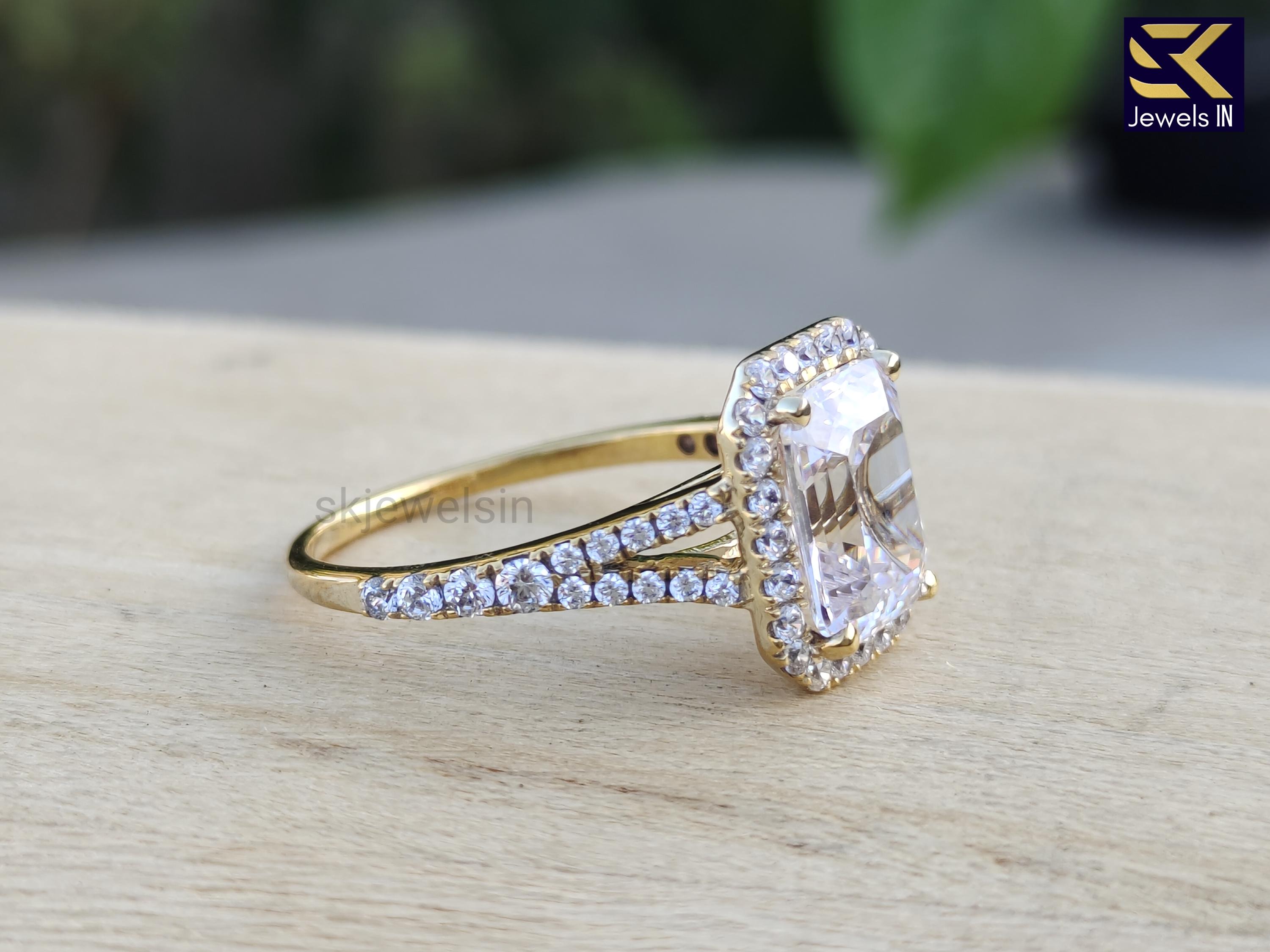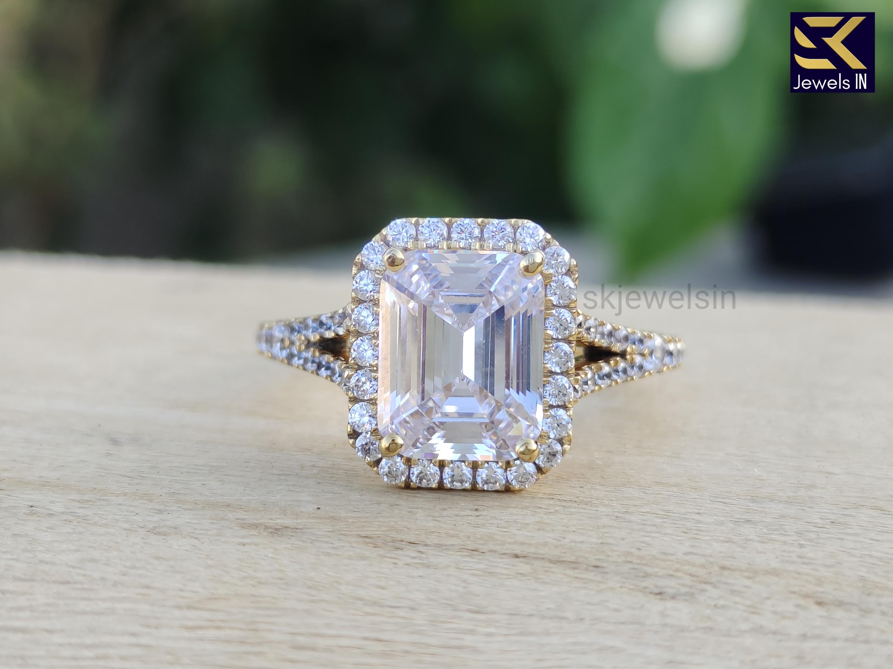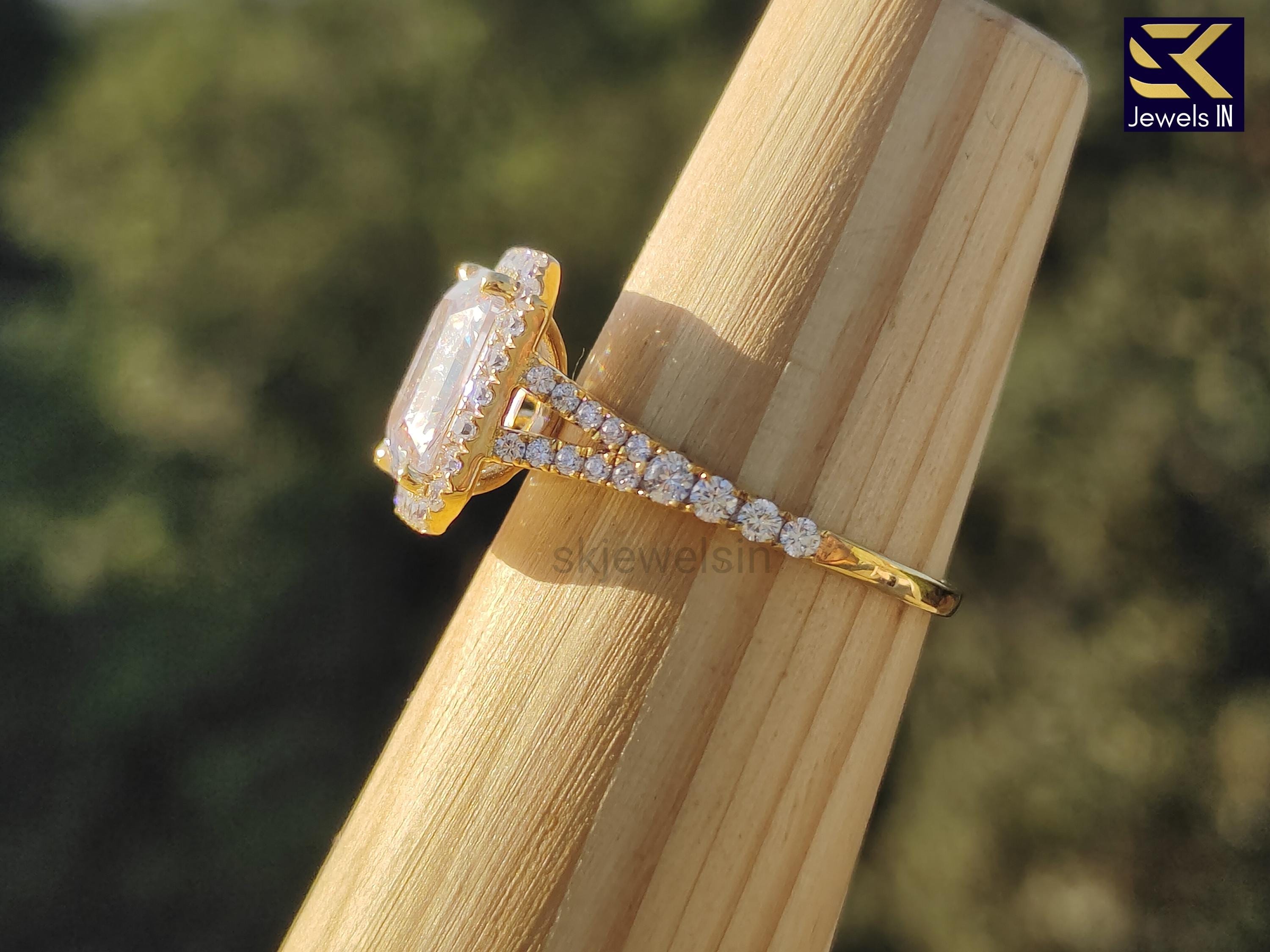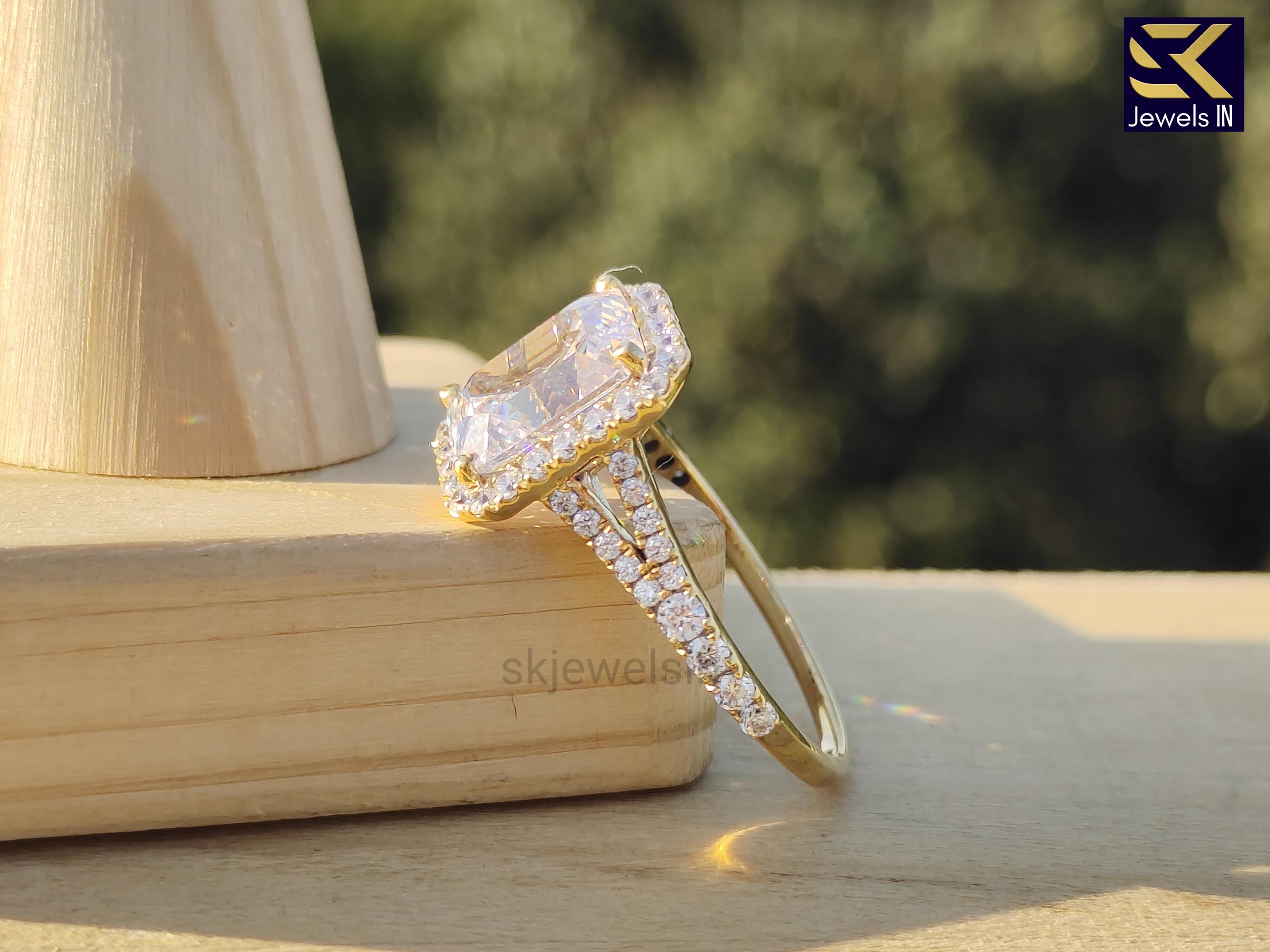 β¨ The "Royal" Look Inspired by vintage Art Deco glamour, this ring is designed to turn heads. The crisp, clean lines of the Emerald Cut center stone are surrounded by a brilliant sparkling halo, creating a "Hall of Mirrors" effect that captivates from across the room.