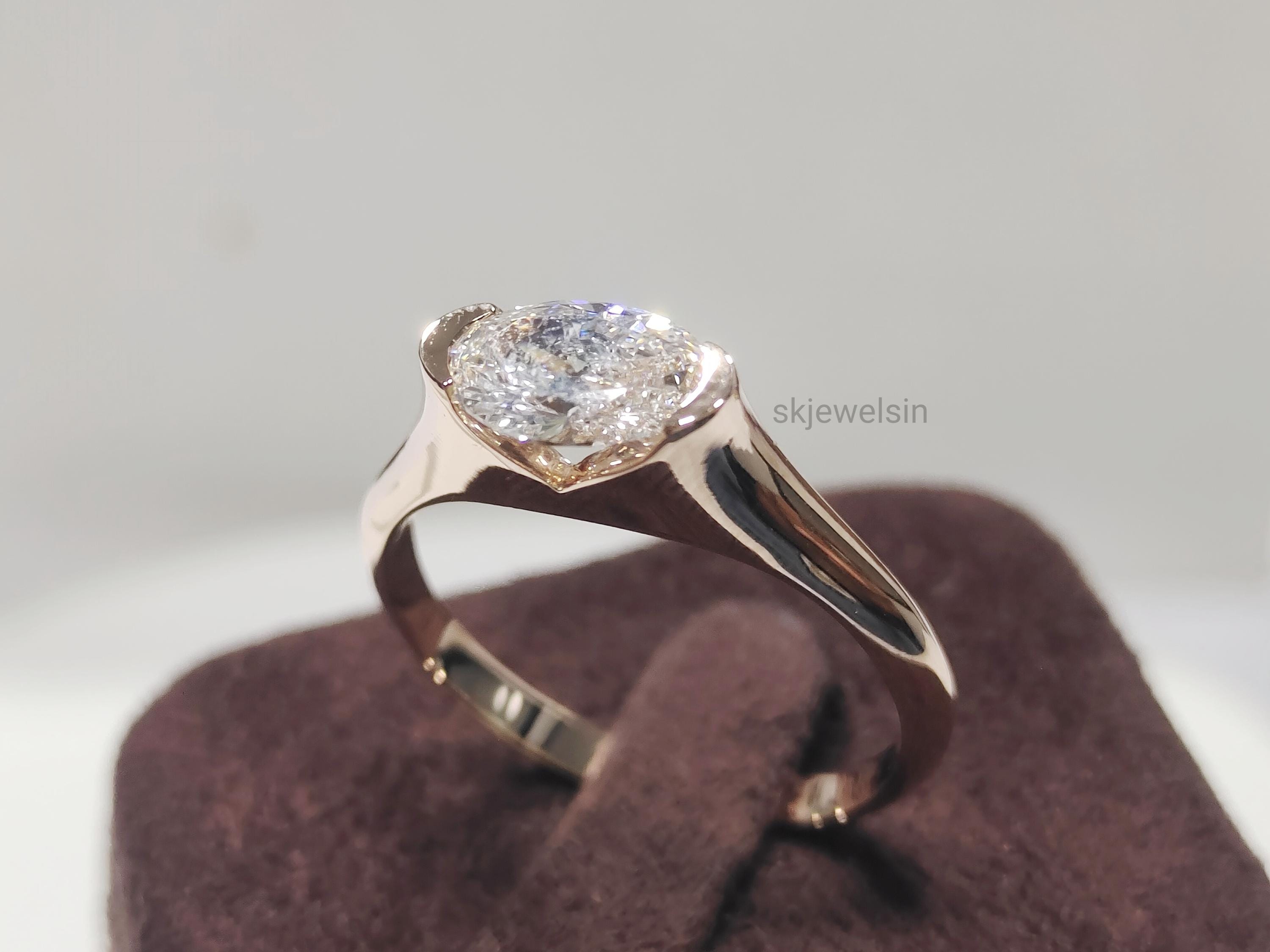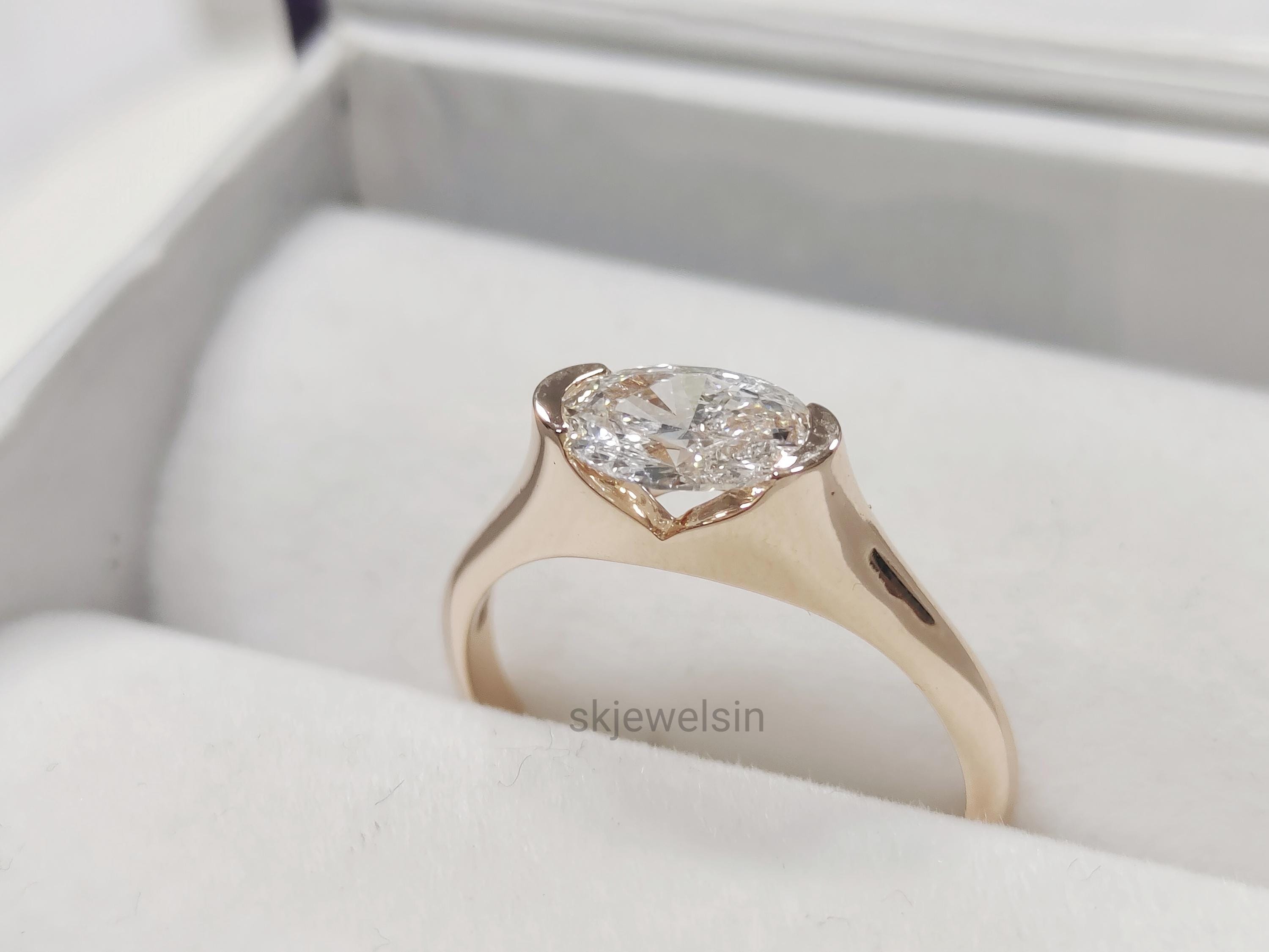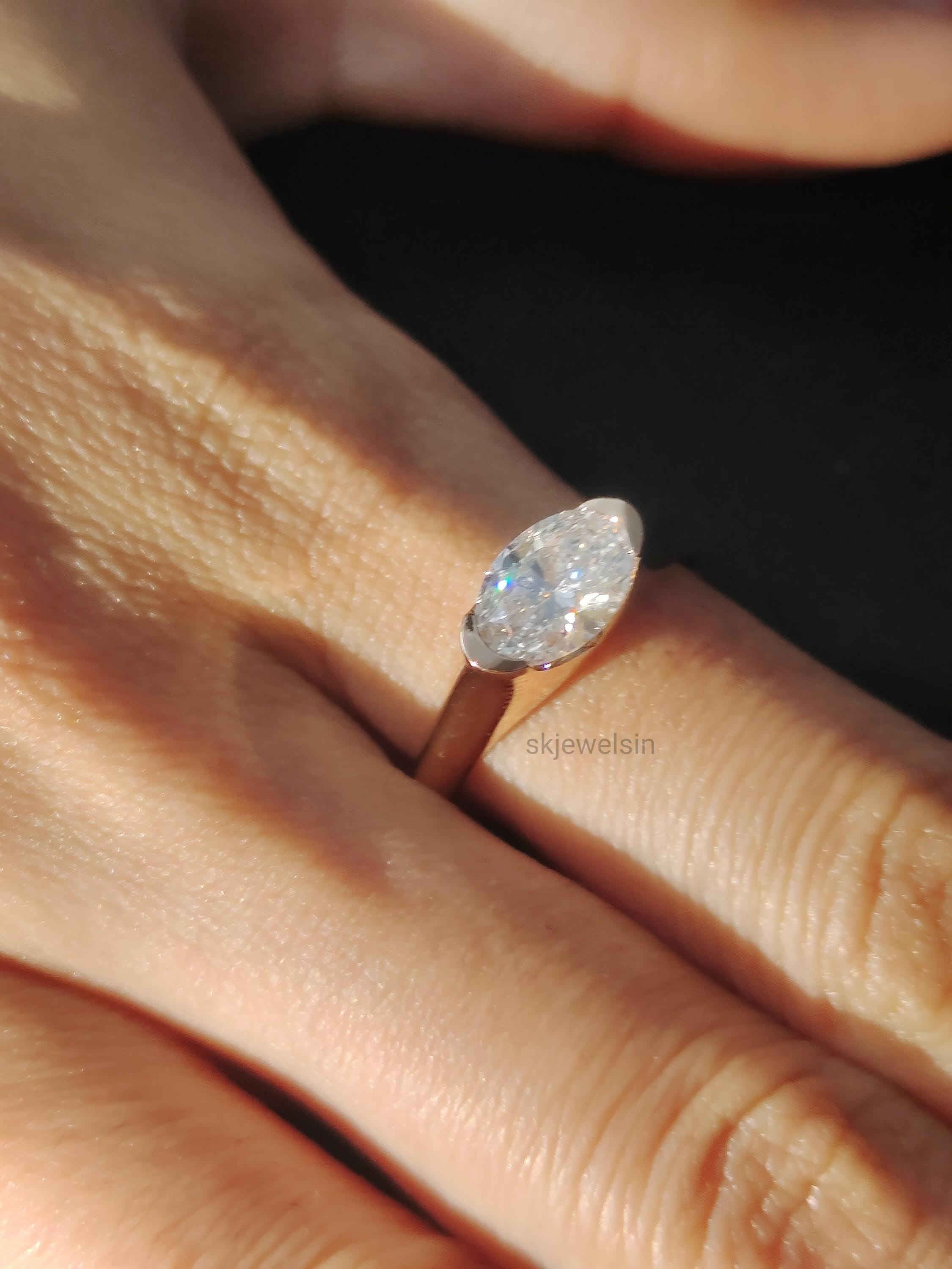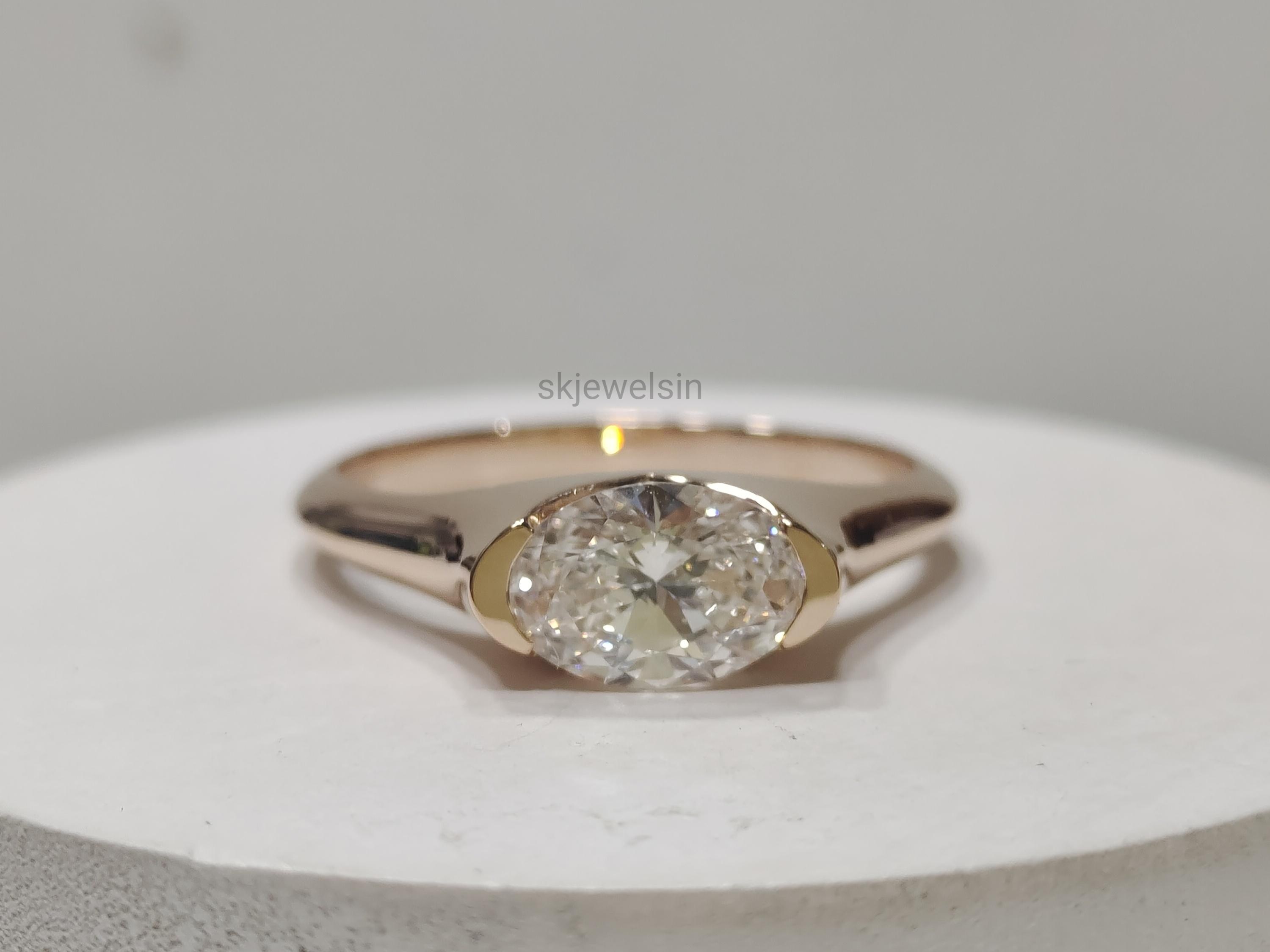 Half Bezel Set Oval Engagement Ring 14K Gold East West Oval Moissanite Ring Unique wedding ring Bridal set ring Handmade Rose gold ring