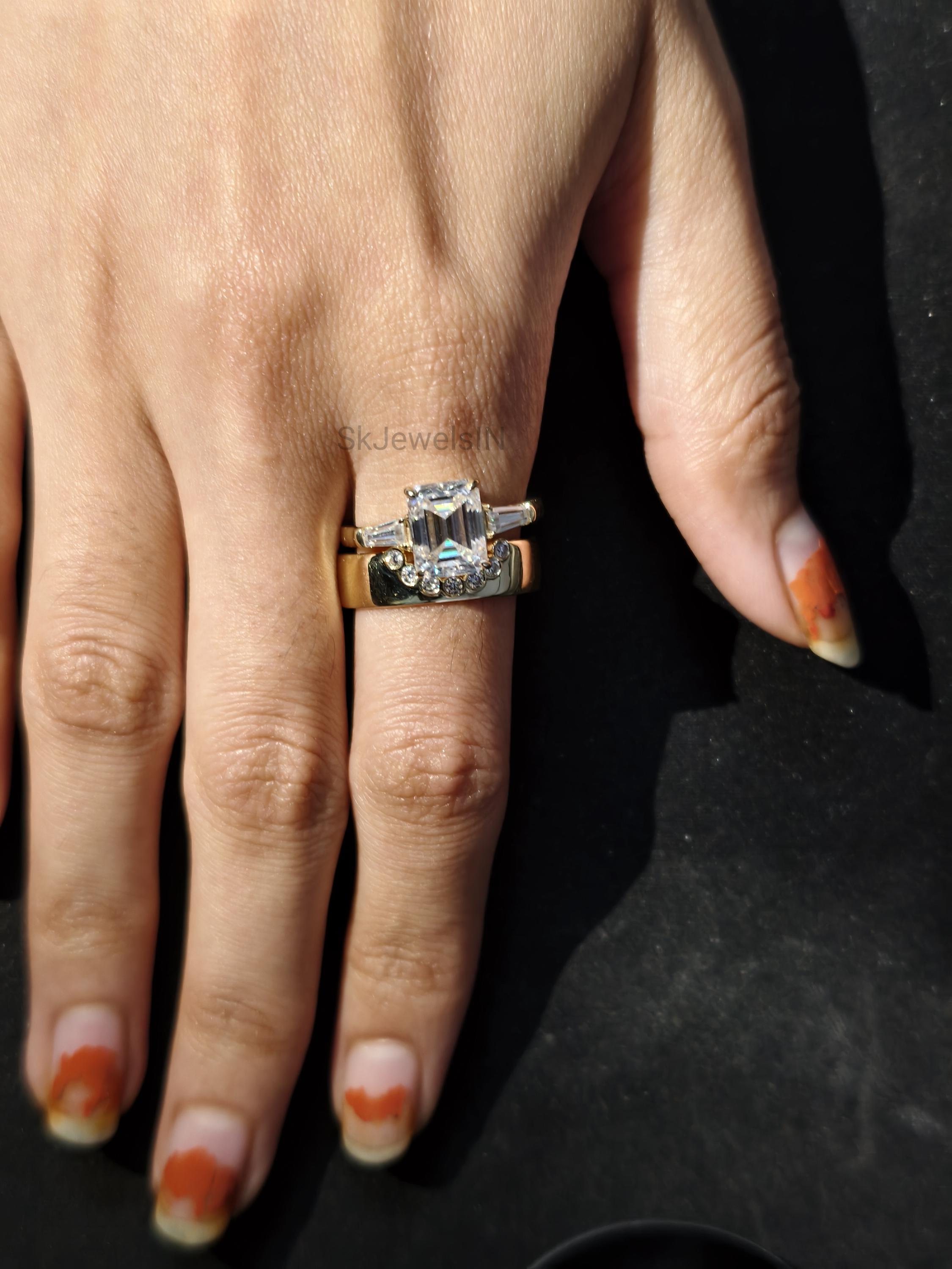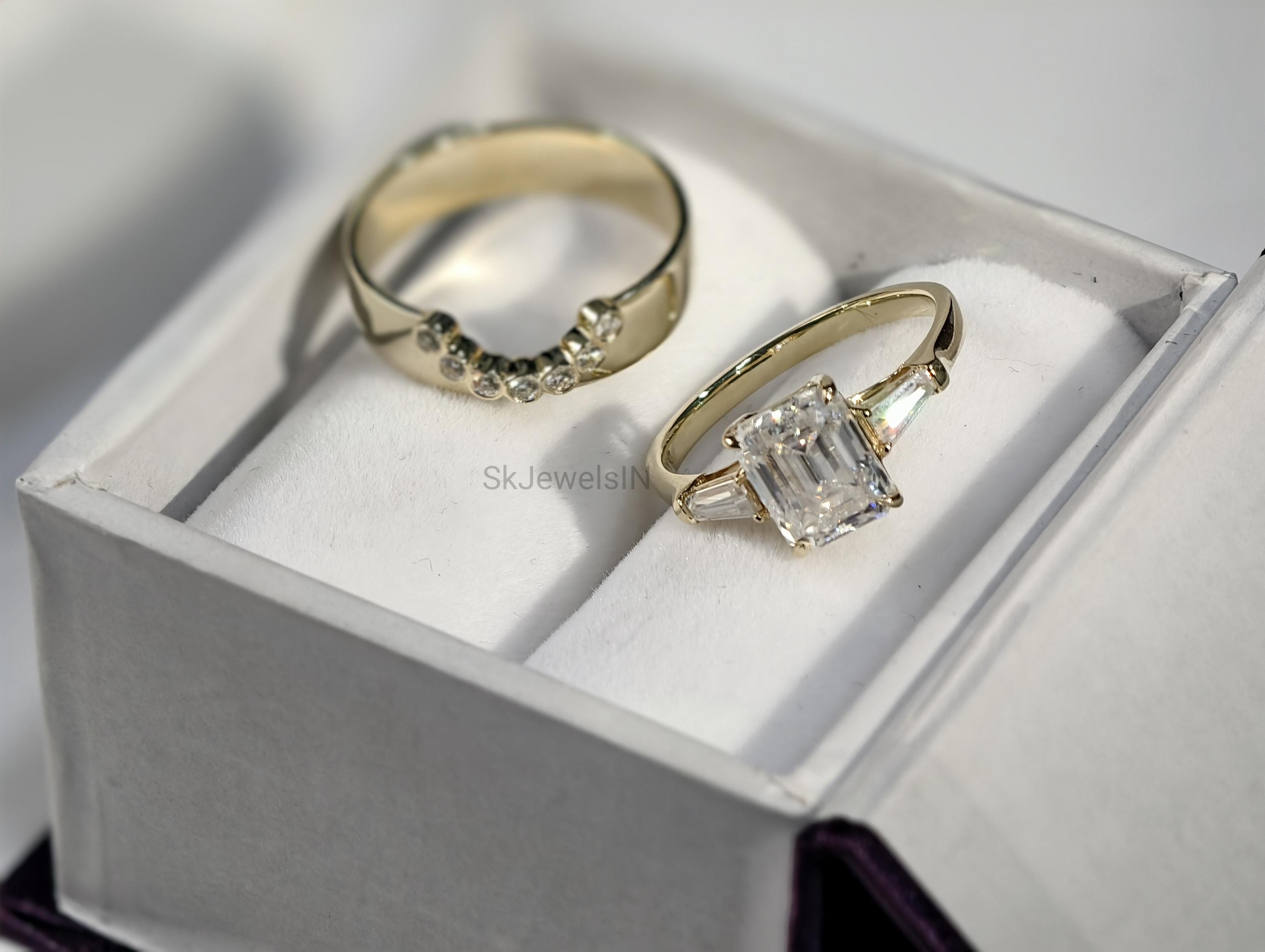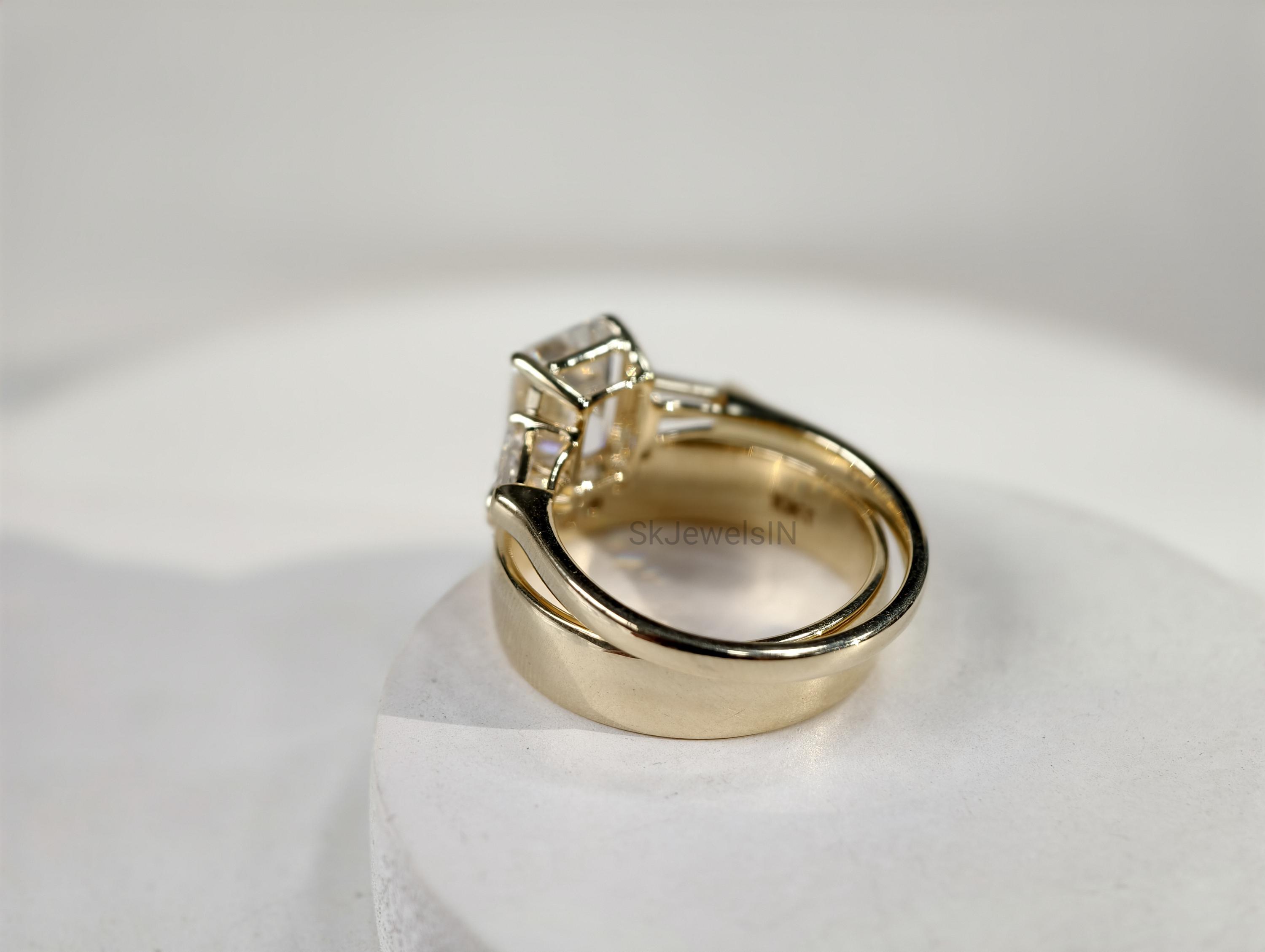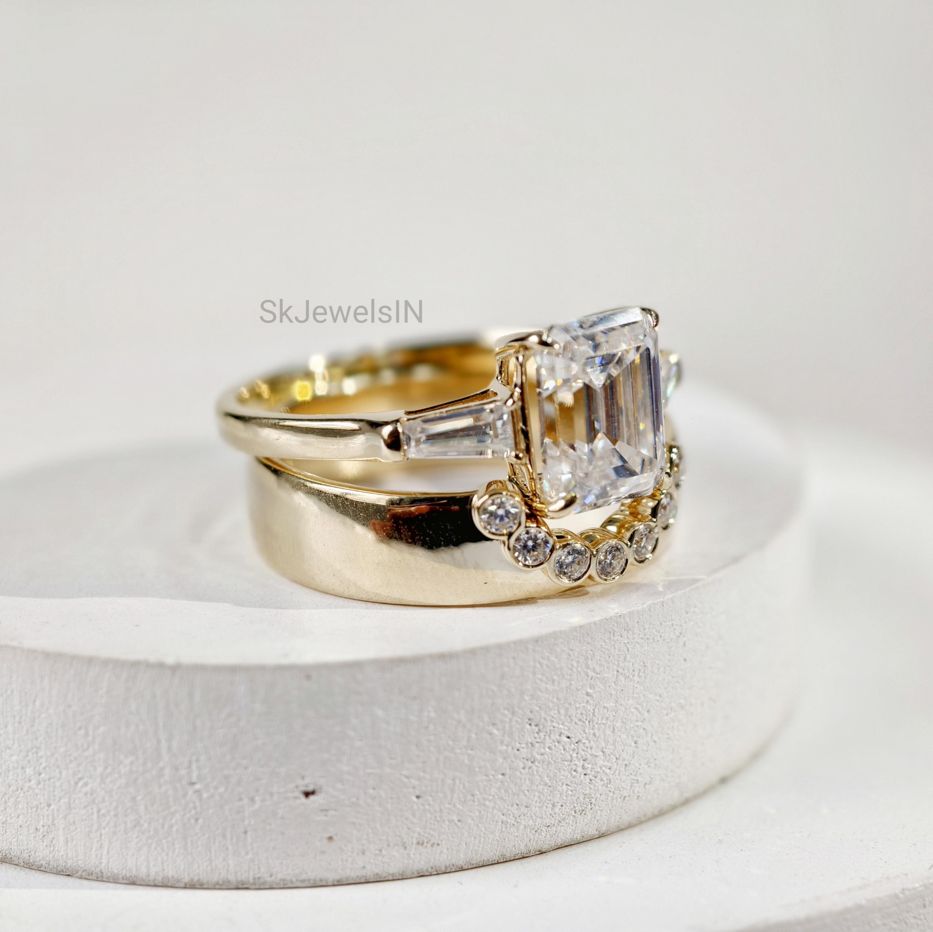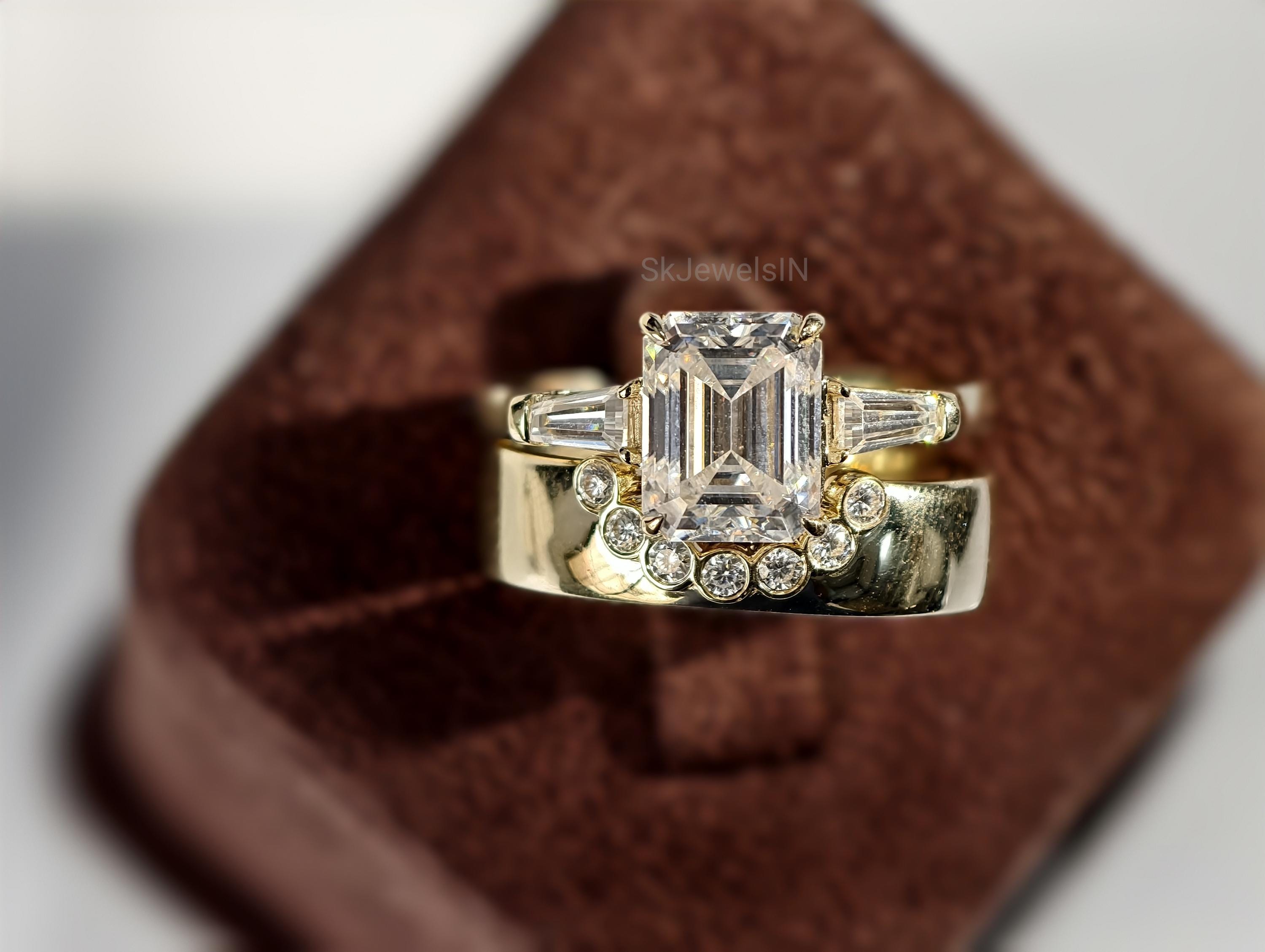 2 CT Emerald Cut Moissanite Bridal set 14K Solid Gold Wedding set With U shape Thick Bezel Set Stacking Band Vintage Style ring for women