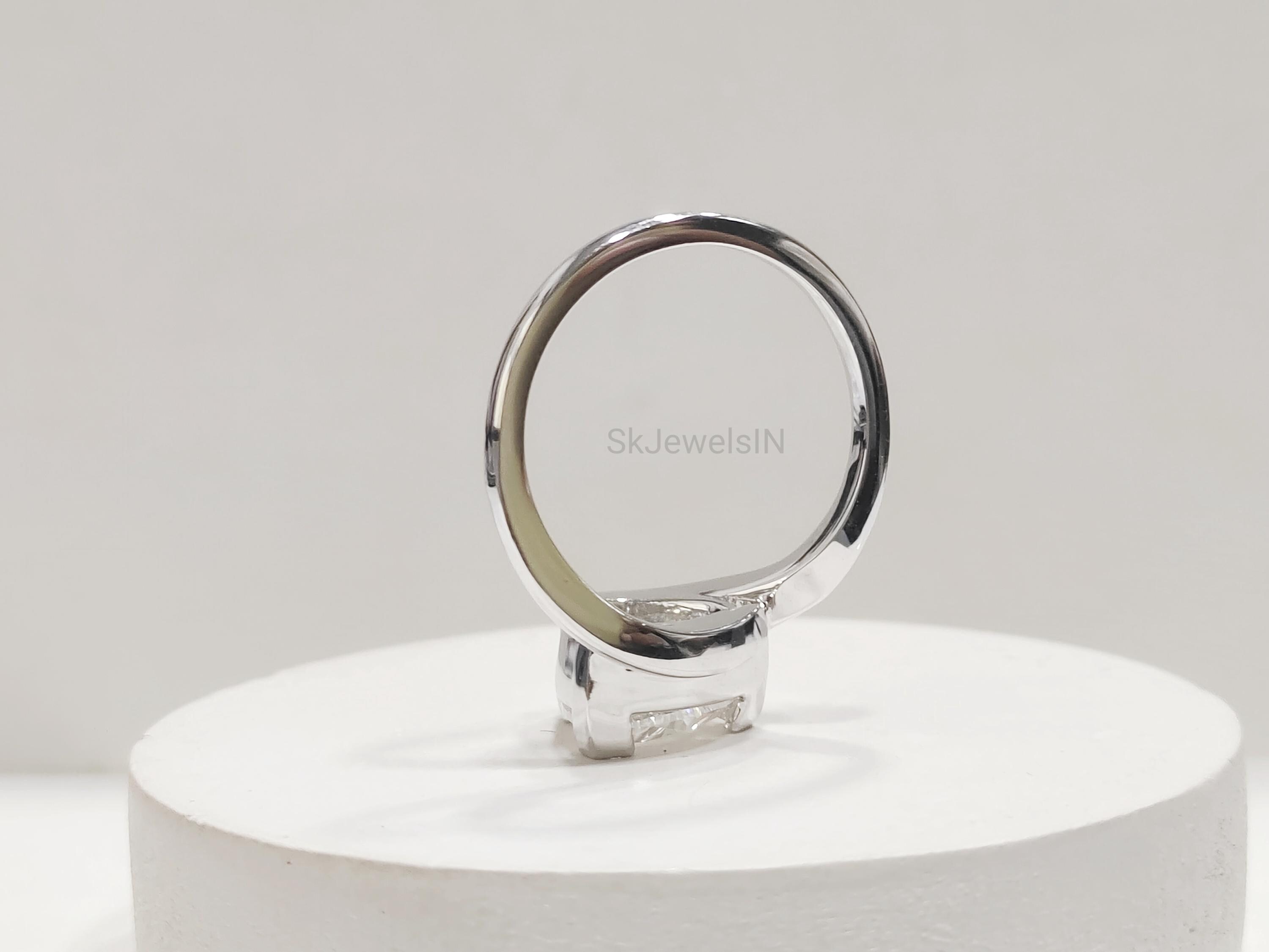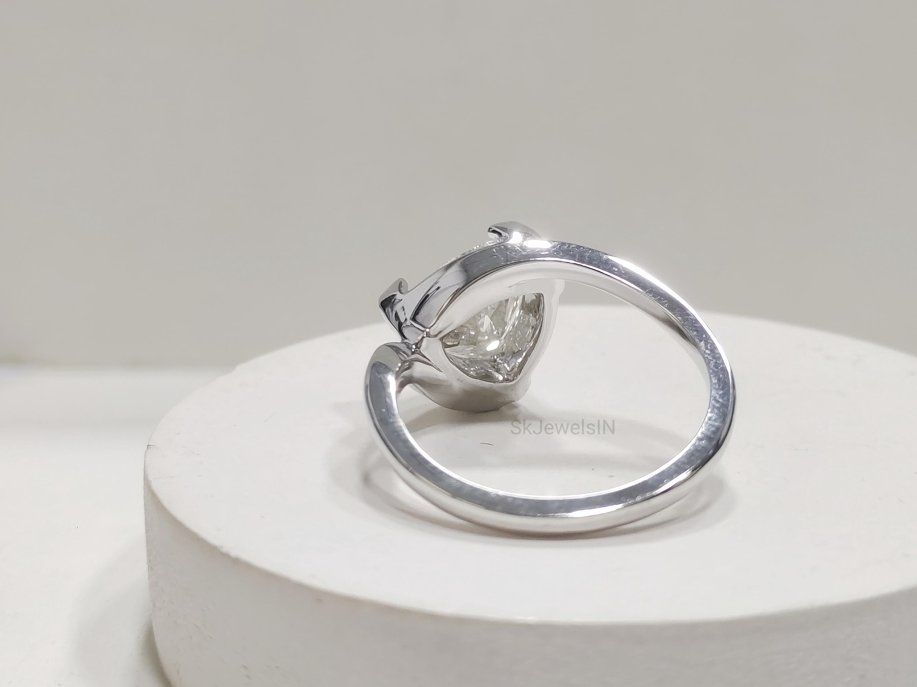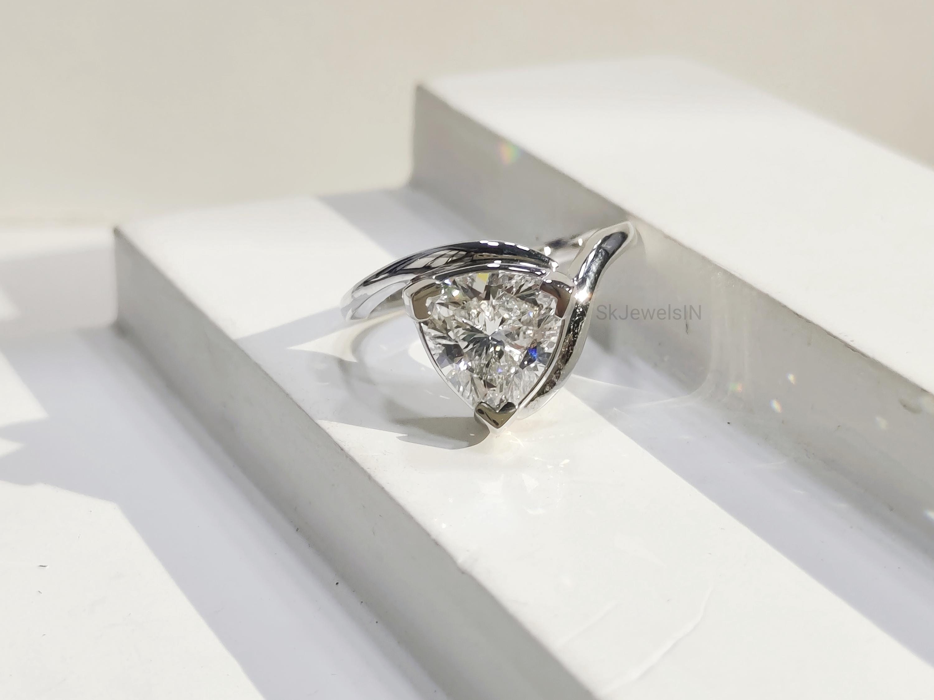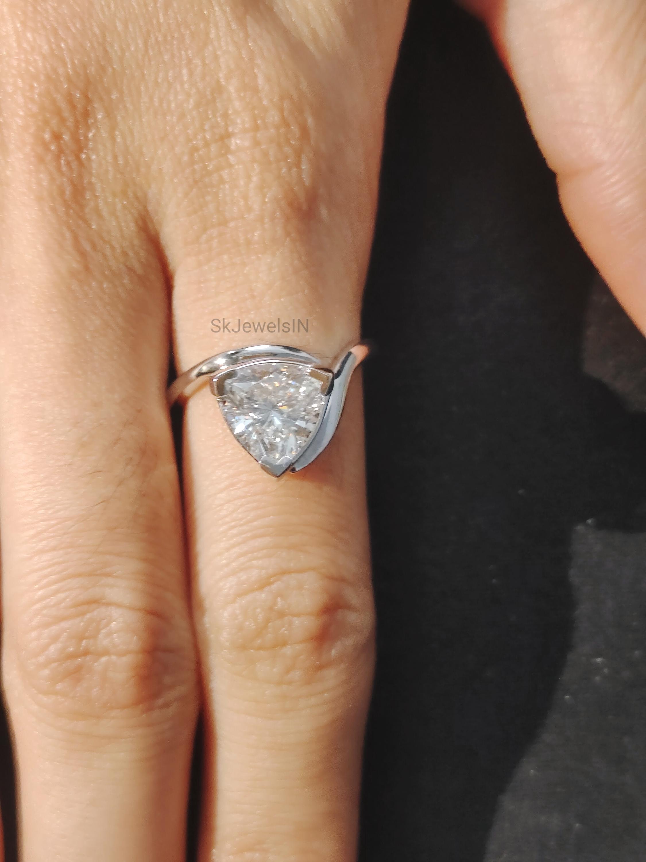Capture every gaze with this breathtaking Trillion Cut Moissanite Ring. Featuring a brilliant triangular center stone cradled in a unique modern bypass setting, this piece is designed for the woman who loves geometric elegance and stands out from the crowd.