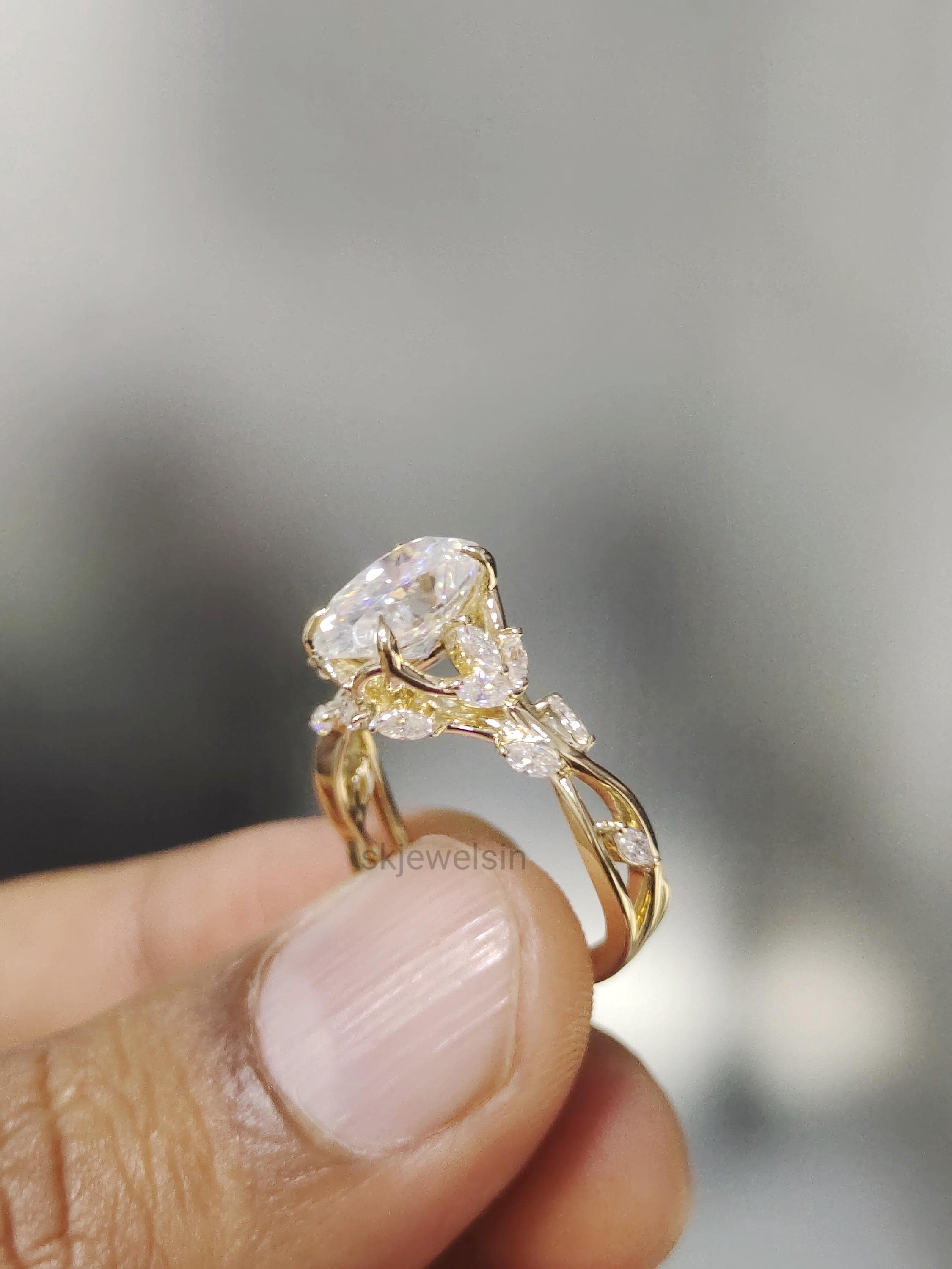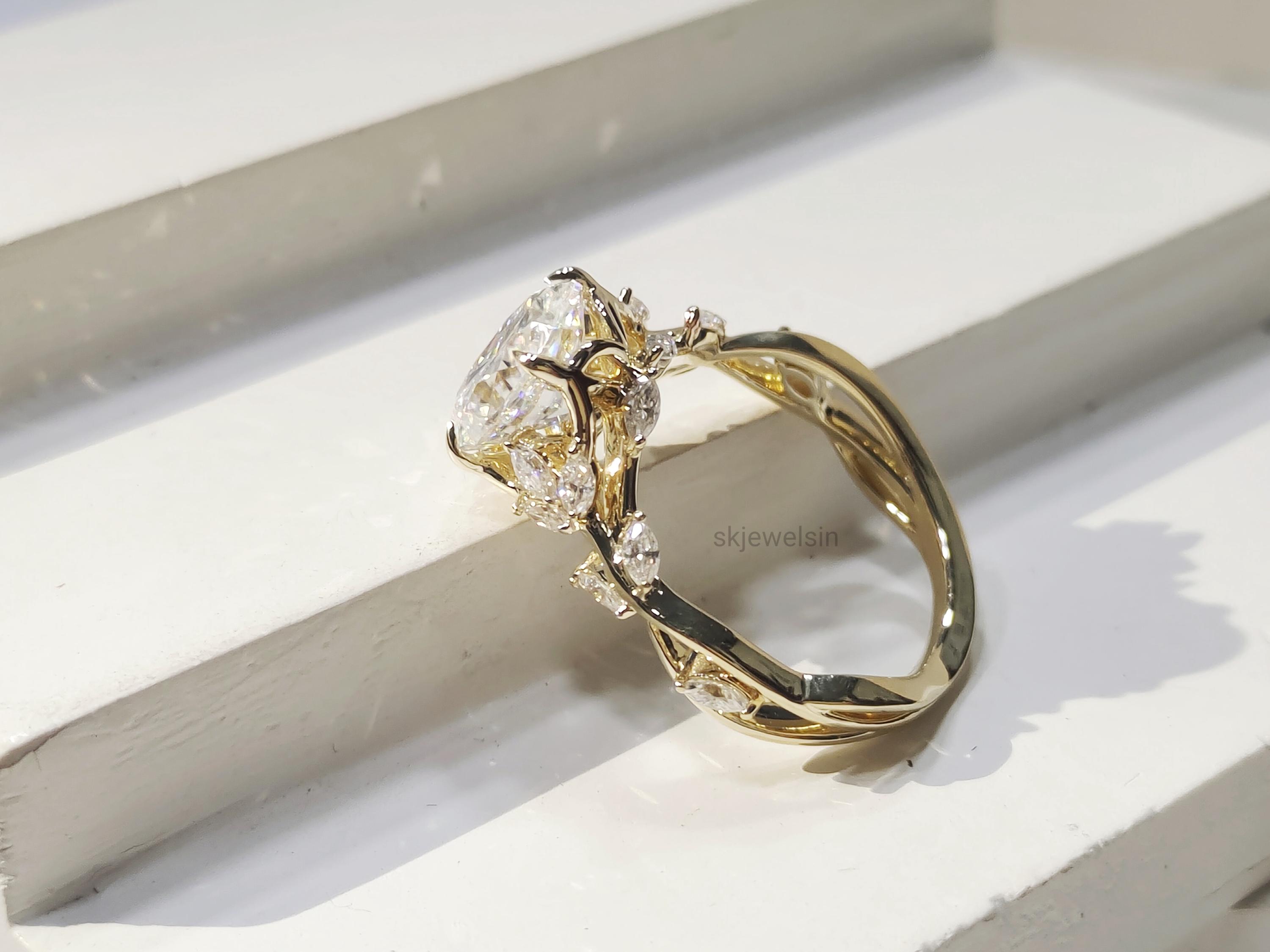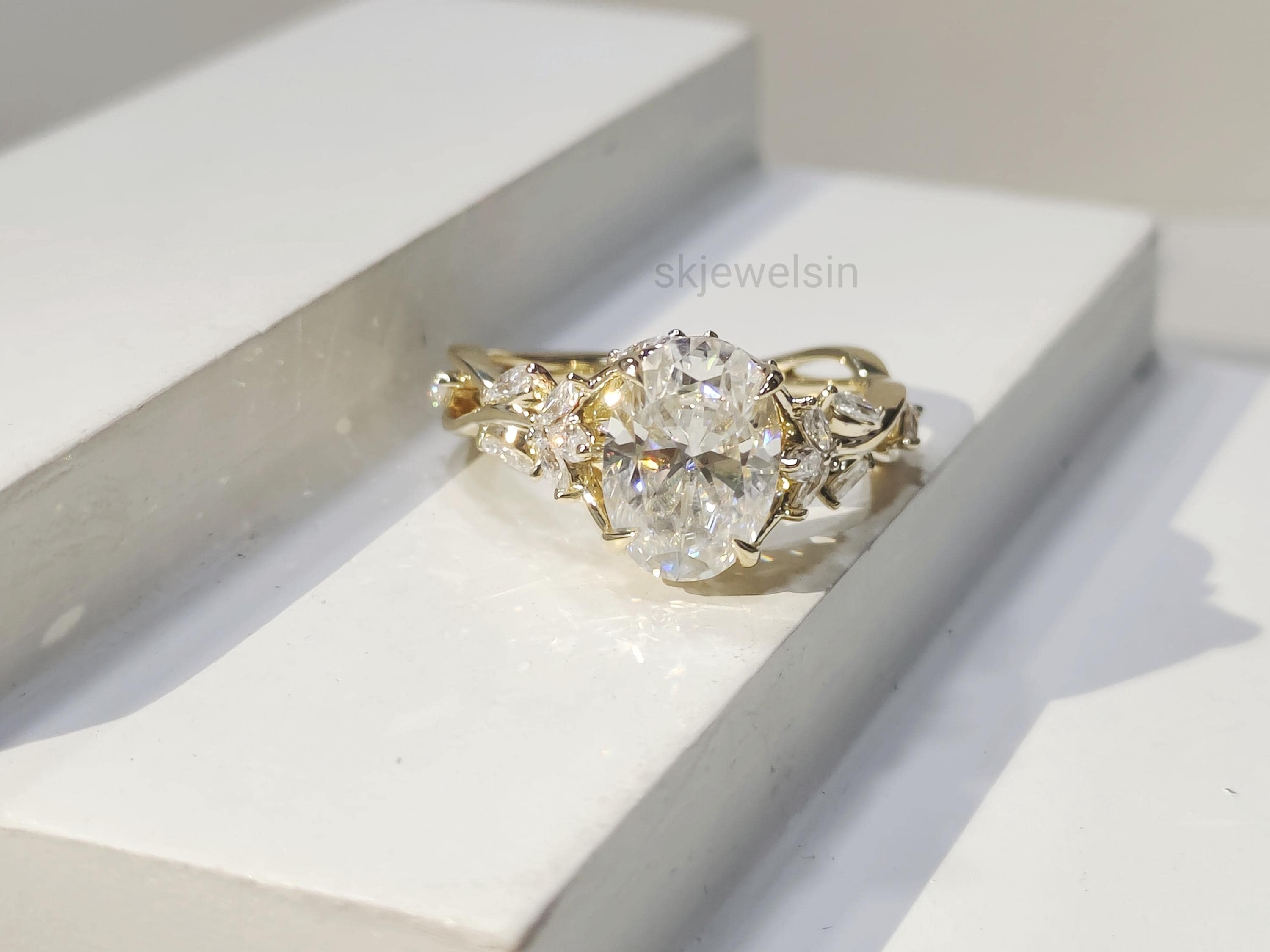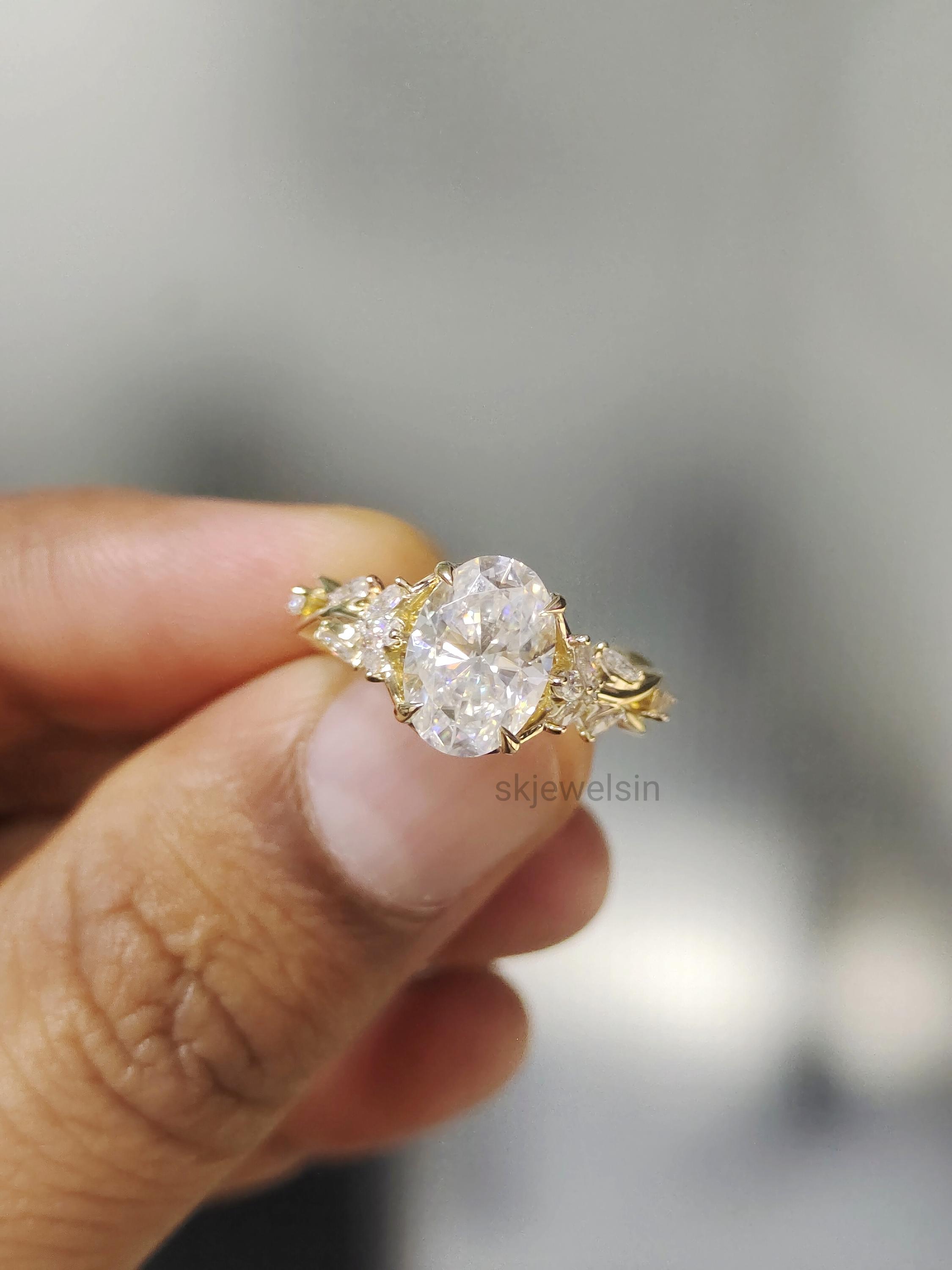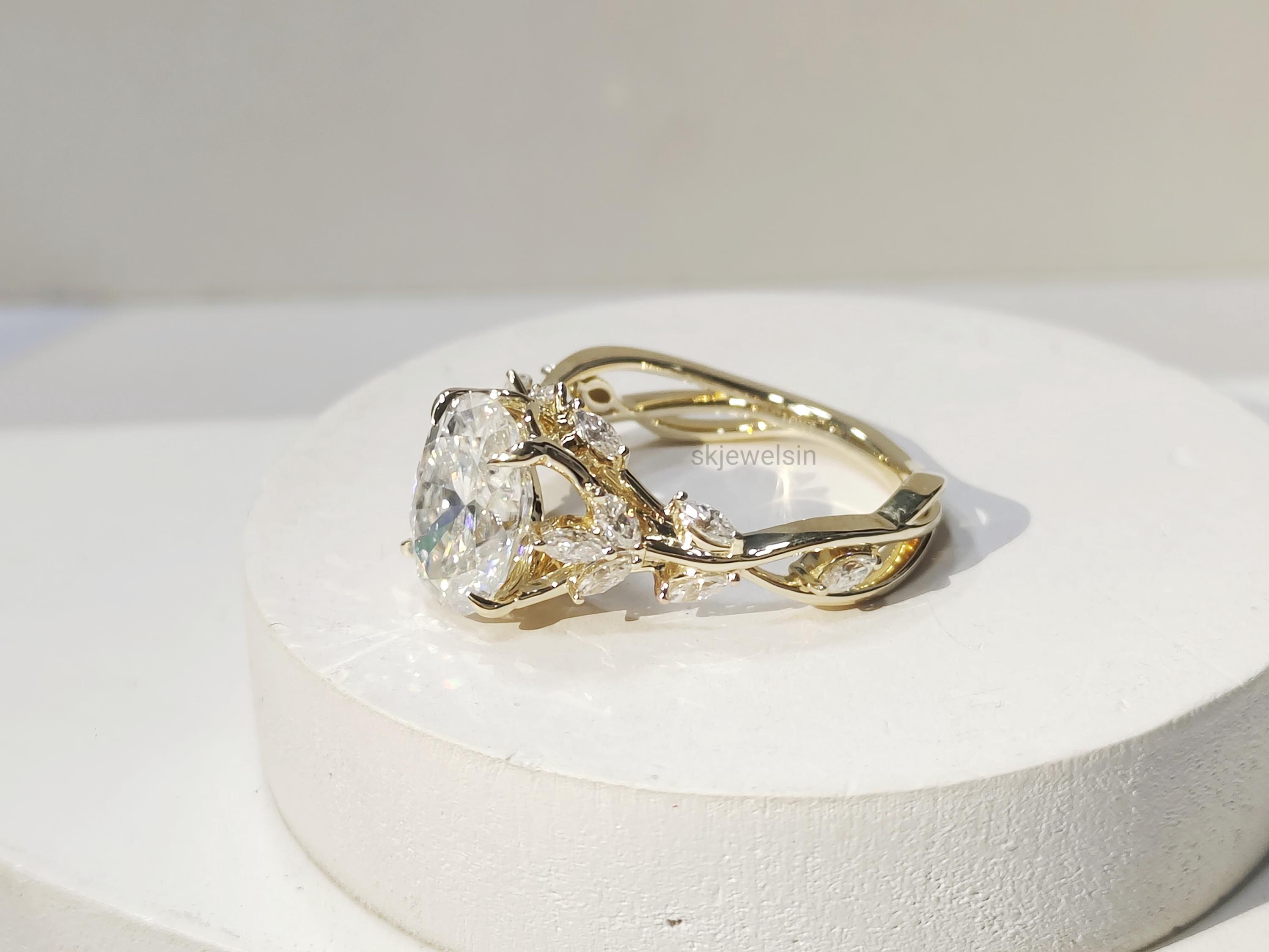 Vintage oval Moissanite Engagement Ring, 14K Gold Leaf Shank, Nature Inspired Designer Ring, Handmade Art deco Ring For Women