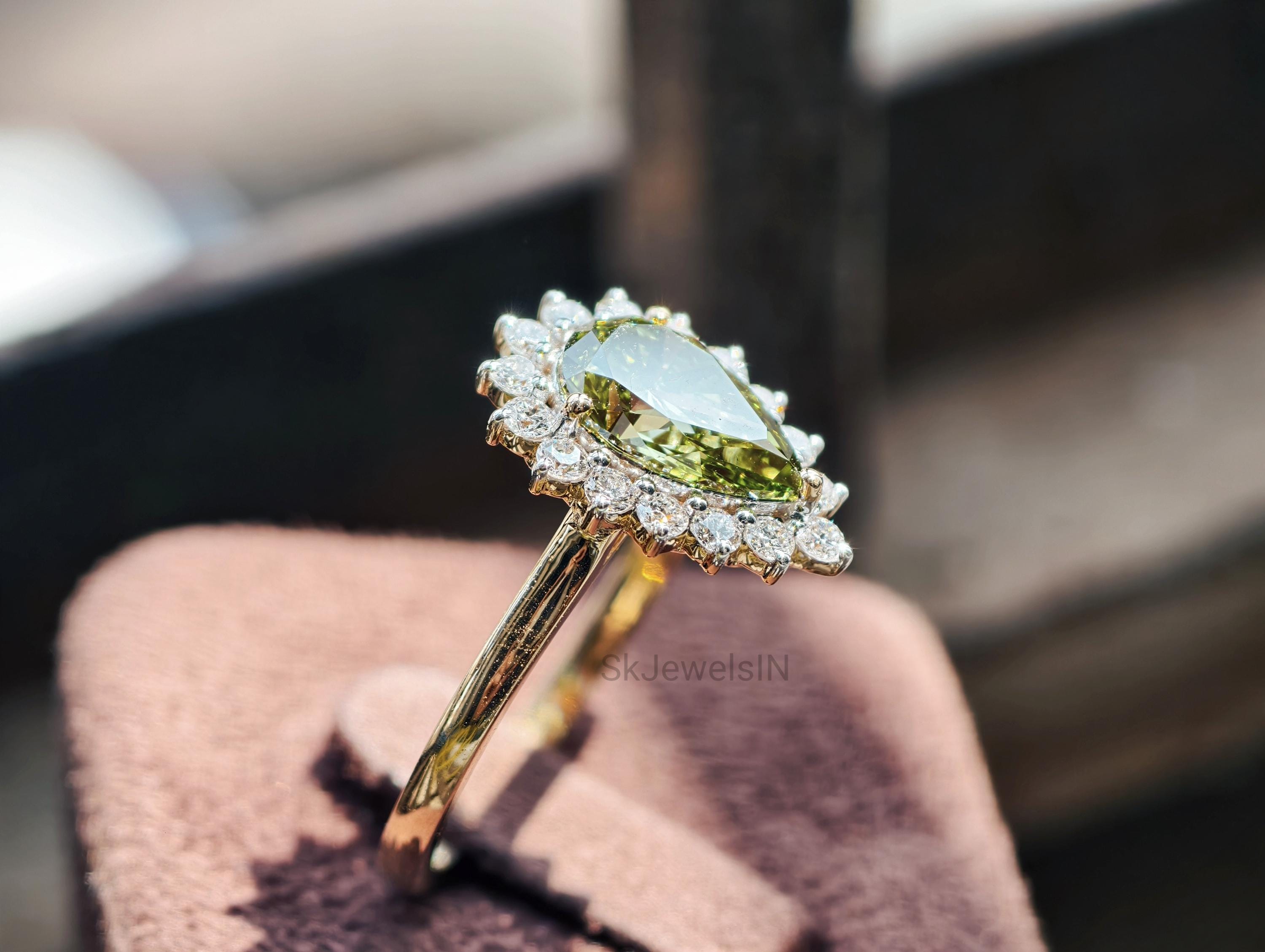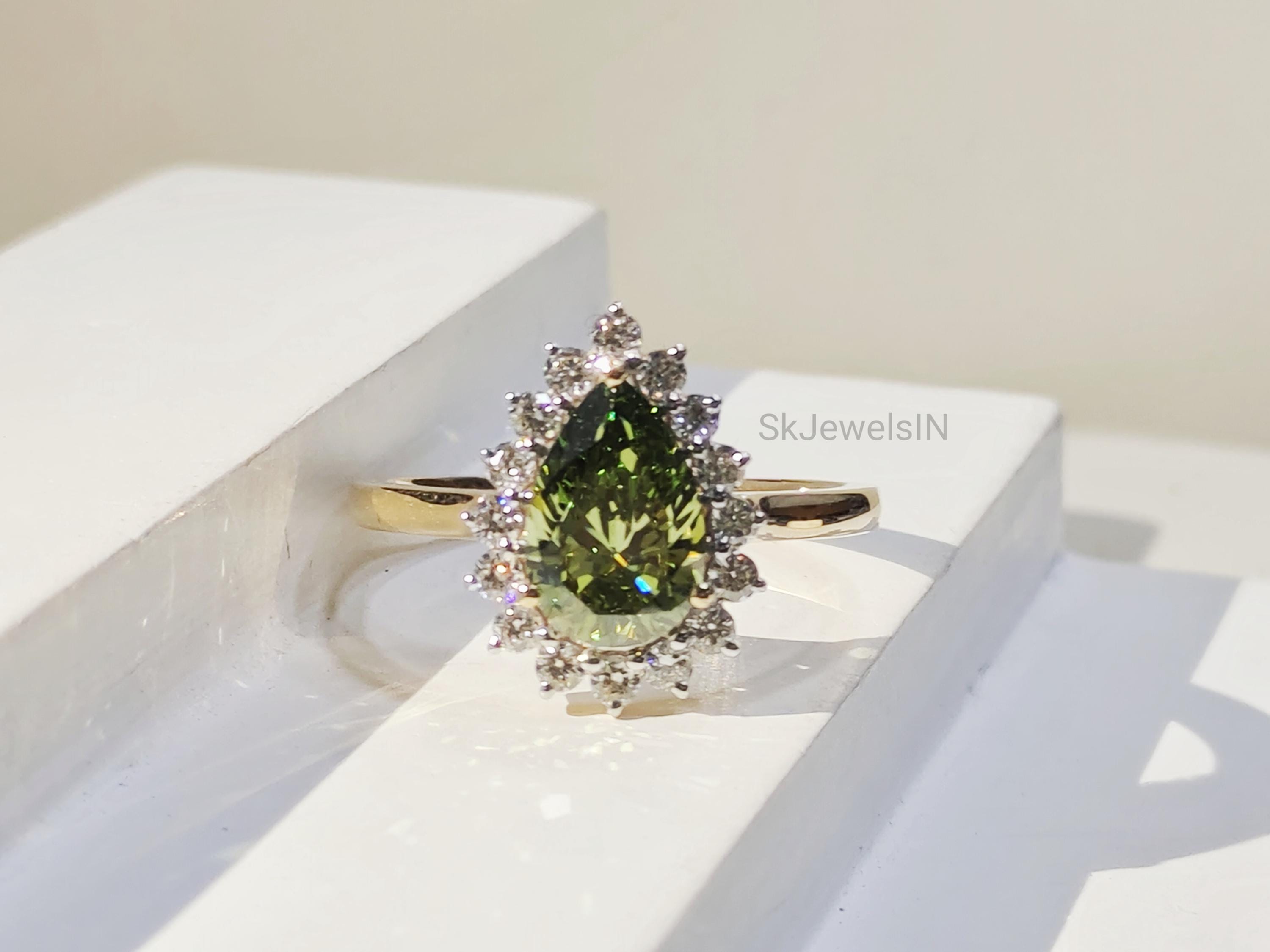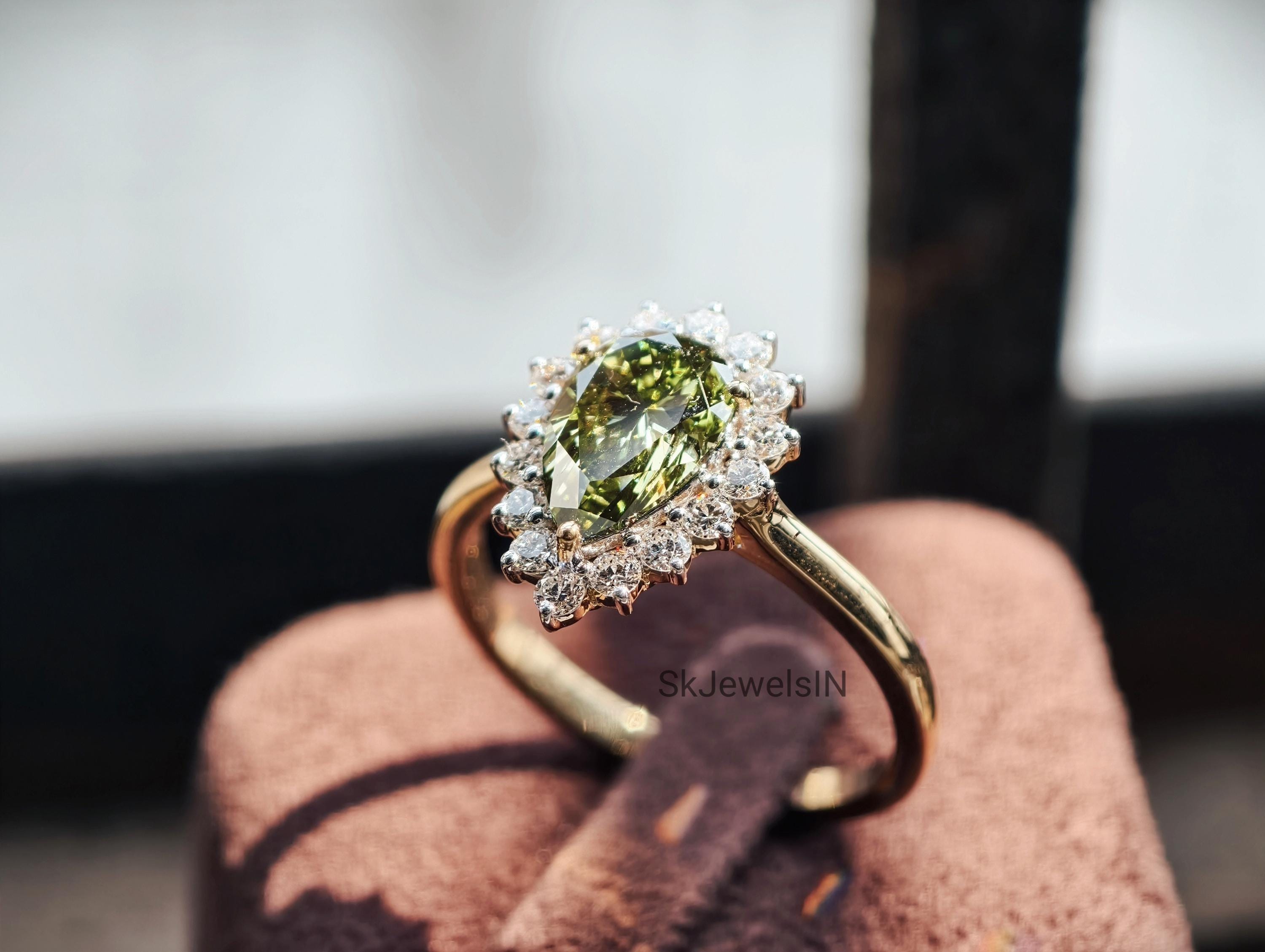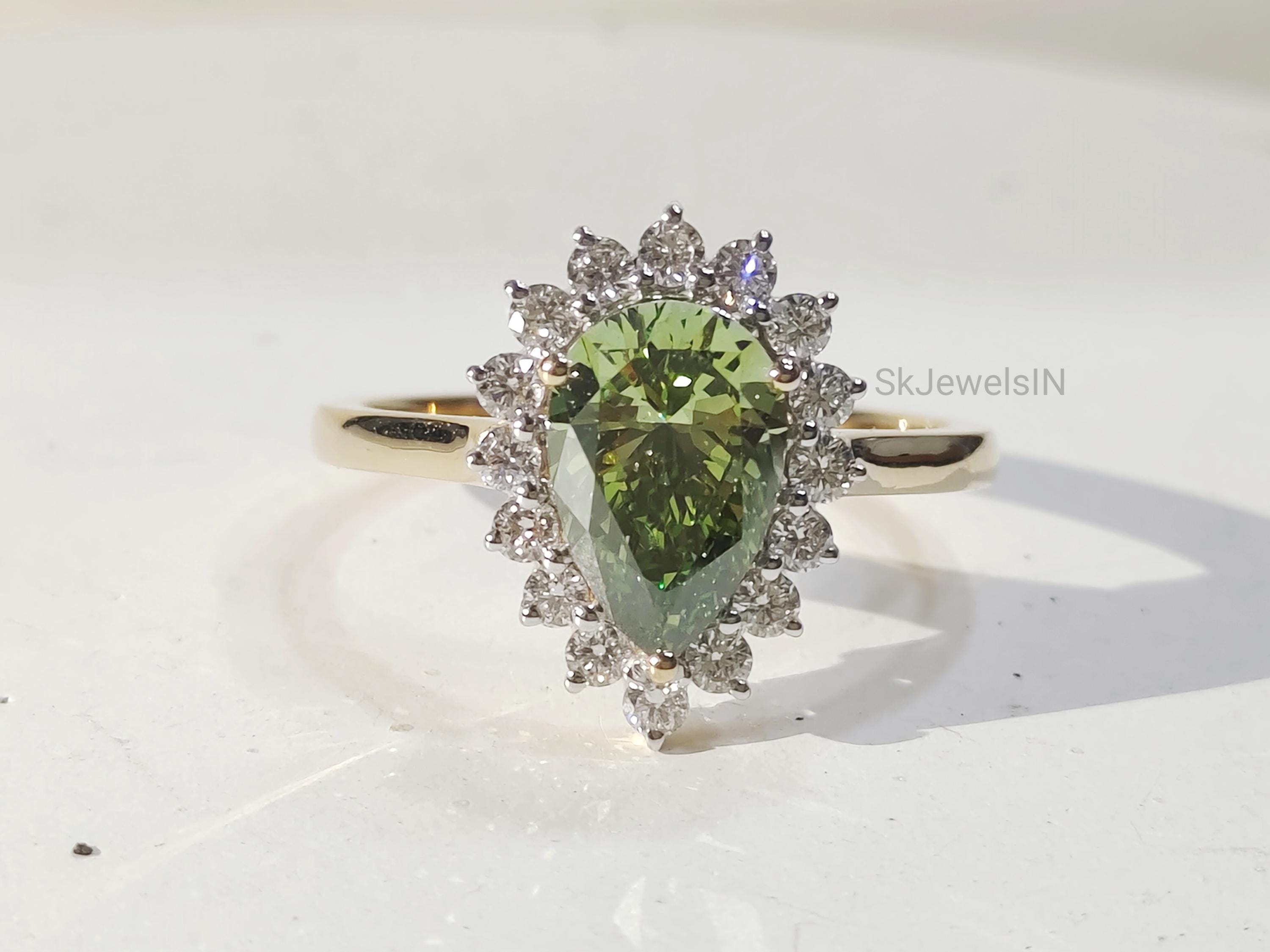 Pear Lab Grown Engagement Ring, 14K Gold Halo Diamond Wedding Ring, Handmade Green CVD Diamond Ring, Promise Ring For Women, Art deco ring