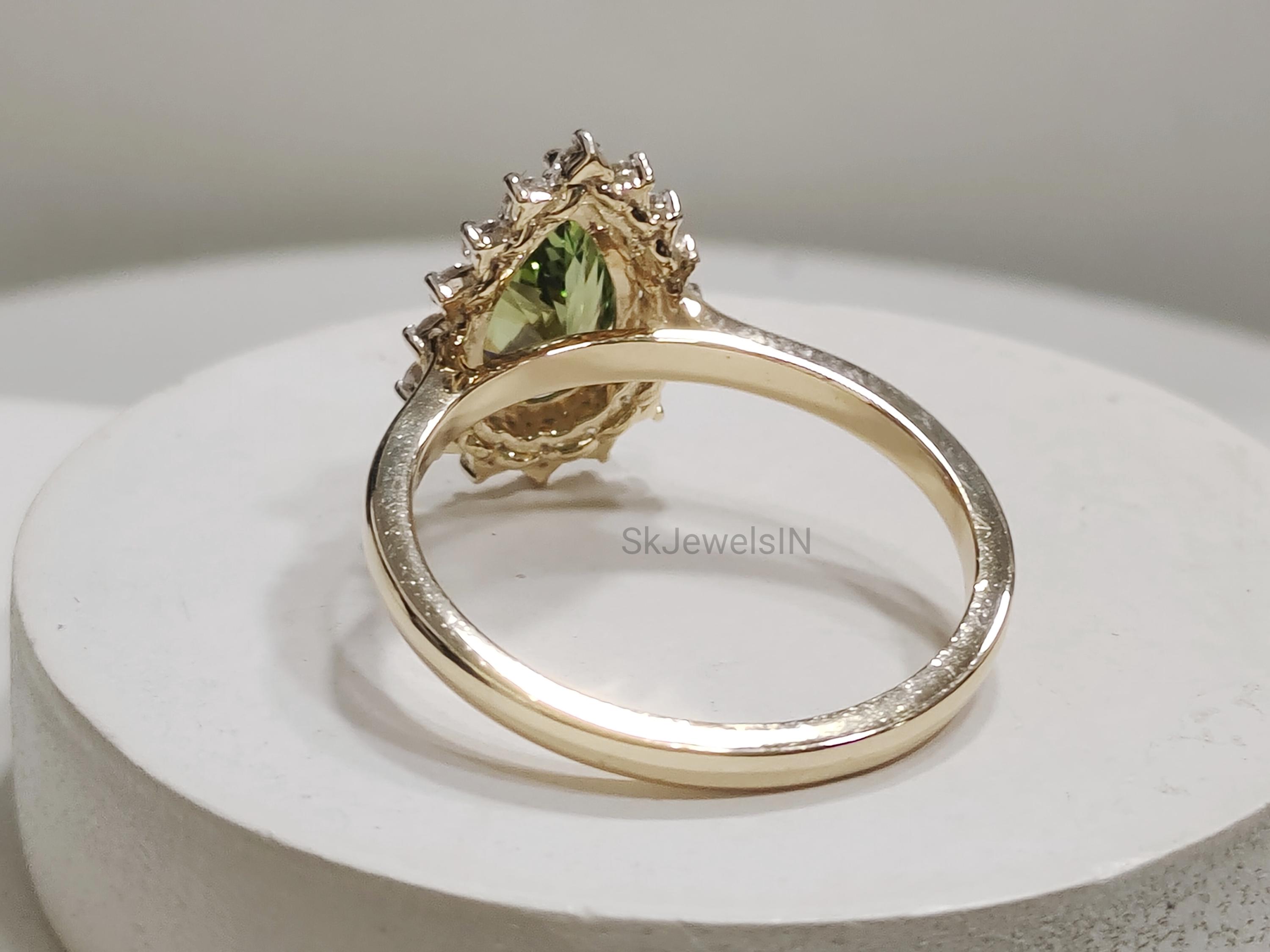 Green Pear Lab Grown Engagement Ring, 14K Gold Halo Diamond Wedding Ring, Handmade Promise Ring For Women, Art deco ring