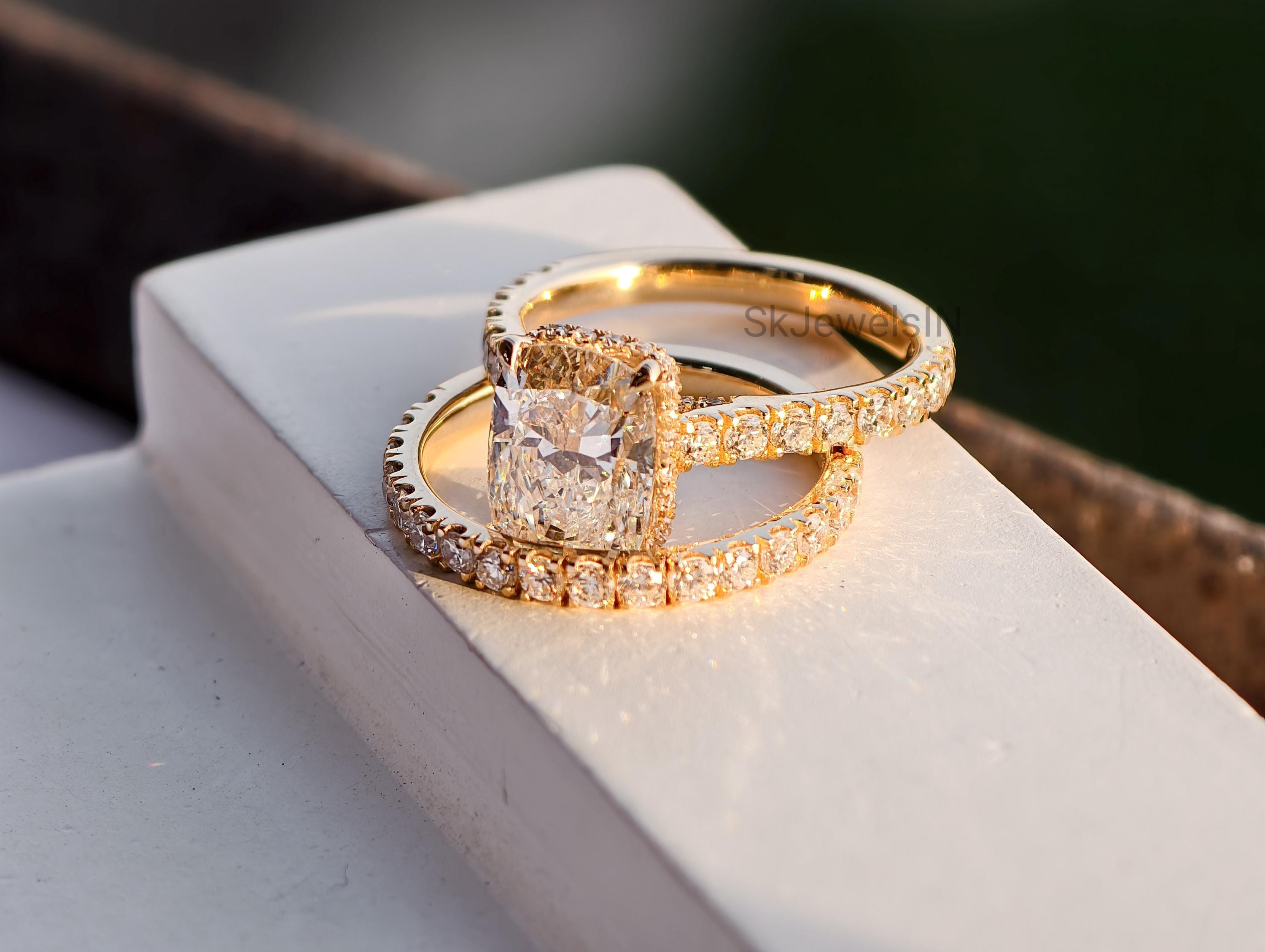 14K Gold Elongated Cushion Halo Engagement Ring With Pave Set Wedding Band, Unique Gold Promise Ring, Personalized gifts