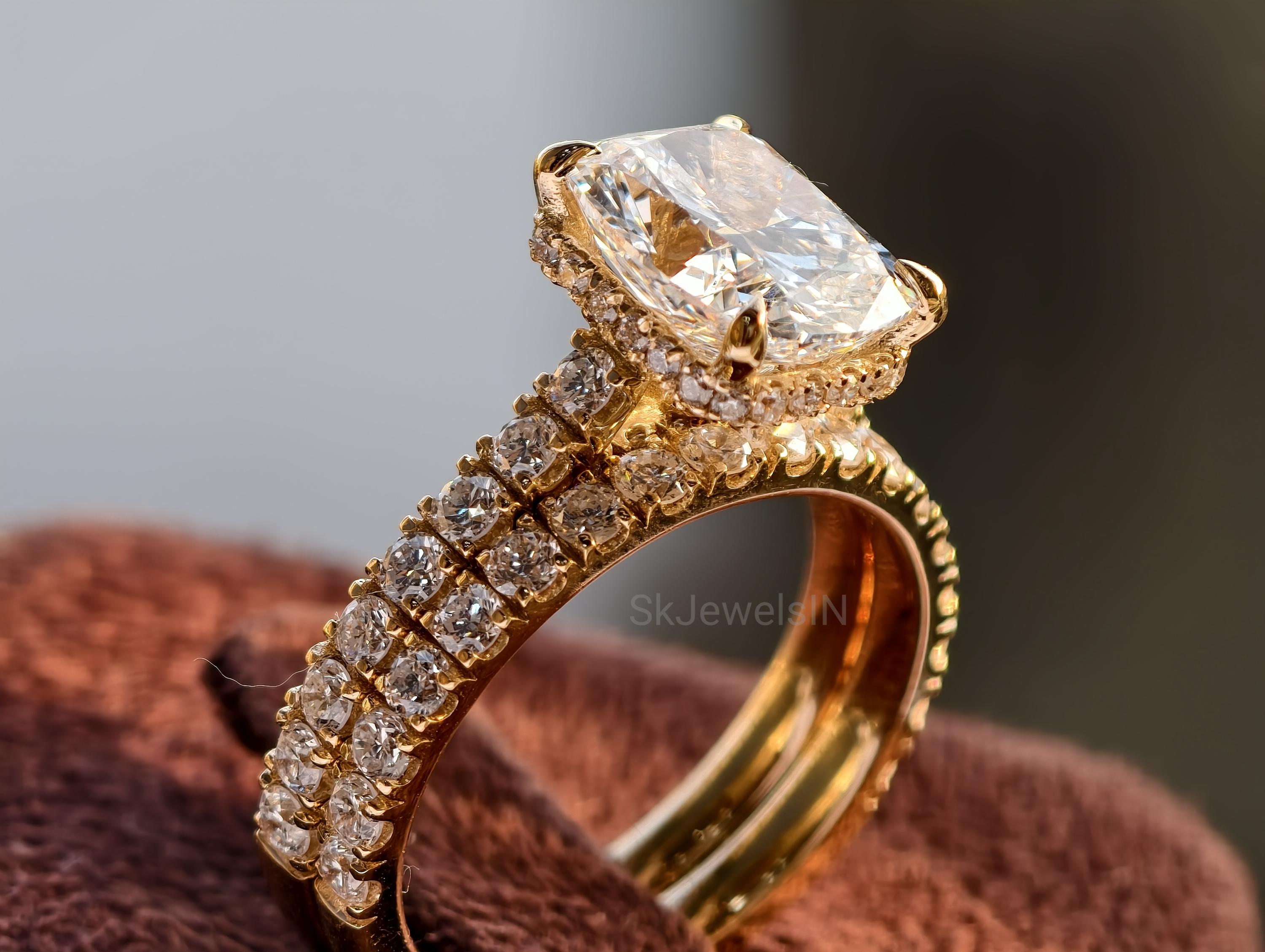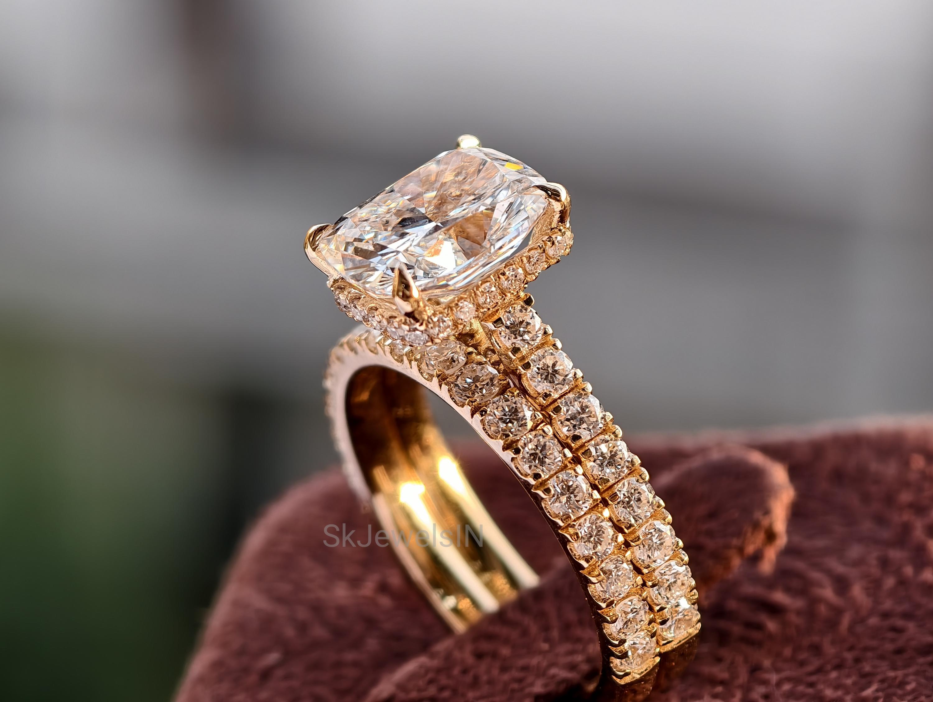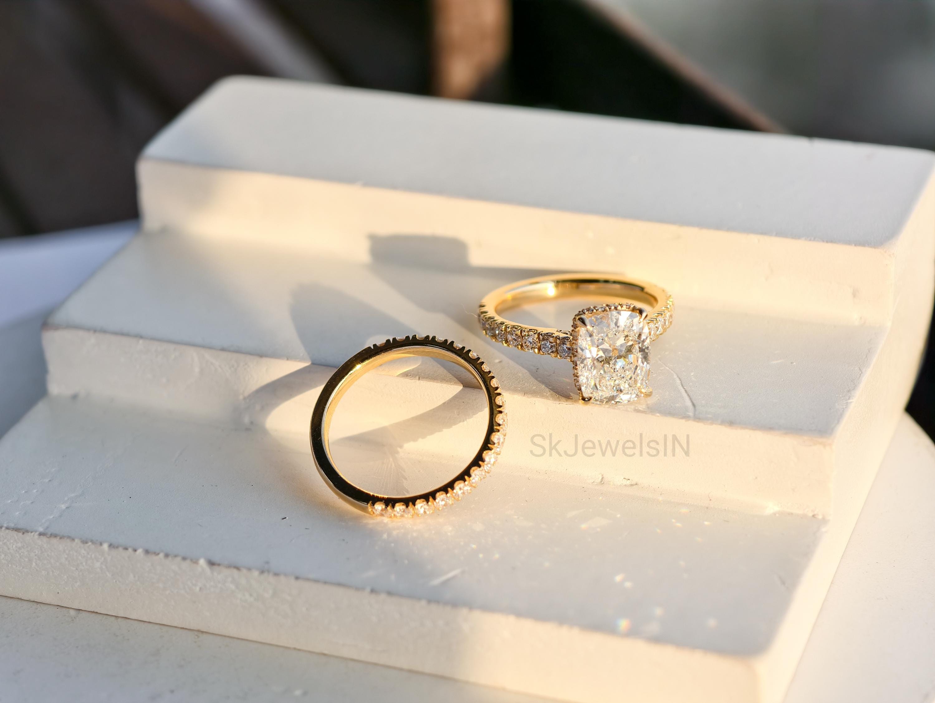 Cushion Cut Moissanite Engagement Ring, 14K Gold Wedding Ring, Hidden halo Gold Promise Ring, Personalized gifts, Art deco Vintage ring