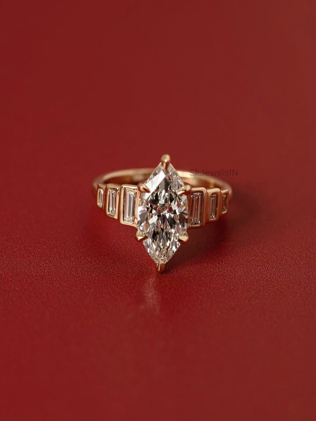 The ring features a spectacular Marquise-cut Moissanite center stone known for its exceptional fire and sparkle. What truly distinguishes this piece are the dramatic, architectural accents: a cascade of Stepped Baguette Moissanite/Diamond stones that perfectly frame the center, creating a bold, geometric, and unforgettable profile.