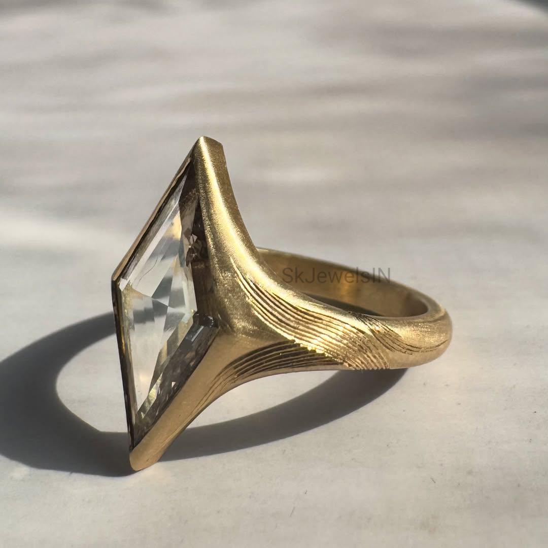 2CT Lozenge Cut Moissanite center secured in a sleek compass bezel setting. The 14k solid gold band features creating a statement of luxury and strength. Handcrafted in 925 Silver, 10K, or 14K Gold (Yellow, Rose, or White), this unique hand crafted design blends modern artistry with timeless elegance. A perfect engagement ring, anniversary gift for her, wedding ring, promise ring, gift for woman or statement ring for someone who loves bold and unique jewelry.