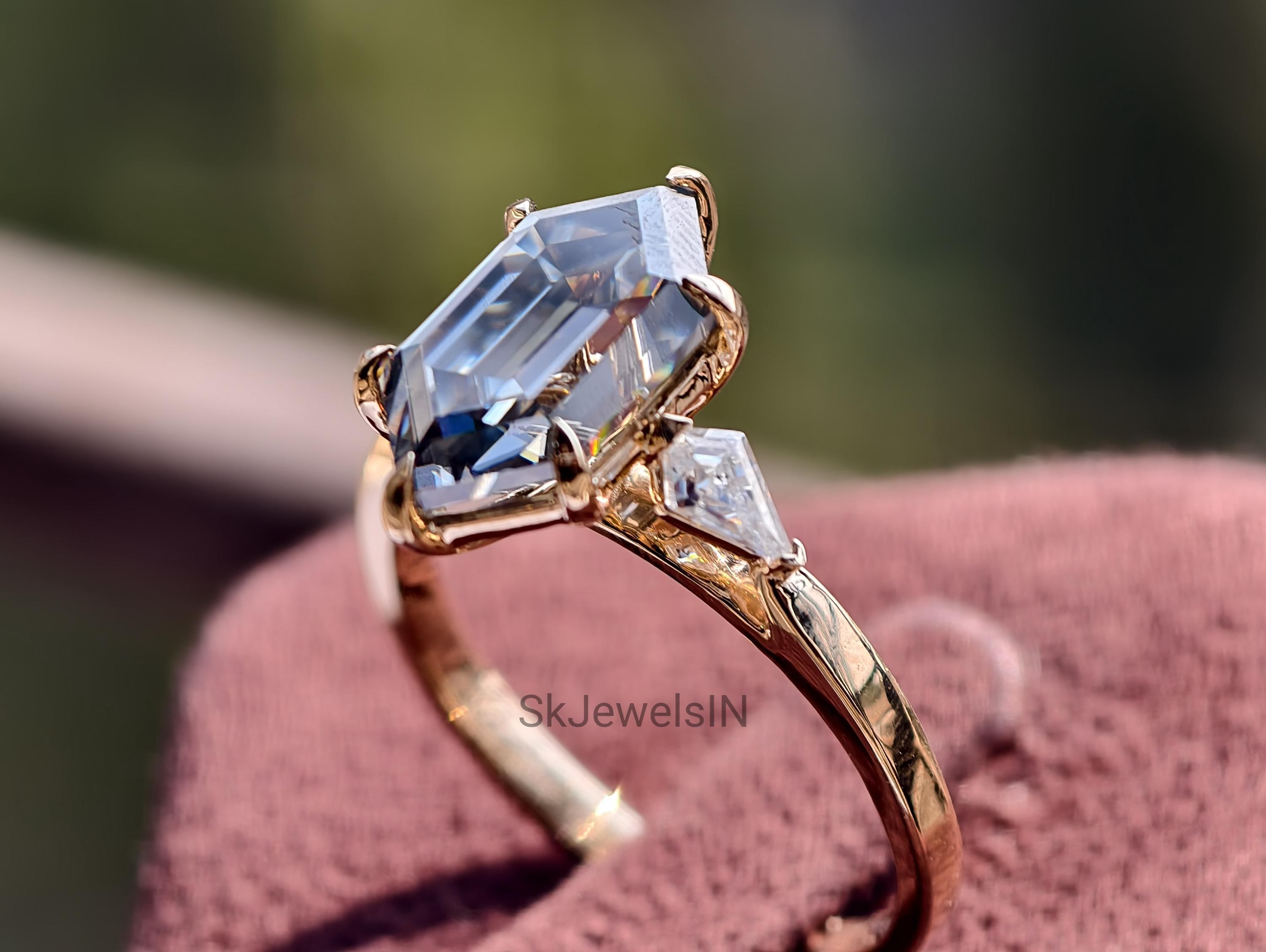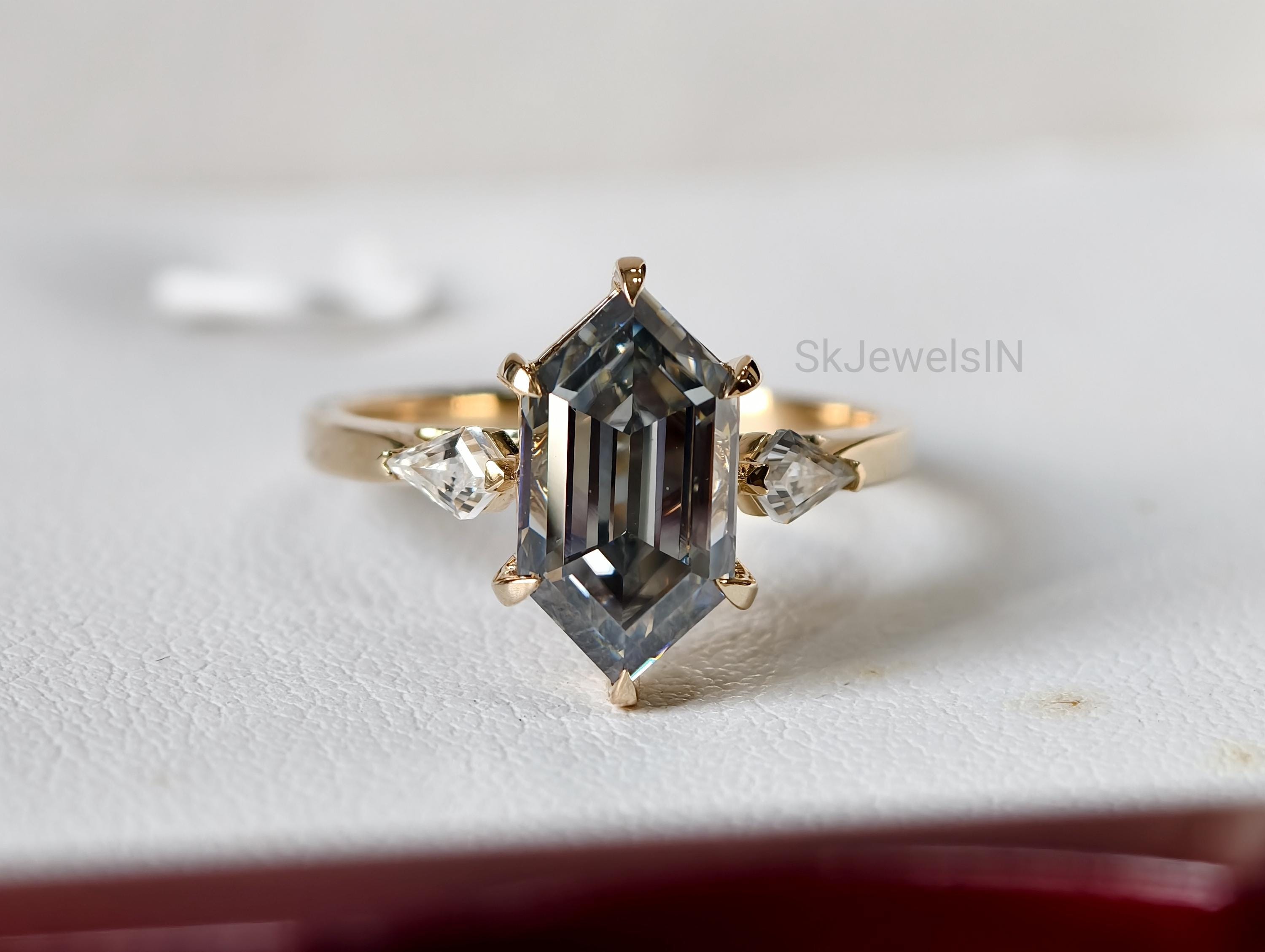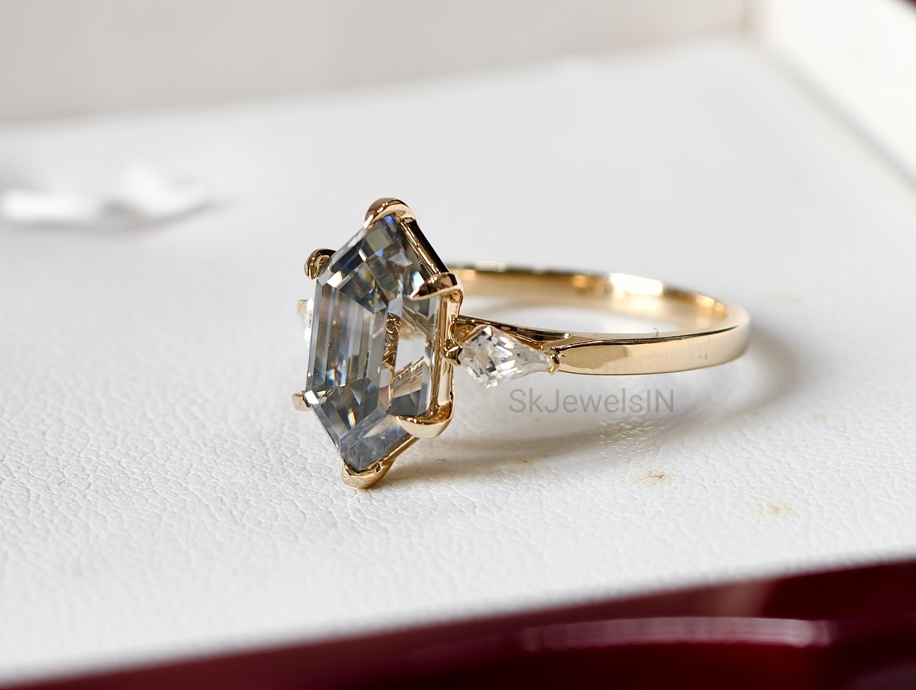 Grey Moissanite Dutch Marquise Engagement Ring 2 CT Elongated Hexagon Step Cut Ring 14k Gold 3 Stone Kite Wedding Ring Art Deco Promise Ring