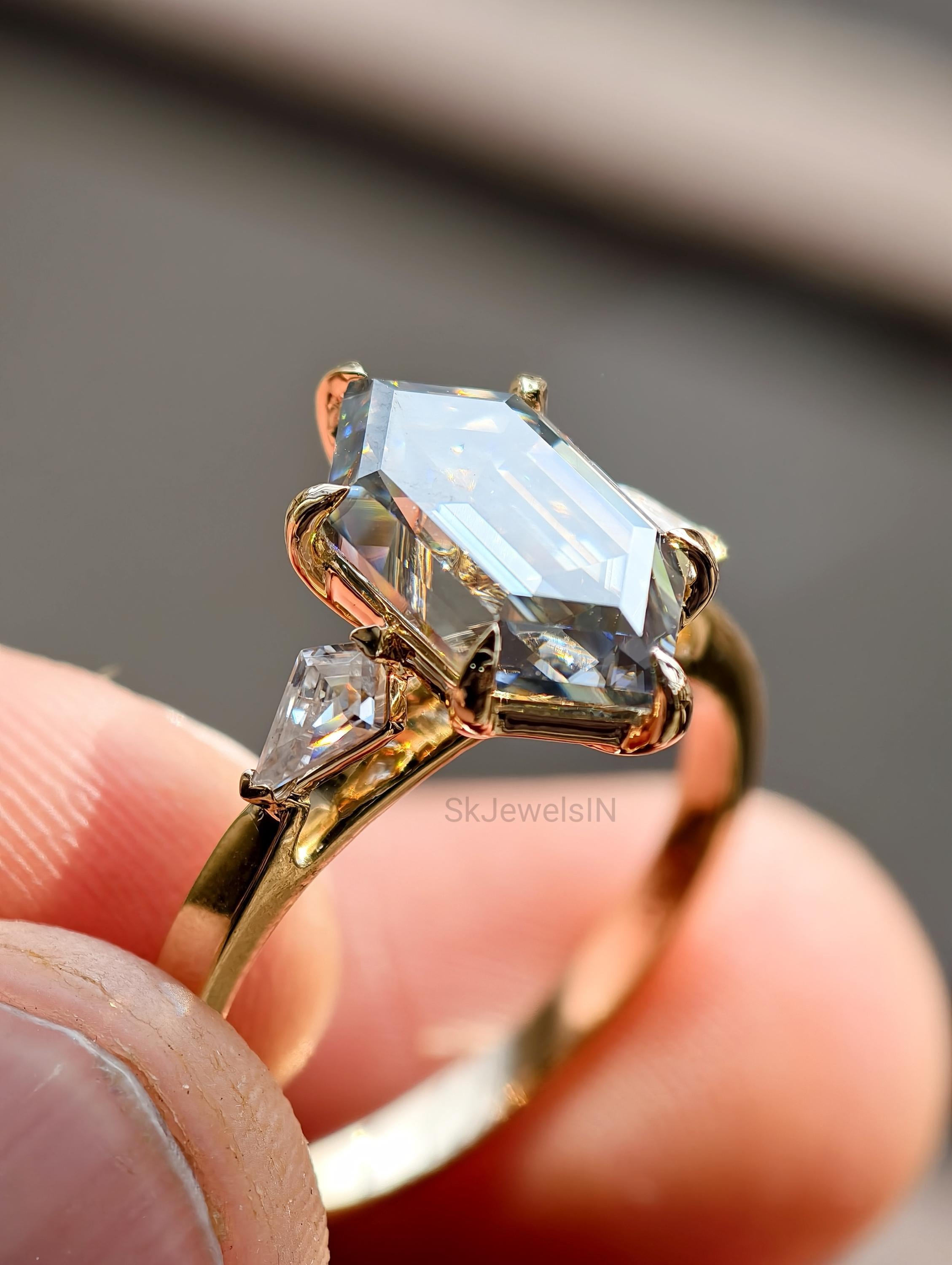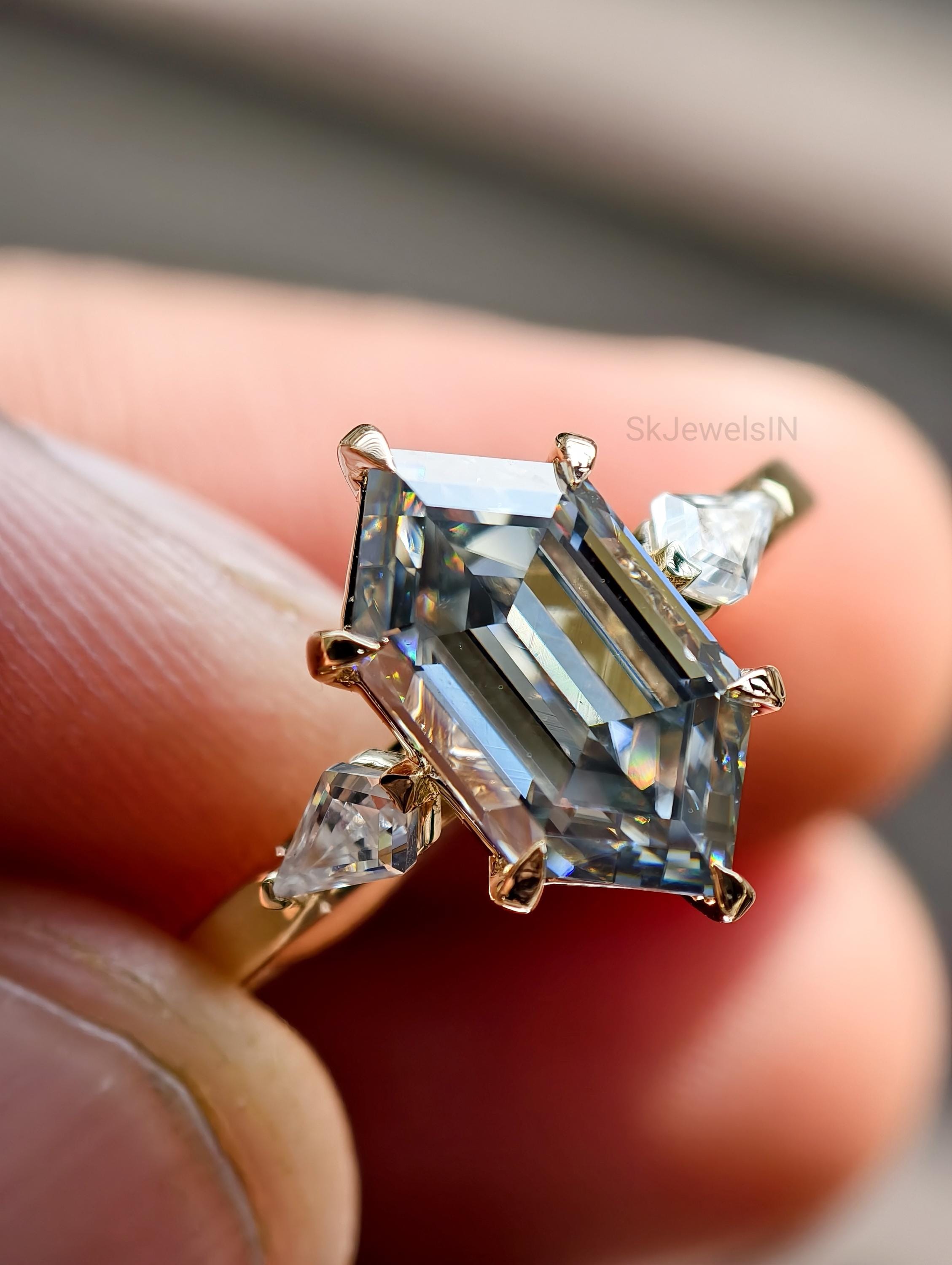✨ Item Overview Embrace the allure of modern geometry with this breathtaking Grey Moissanite Dutch Marquise ring. Featuring a rare and sophisticated "Dutch Marquise" center stone—known for its elongated hexagonal shape and mesmerizing step-cut faceting—this ring is a true conversation starter. Flanked by sparkling kite-shaped side stones, the design creates a perfect balance of Art Deco charm and contemporary elegance.