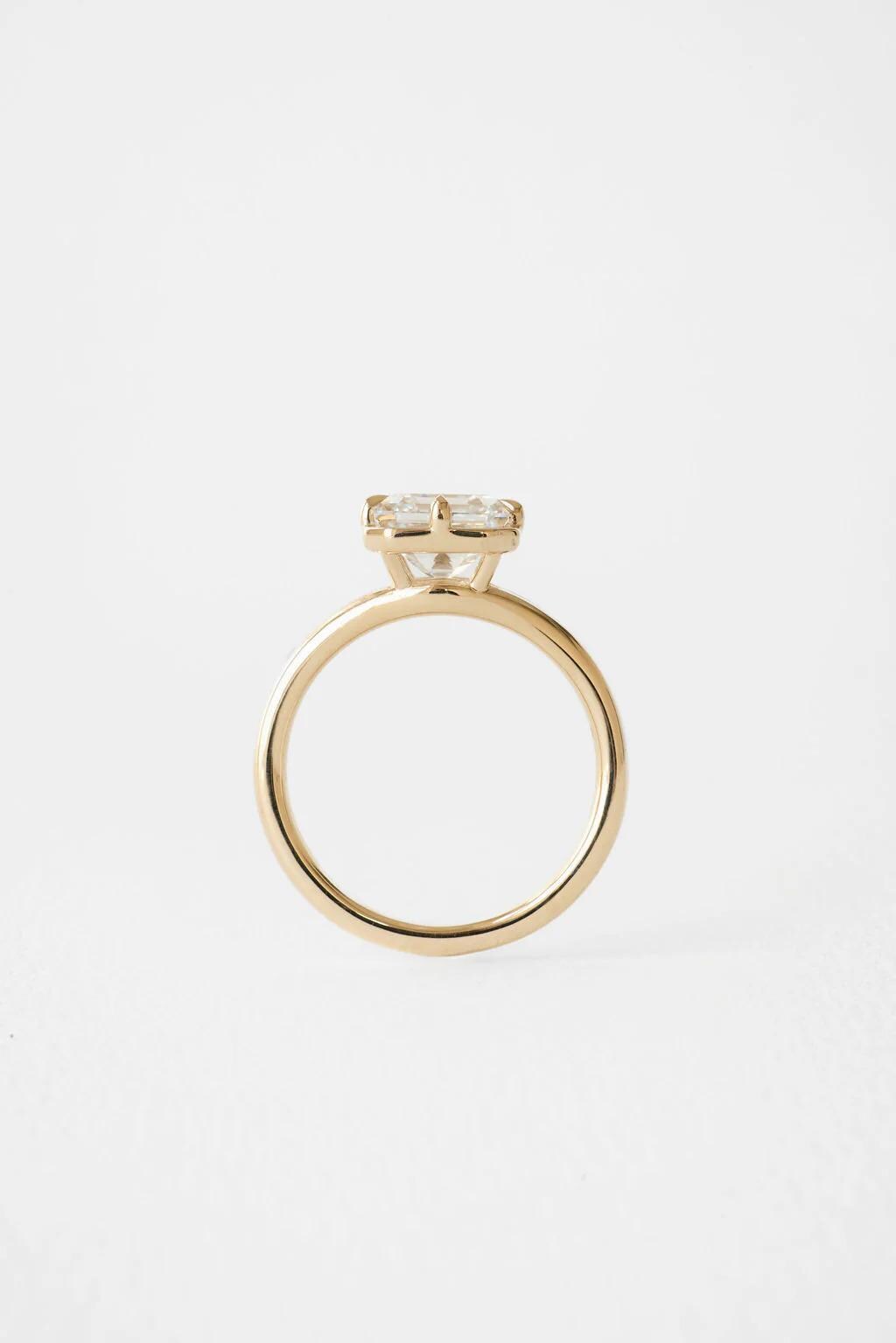 The band features a graceful split shank design, where the gold divides gently as it meets the center stone, adding structural interest and a delicate, airy feel to the ring. Whether you are looking for the perfect eco-friendly engagement ring, a stunning anniversary gift, or a luxurious promise ring, this piece offers the sparkle of a diamond with an ethical, sustainable touch.