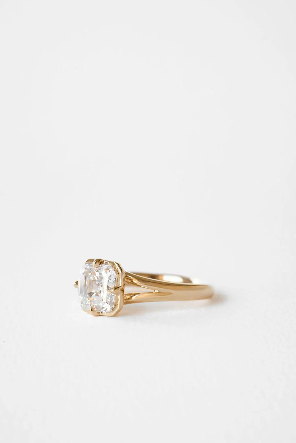 Designed for the modern romantic, this ring features a mesmerizing Asscher cut Moissanite center stone, known for its deep, "hall-of-mirrors" step-cut faceting that draws the eye inward. The stone is cradled in a unique, vintage-inspired octagonal setting that highlights its geometric beauty.
