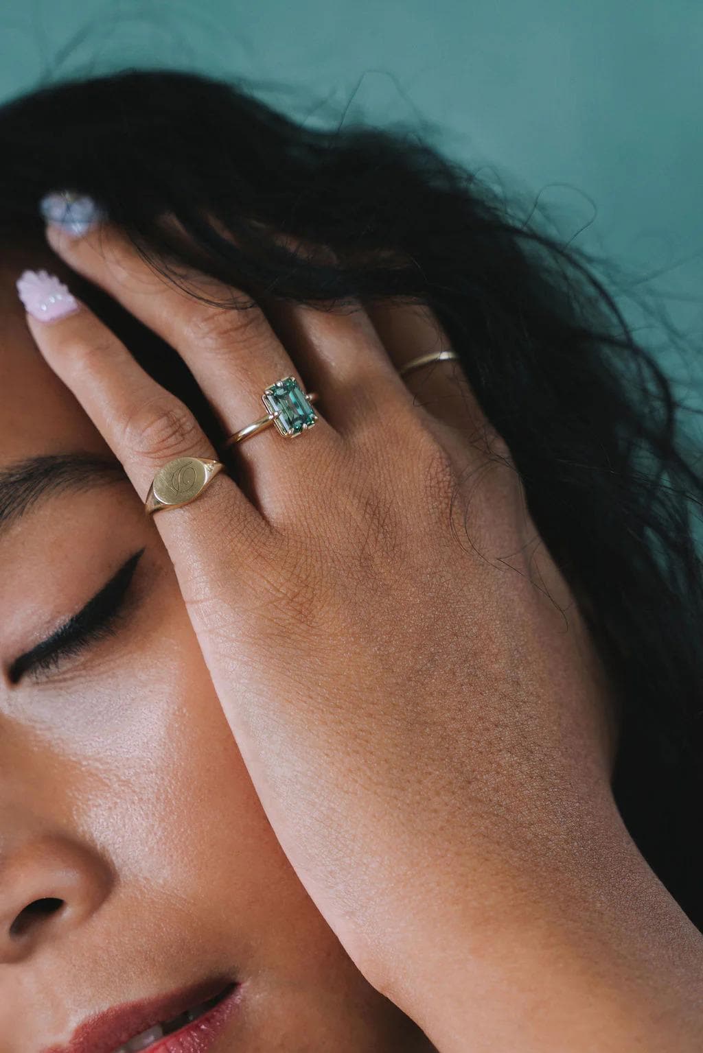 Distinctive and sophisticated, this ring features a stunning Emerald Cut Green Moissanite center stone. The emerald cut’s long, step-cut facets create a "hall of mirrors" effect that draws the eye deep into the stone, highlighting its rich, vibrant green/teal hue.